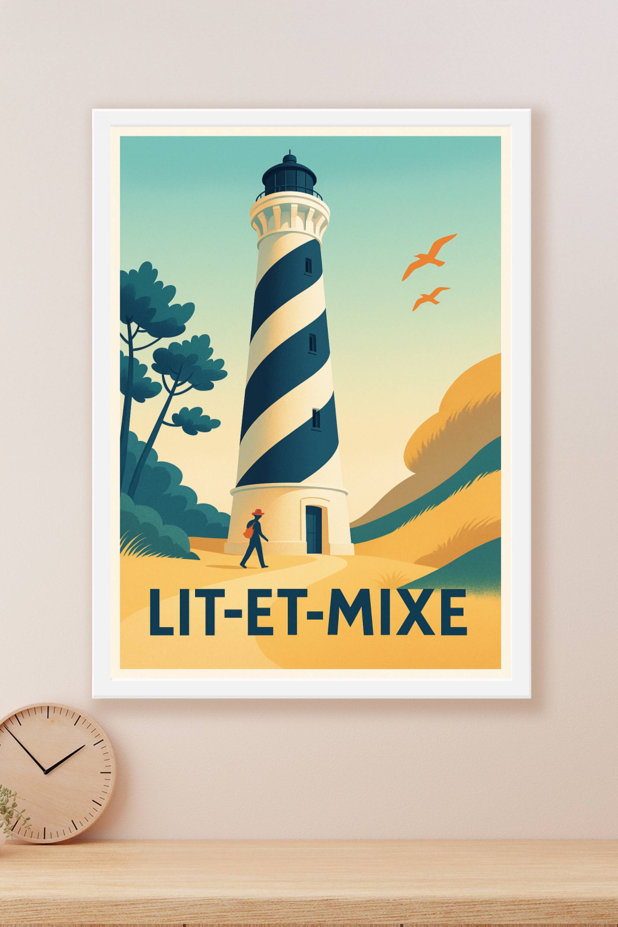 Découvrez la sérénité de Lit-et-Mixe avec cette affiche représentant son célèbre phare, symbole d'aventure et de quiétude au bord de l'océan. Ce po...