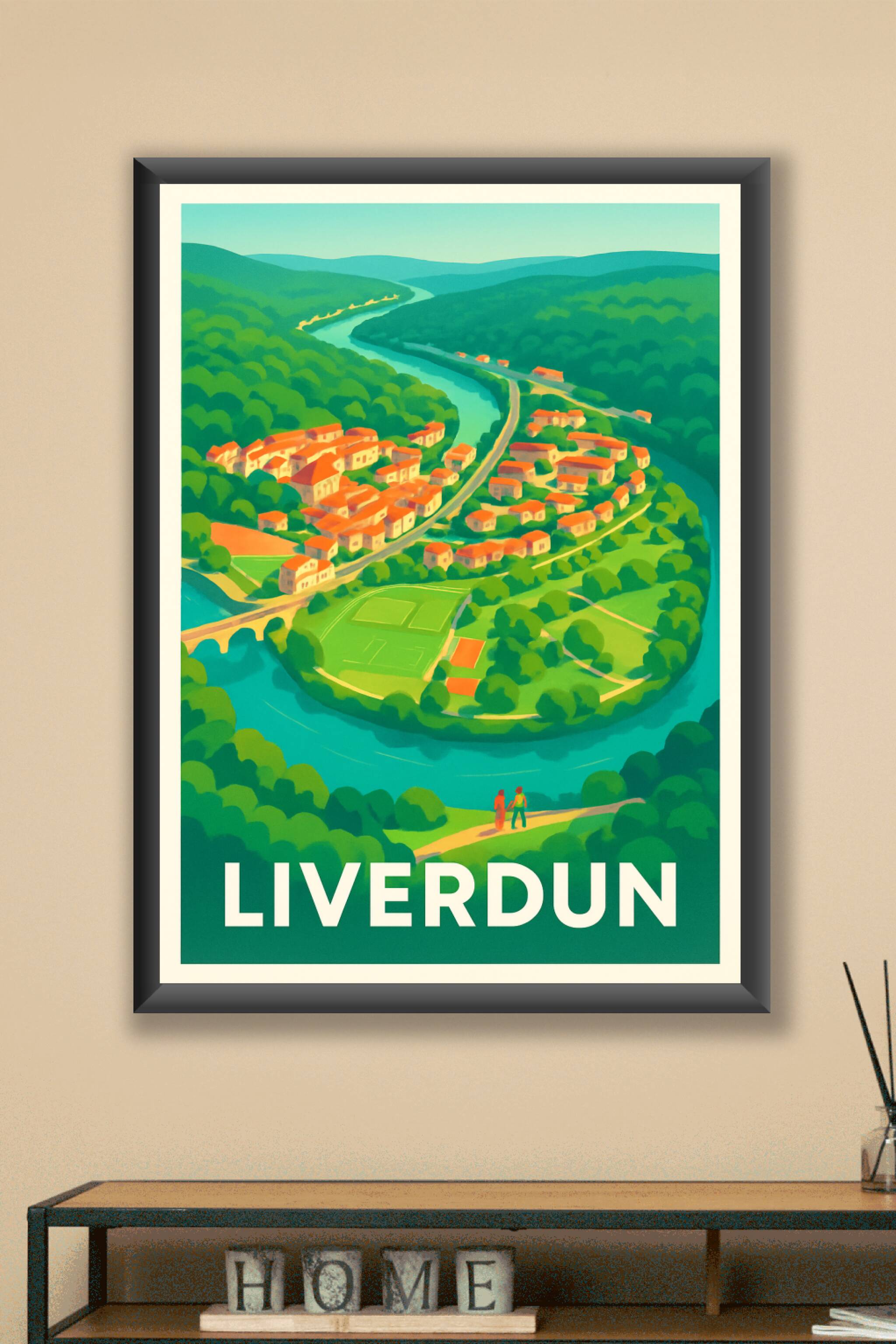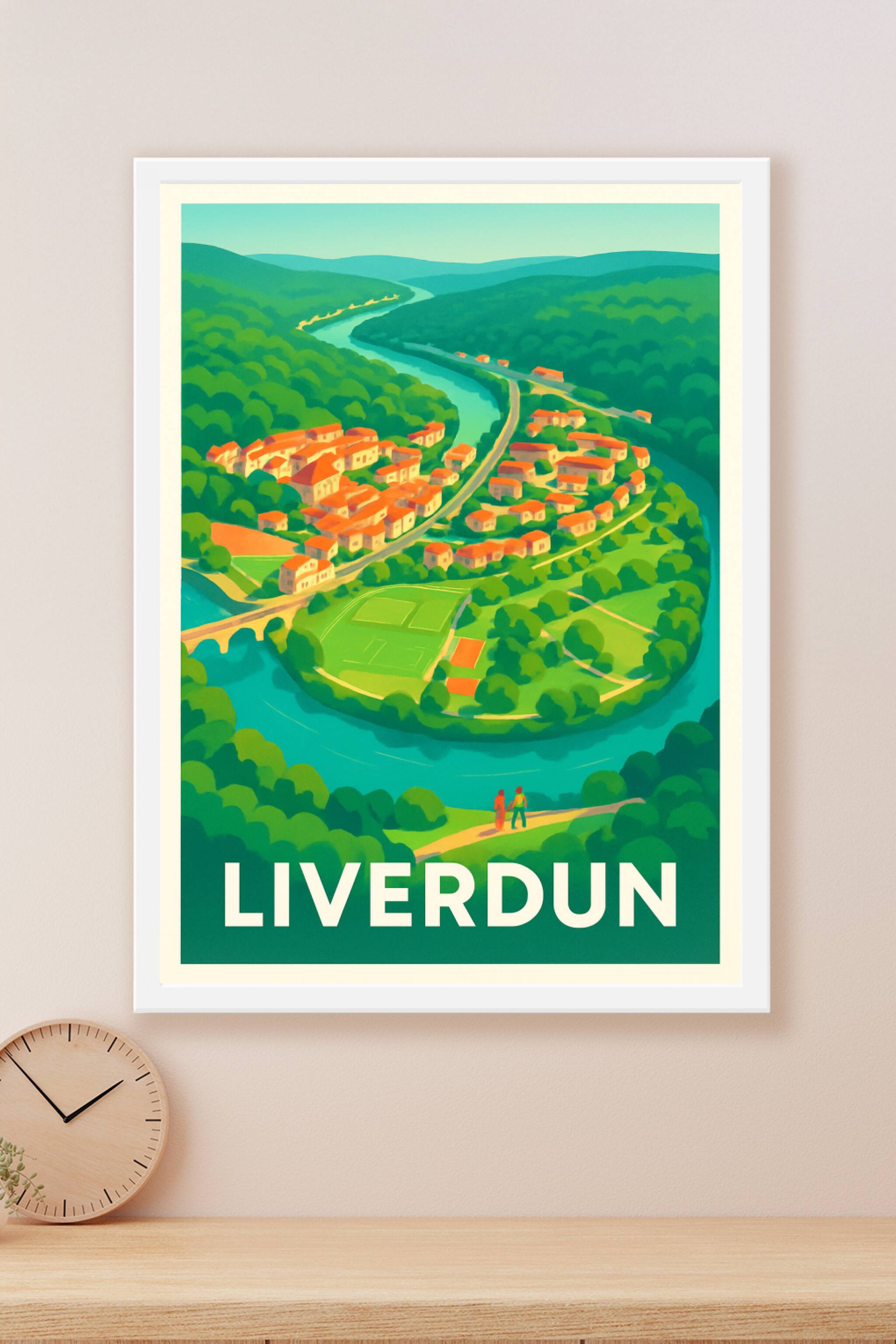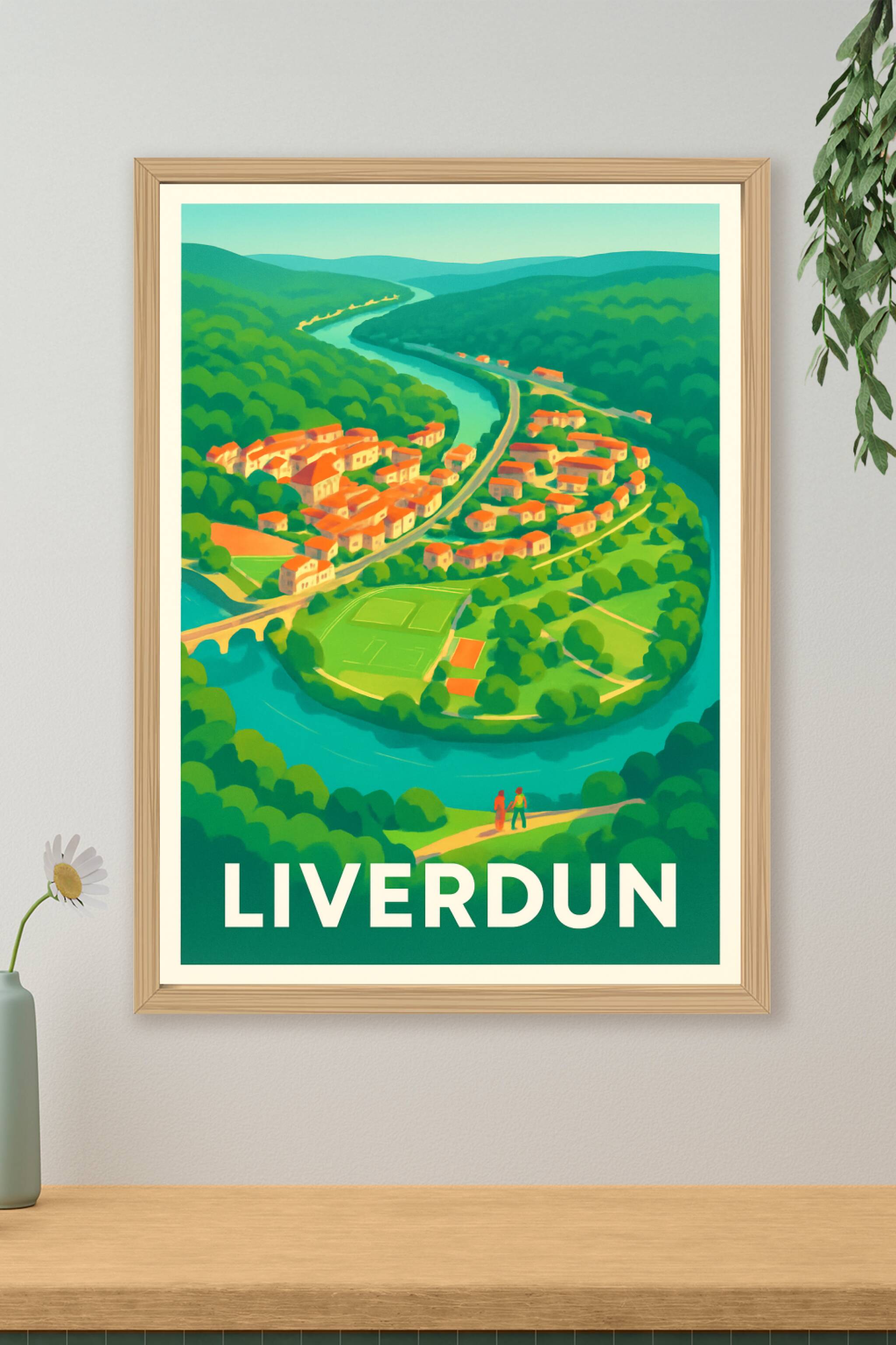Découvrez Liverdun, ce havre de paix niché au cœur des paysages verdoyants de la Moselle, immortalisé dans cette affiche au style rétro et chaleure...