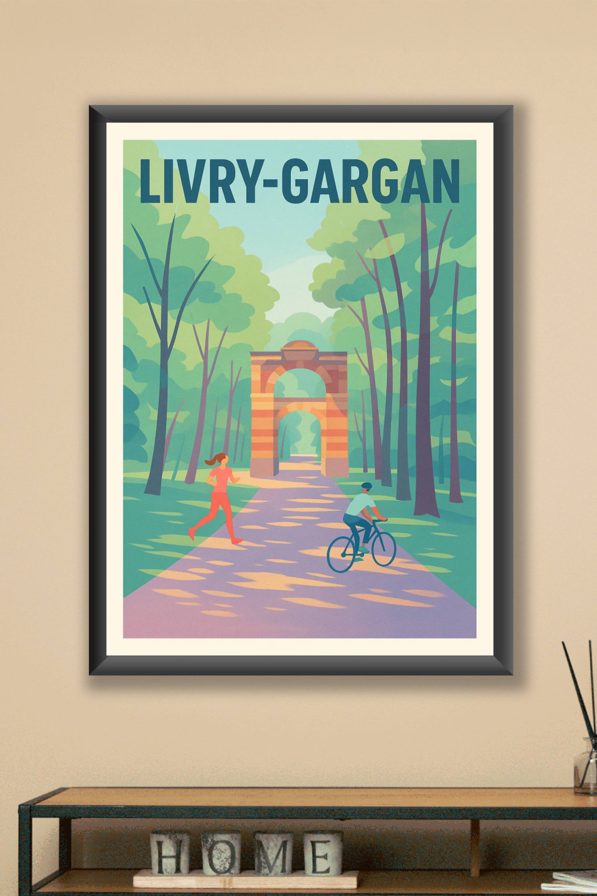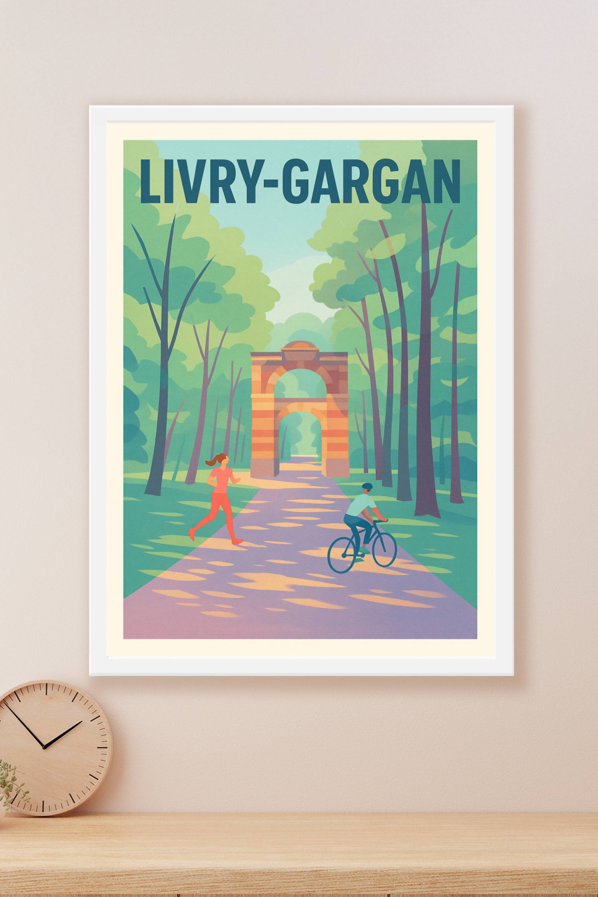 Découvrez la quiétude et la beauté naturelle de Livry-Gargan avec cette affiche illustrée aux couleurs douces et apaisantes. Représentant une prome...