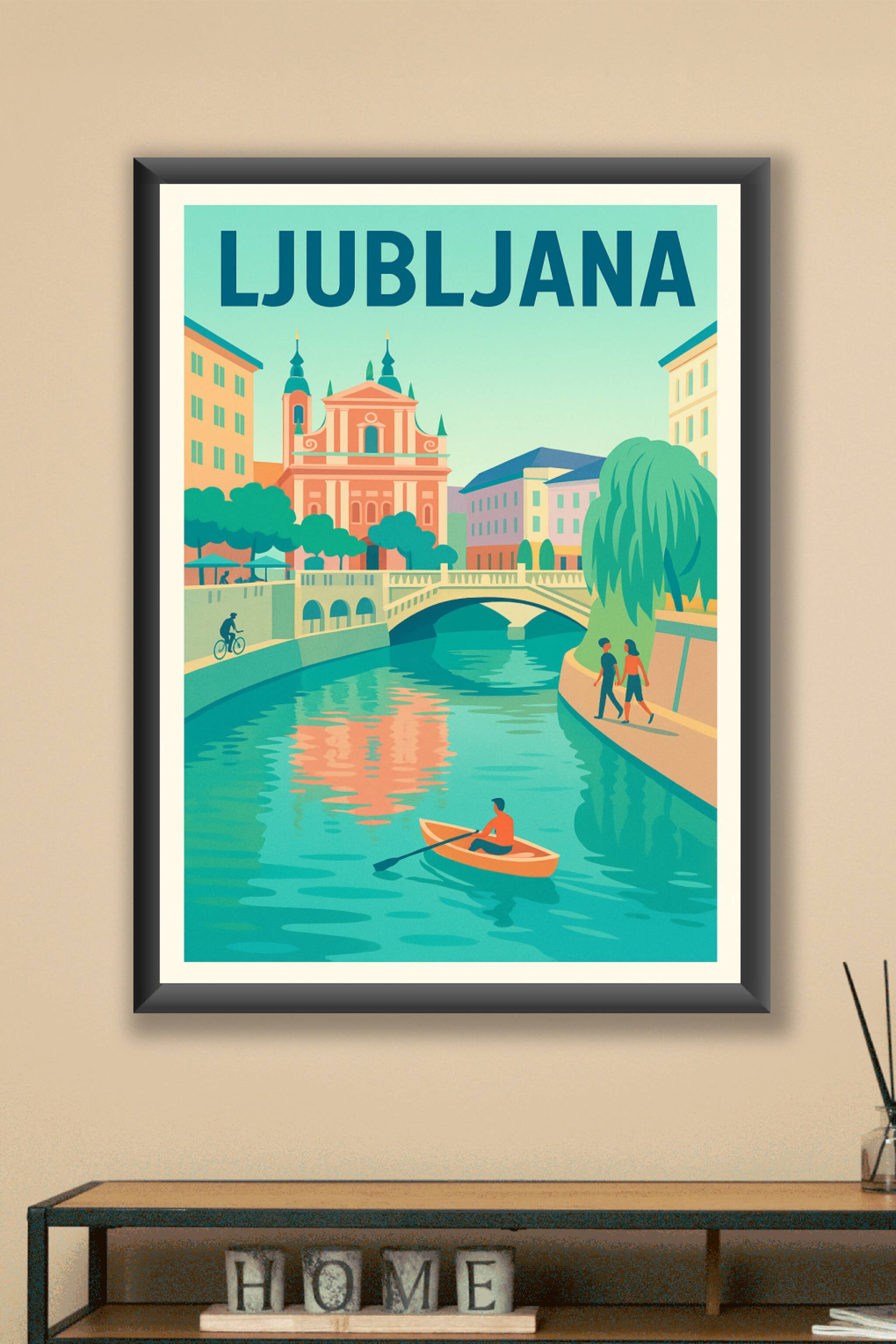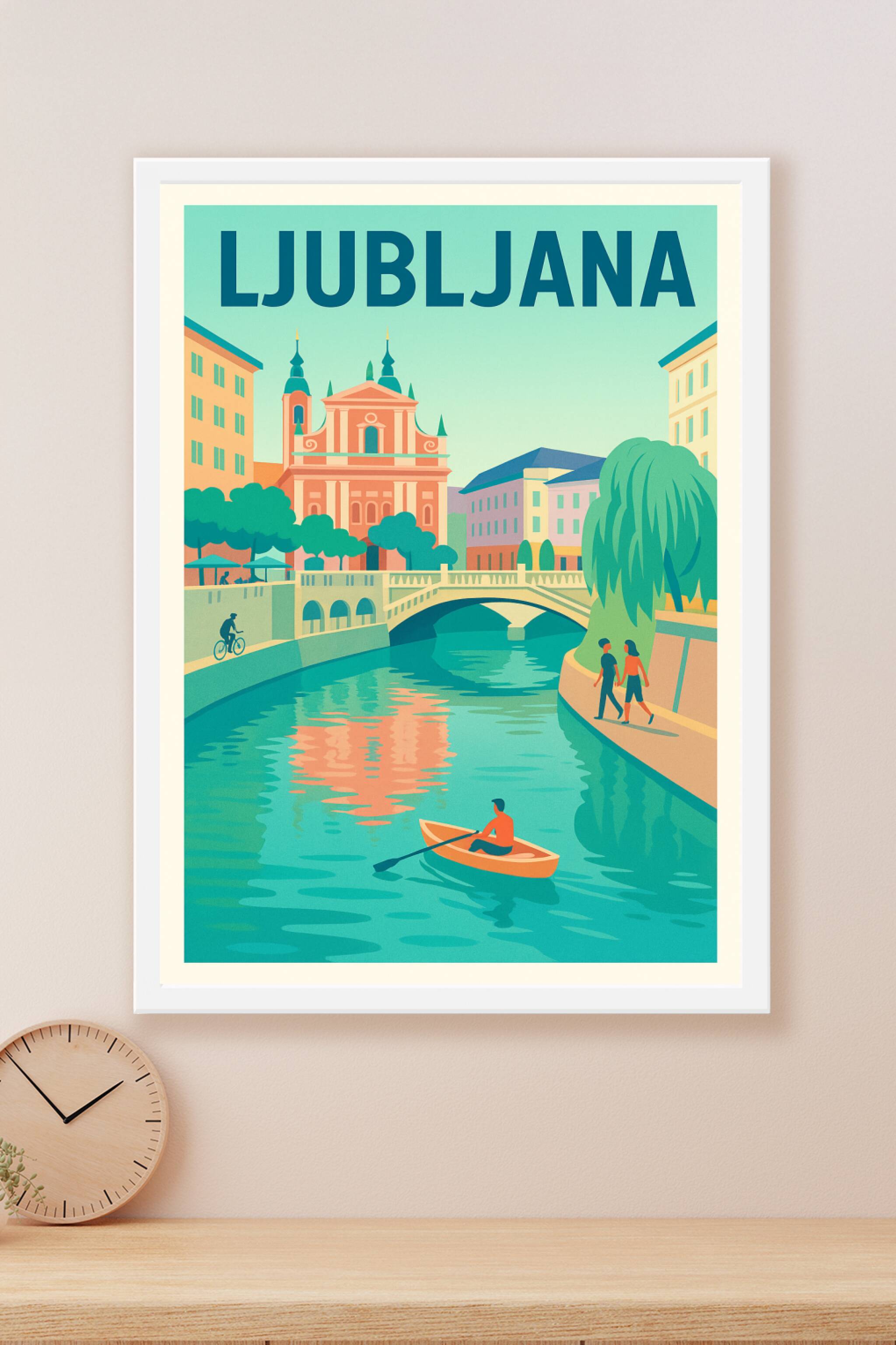 Découvrez l'atmosphère paisible et pittoresque de Ljubljana avec cette affiche illustrée qui met en lumière ses ponts emblématiques et ses façades ...