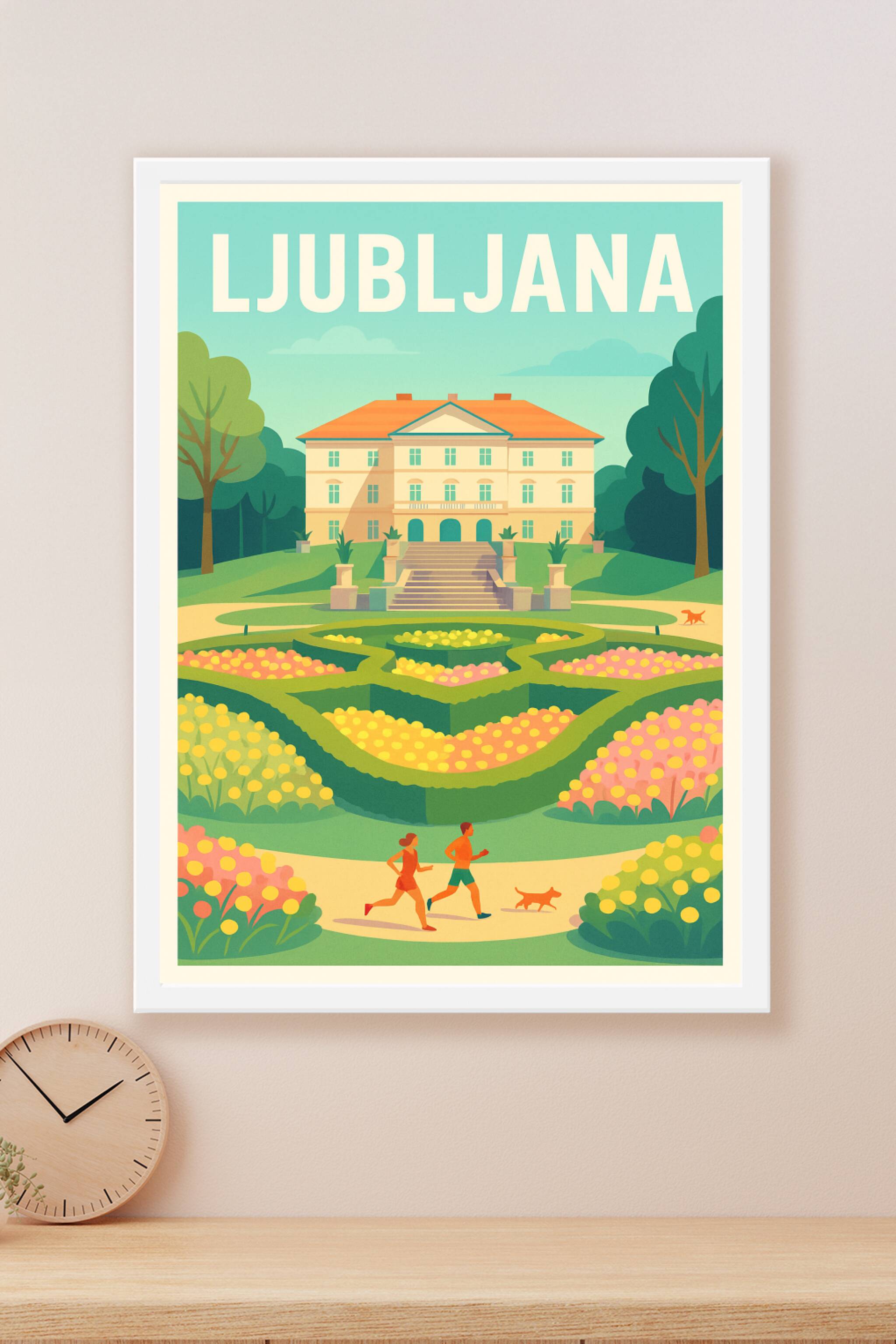 Découvrez la douceur et la sérénité de Ljubljana avec cette affiche lumineuse illustrant un jardin fleuri et une demeure élégante en toile de fond....