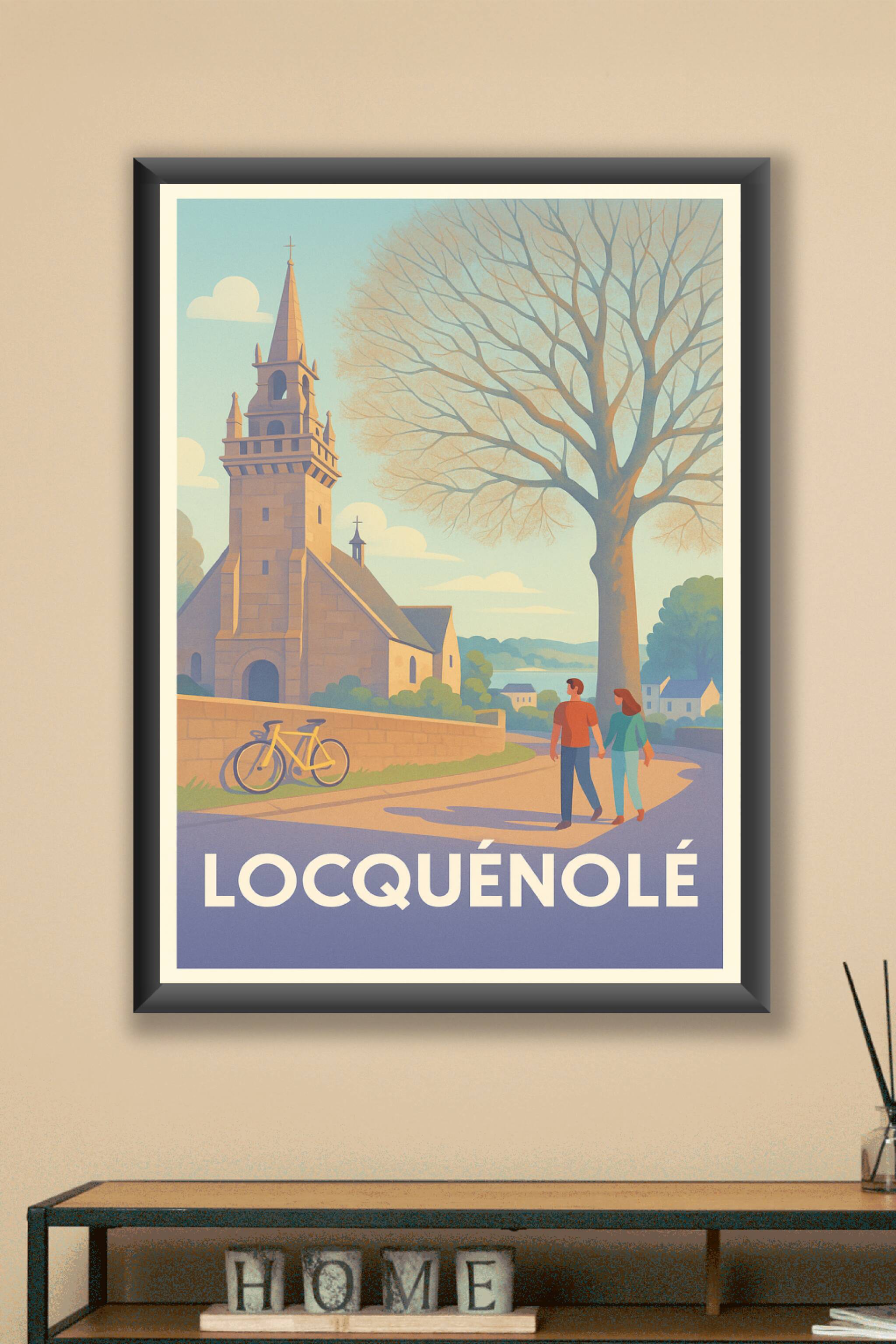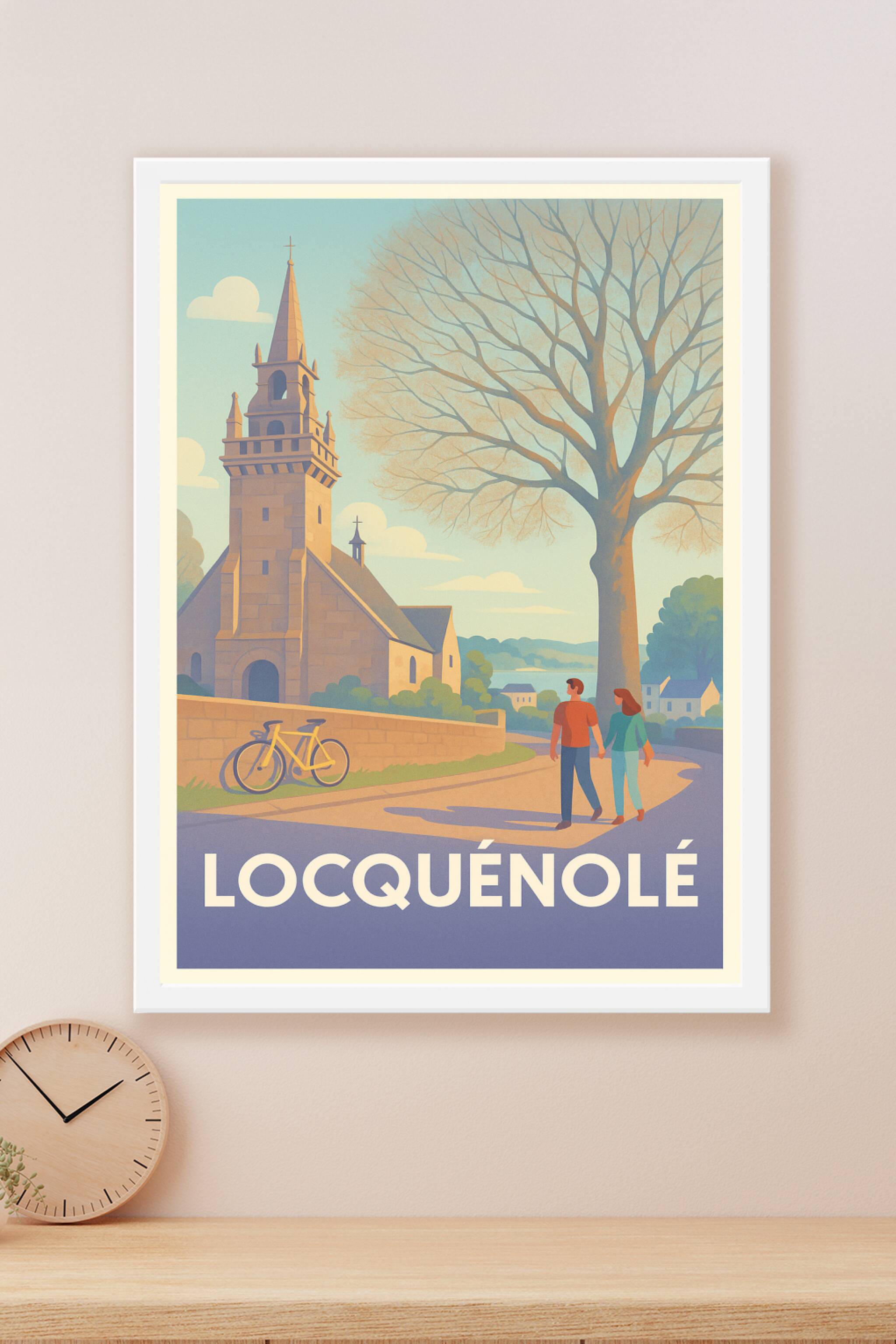 Découvrez cette superbe affiche illustrée mettant en scène le village paisible de Locquénolé, avec son église emblématique et ses paysages bucoliqu...