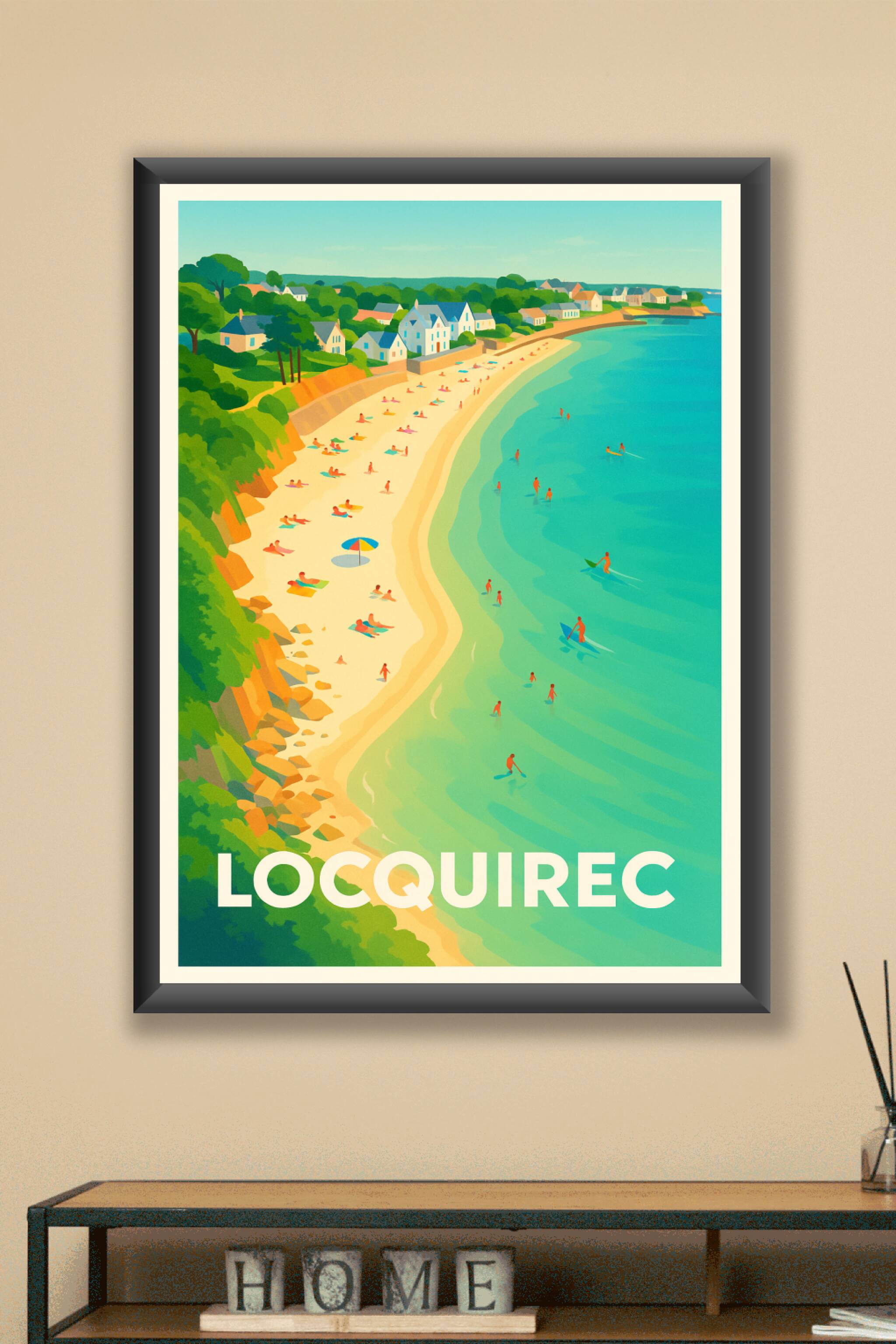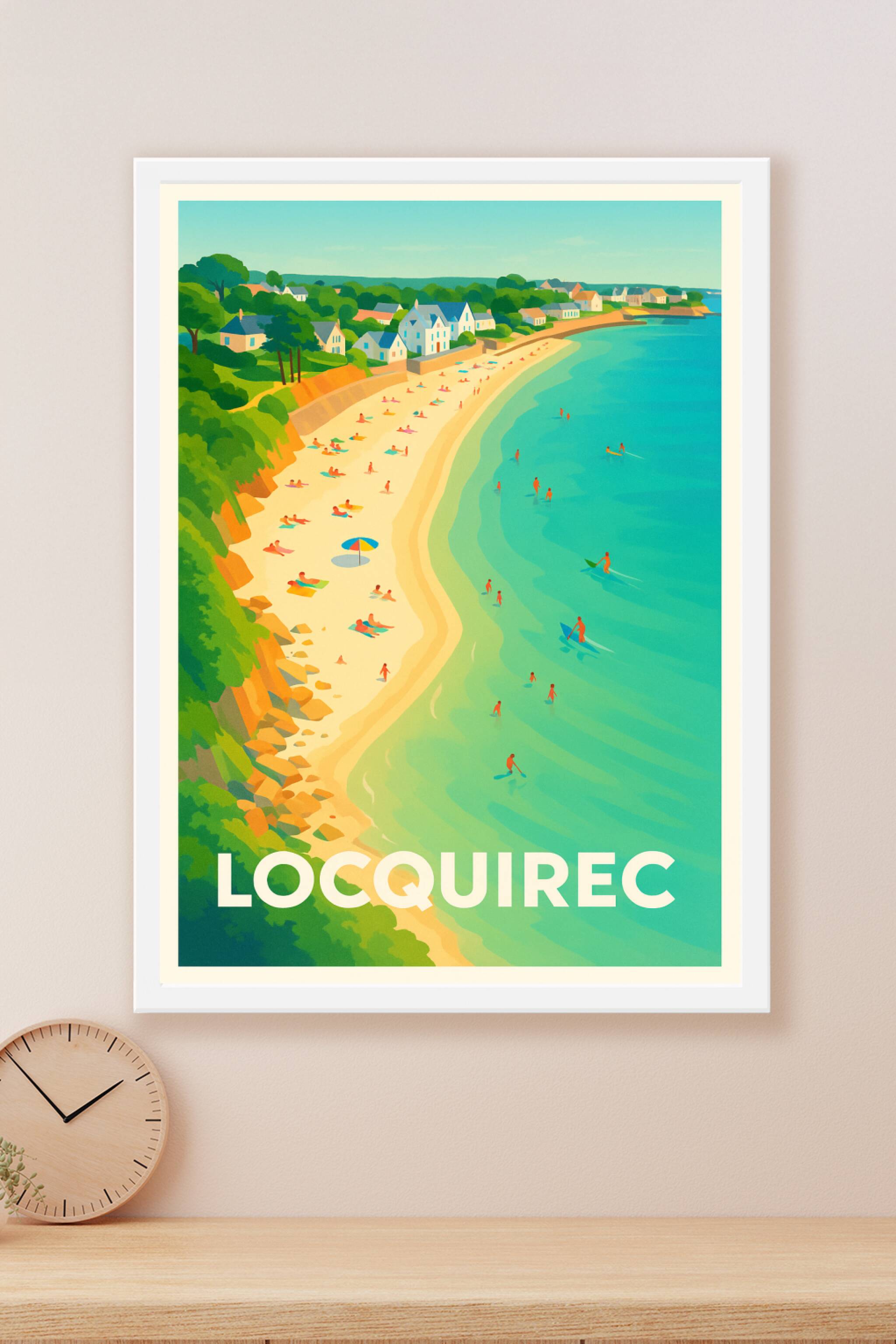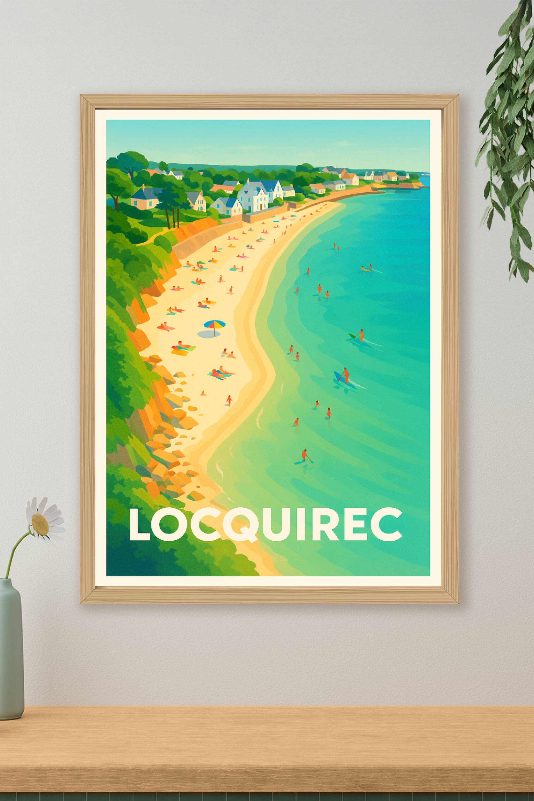 Découvrez le charme ensoleillé de Locquirec avec cette affiche au style vintage qui capture la sérénité d'une plage bretonne animée. Ce poster colo...