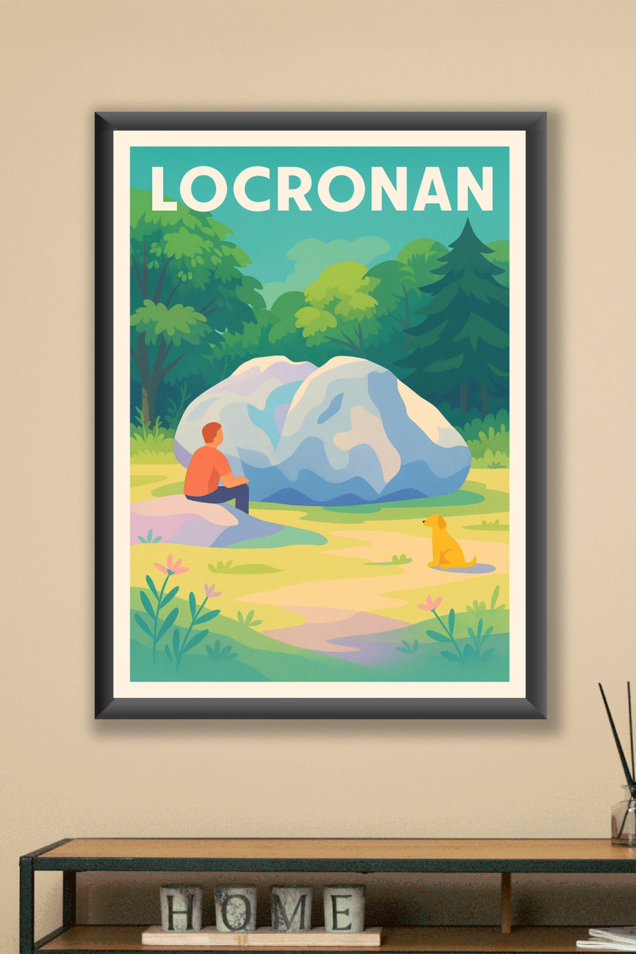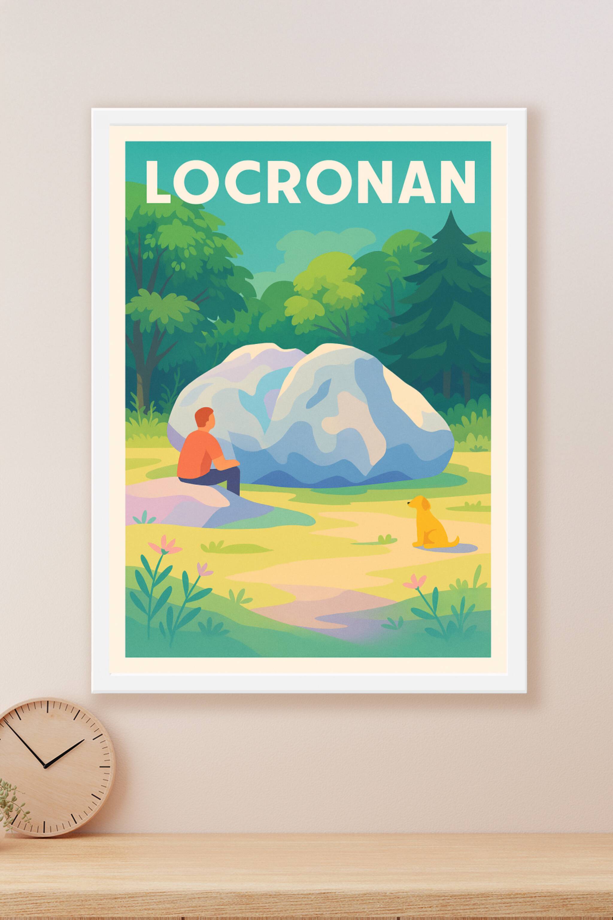 Découvrez l’atmosphère paisible et bucolique de Locronan à travers cette affiche illustrée aux couleurs douces et apaisantes. L’image capture un instant de contemplation entre un homme et son chien au cœur d’un paysage verdoyant et harmonieux. Ce poster, imprimé en tirage "Fine Art" sur un papier 305g coton de haute qualité, garantit des couleurs éclatantes et une durabilité exceptionnelle. Disponible en formats A1 à A4, avec ou sans cadre, cette affiche apportera une touche raffinée et naturelle à votre intérieur. Imprimée avec soin en France, elle est idéale pour les amateurs de décoration élégante ou comme cadeau unique pour les amoureux de la Bretagne.