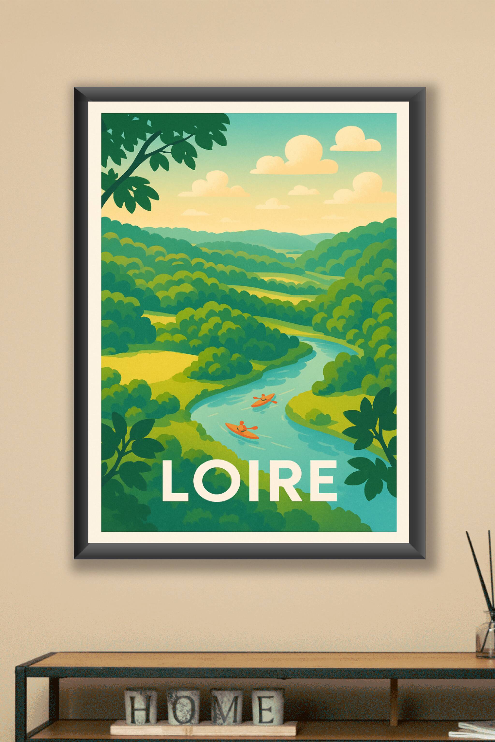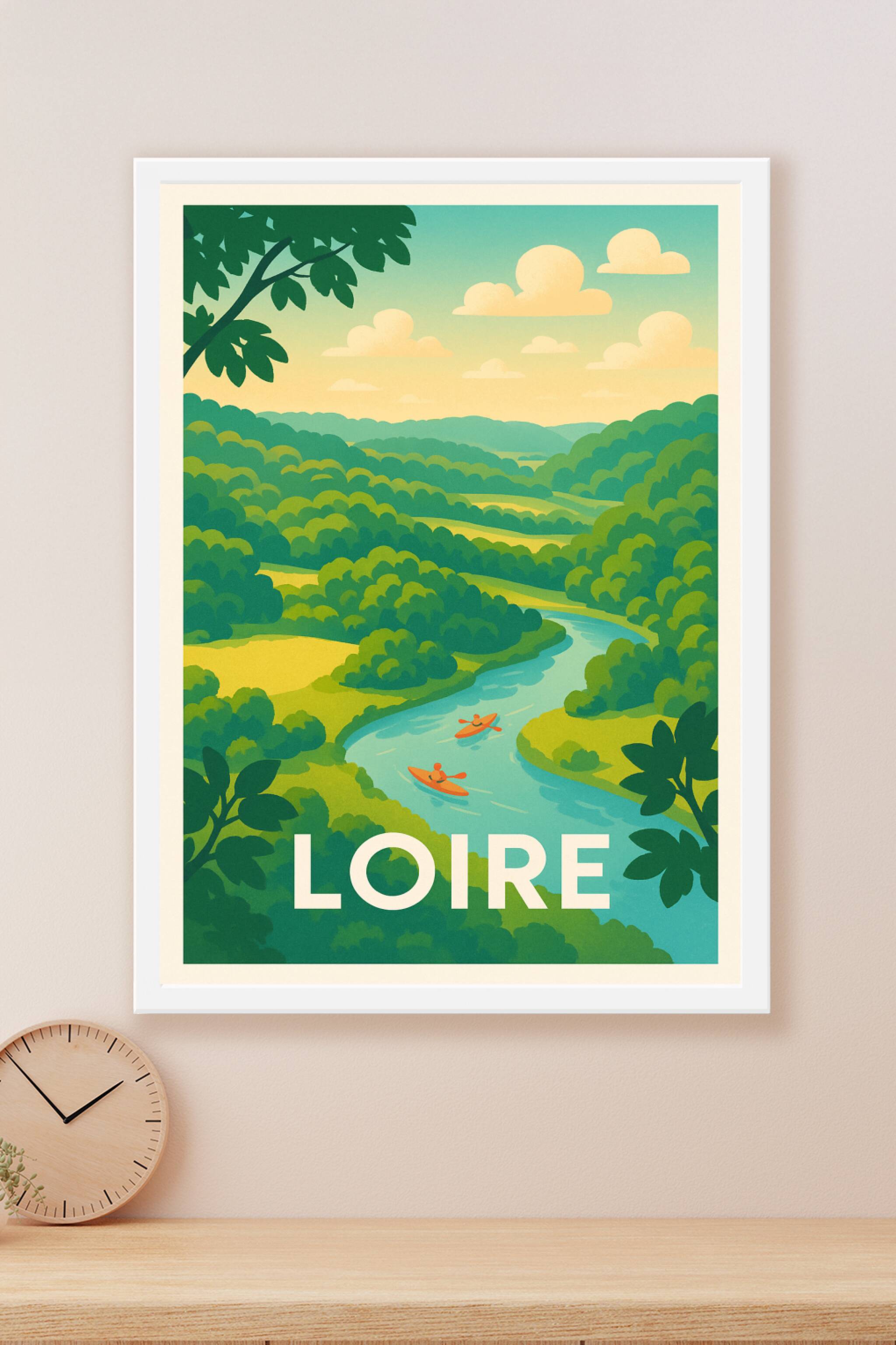 Découvrez la beauté apaisante de la vallée de la Loire avec cette affiche illustrée mettant en scène deux kayakistes glissant sur la rivière sinueu...
