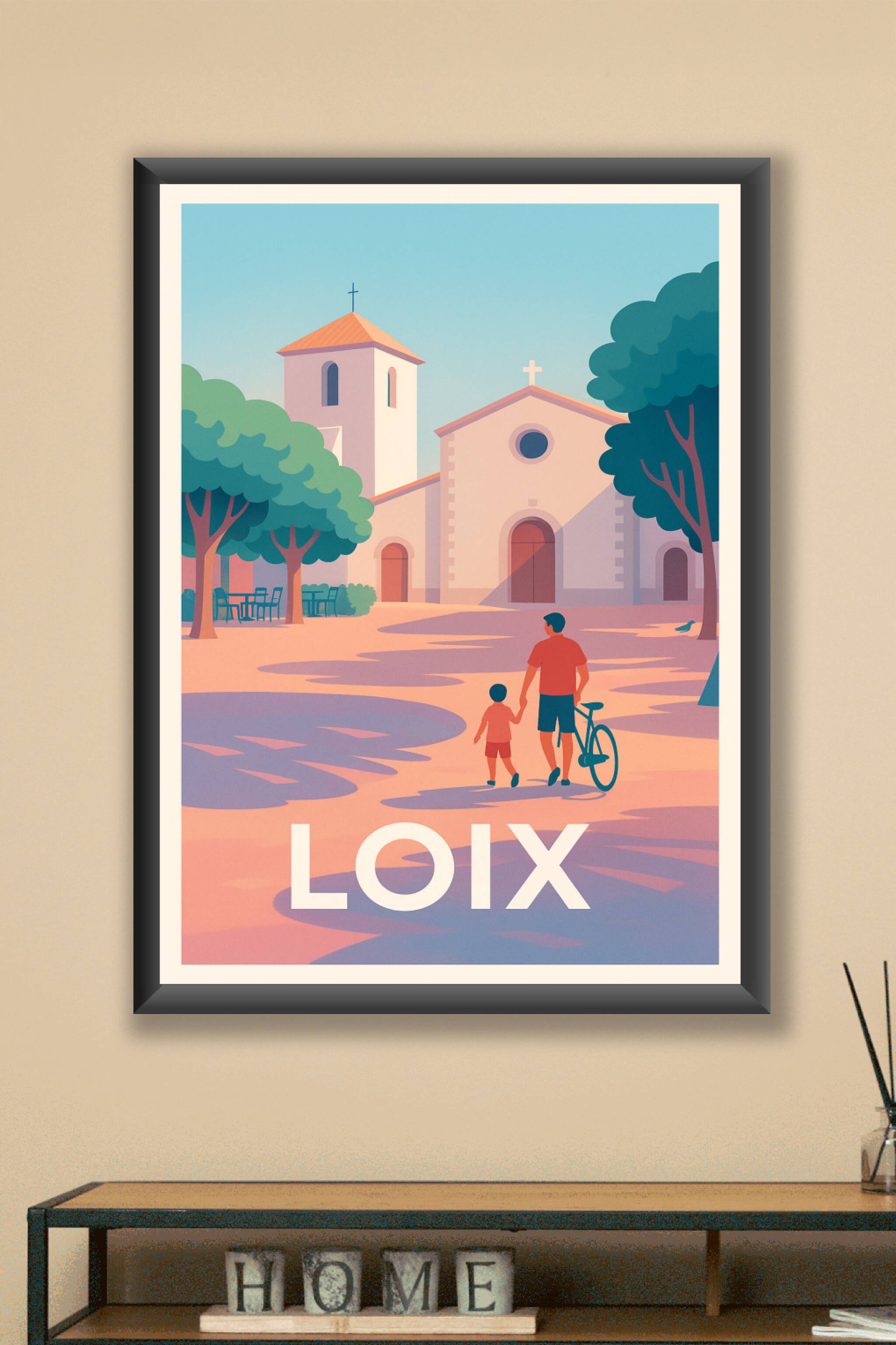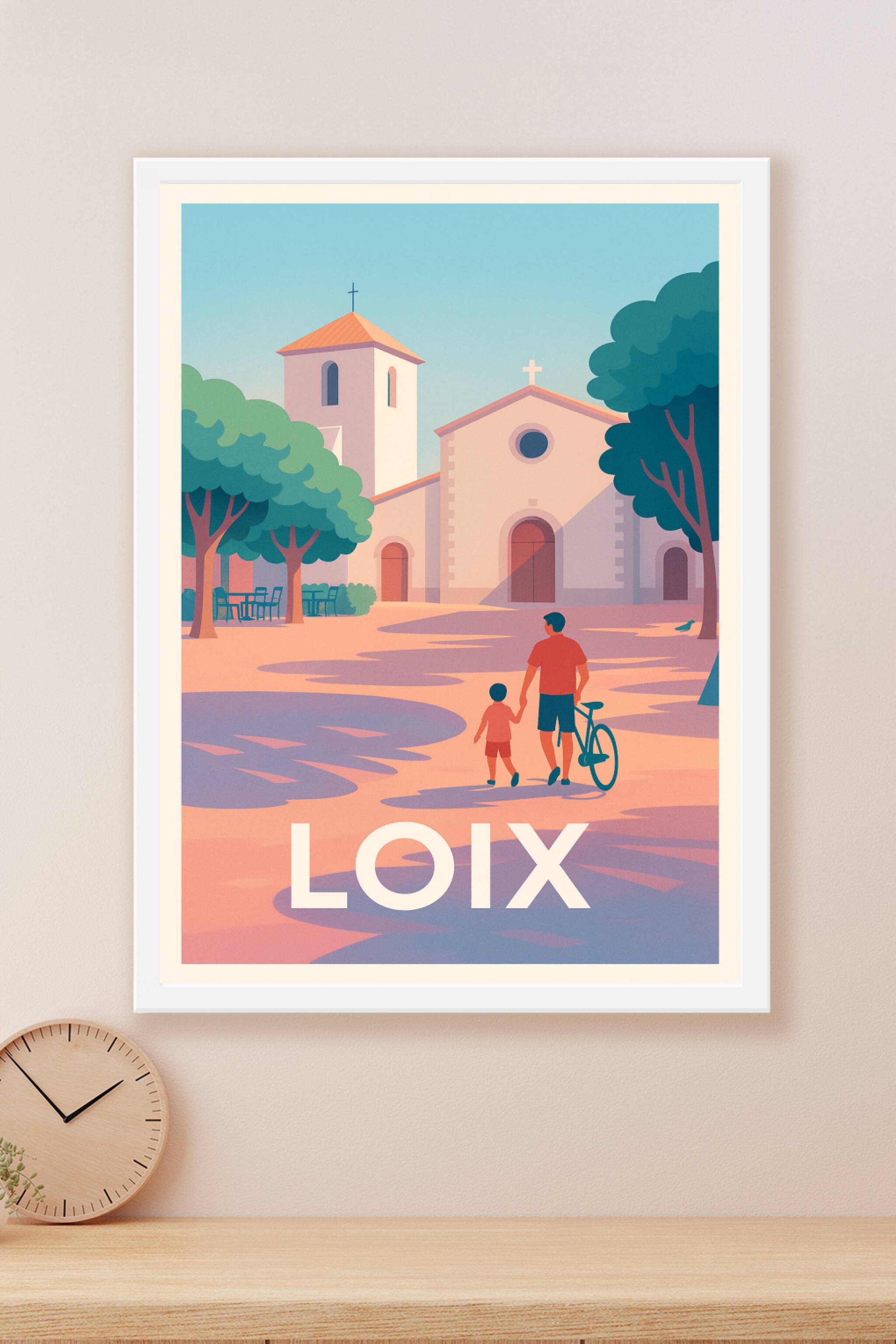 Découvrez l'ambiance paisible de Loix à travers cette affiche illustrée au style épuré et chaleureux, mettant en scène un père et son enfant dans u...