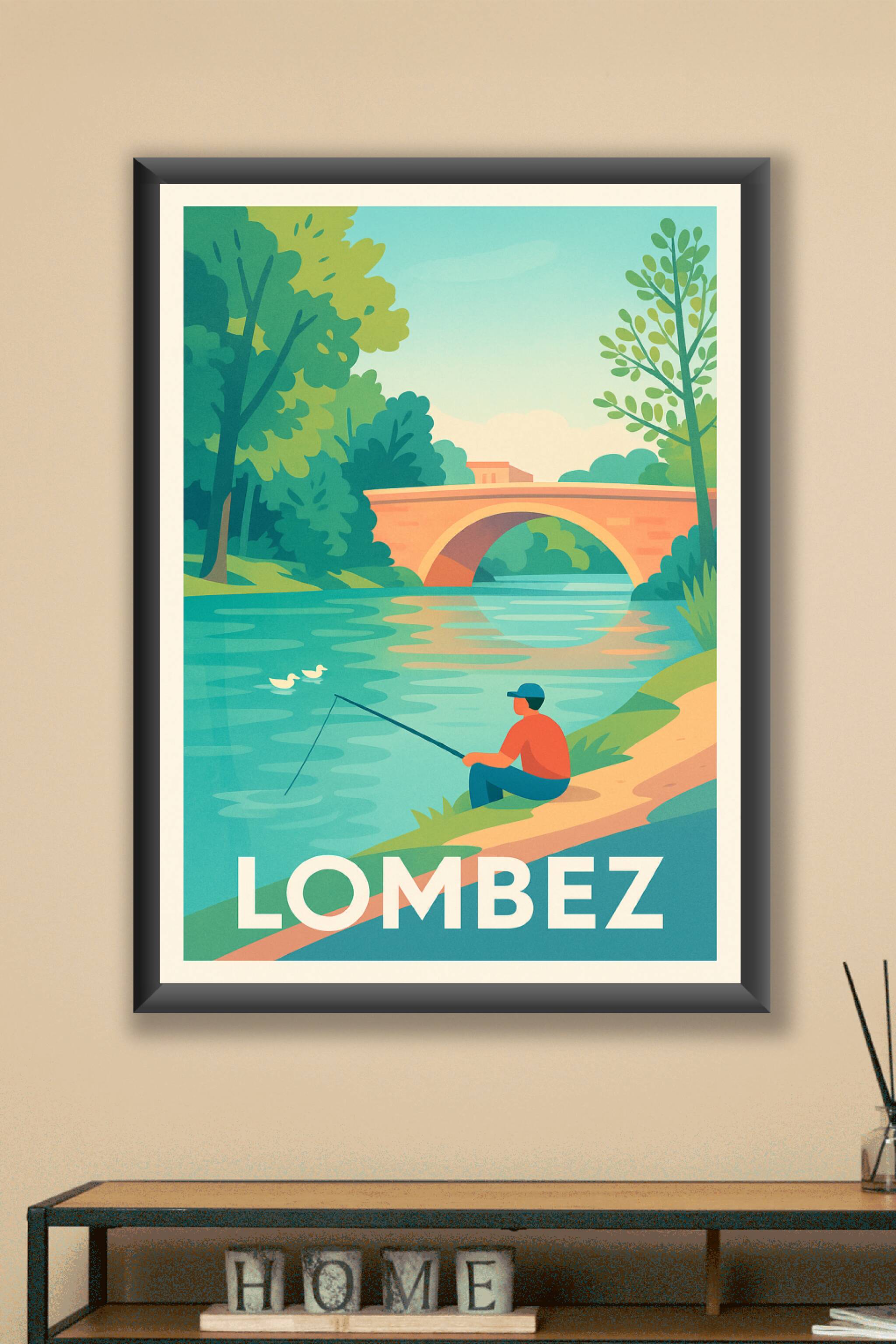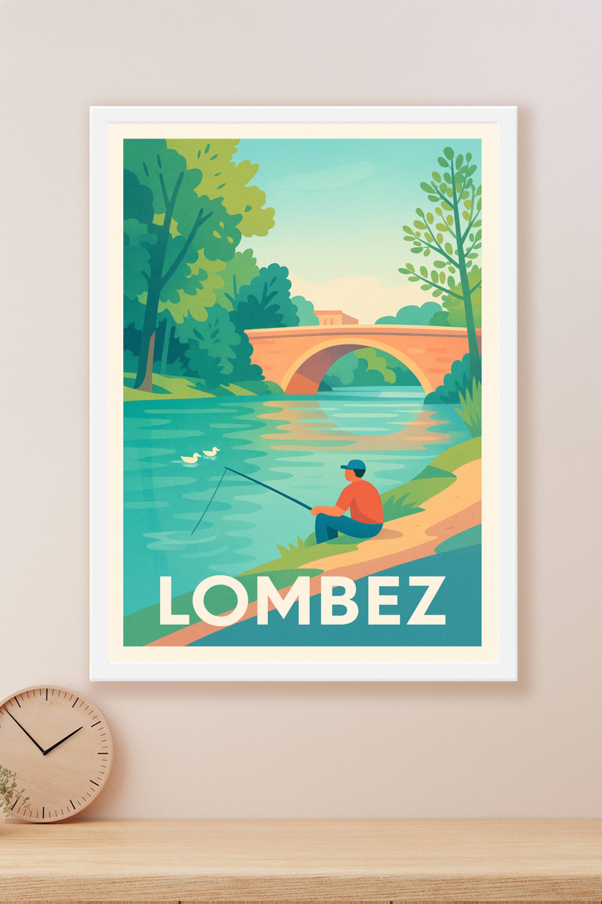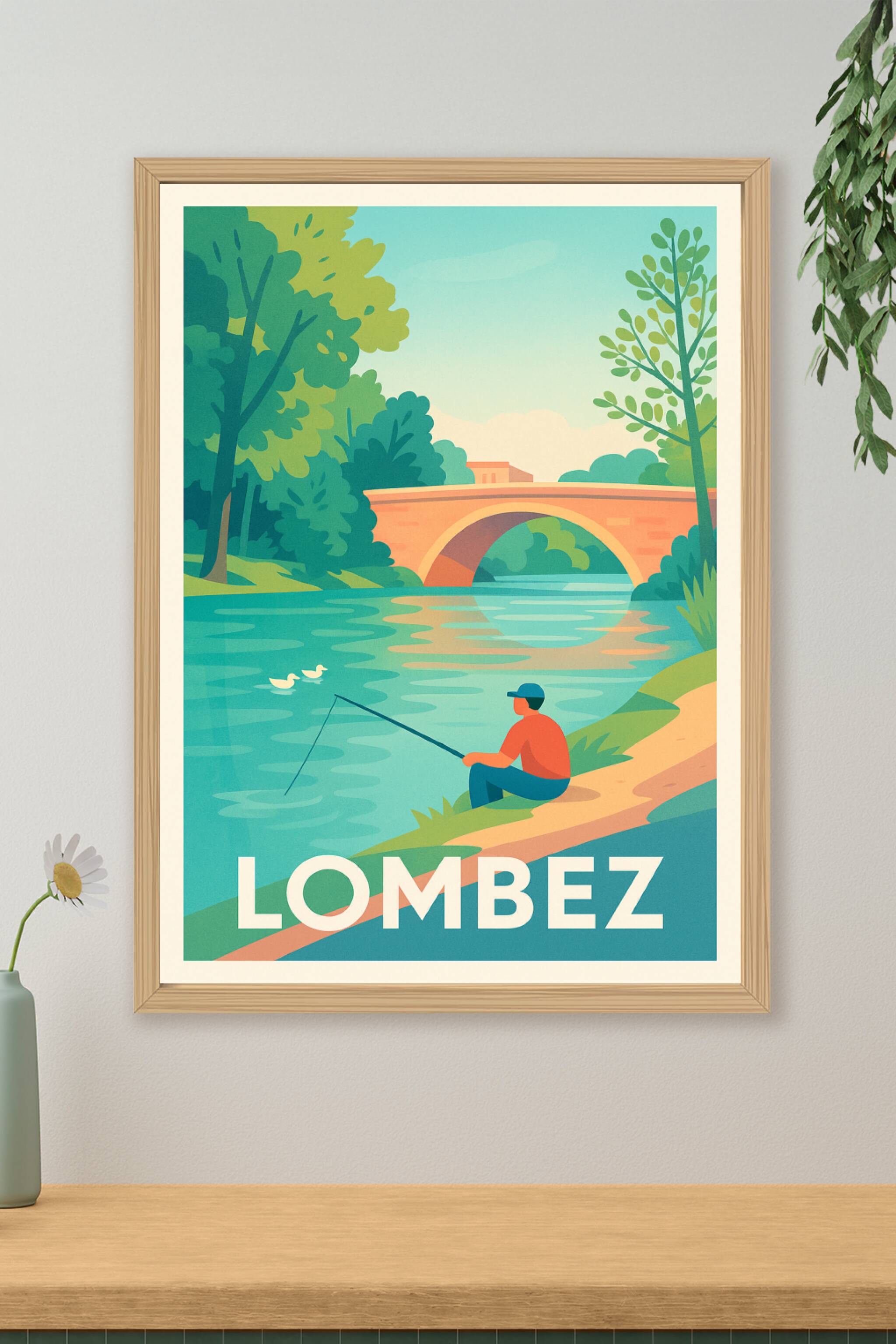 Découvrez la douceur et la sérénité de Lombez avec cette magnifique affiche illustrant un moment paisible de pêche au bord de la rivière, sous l'om...