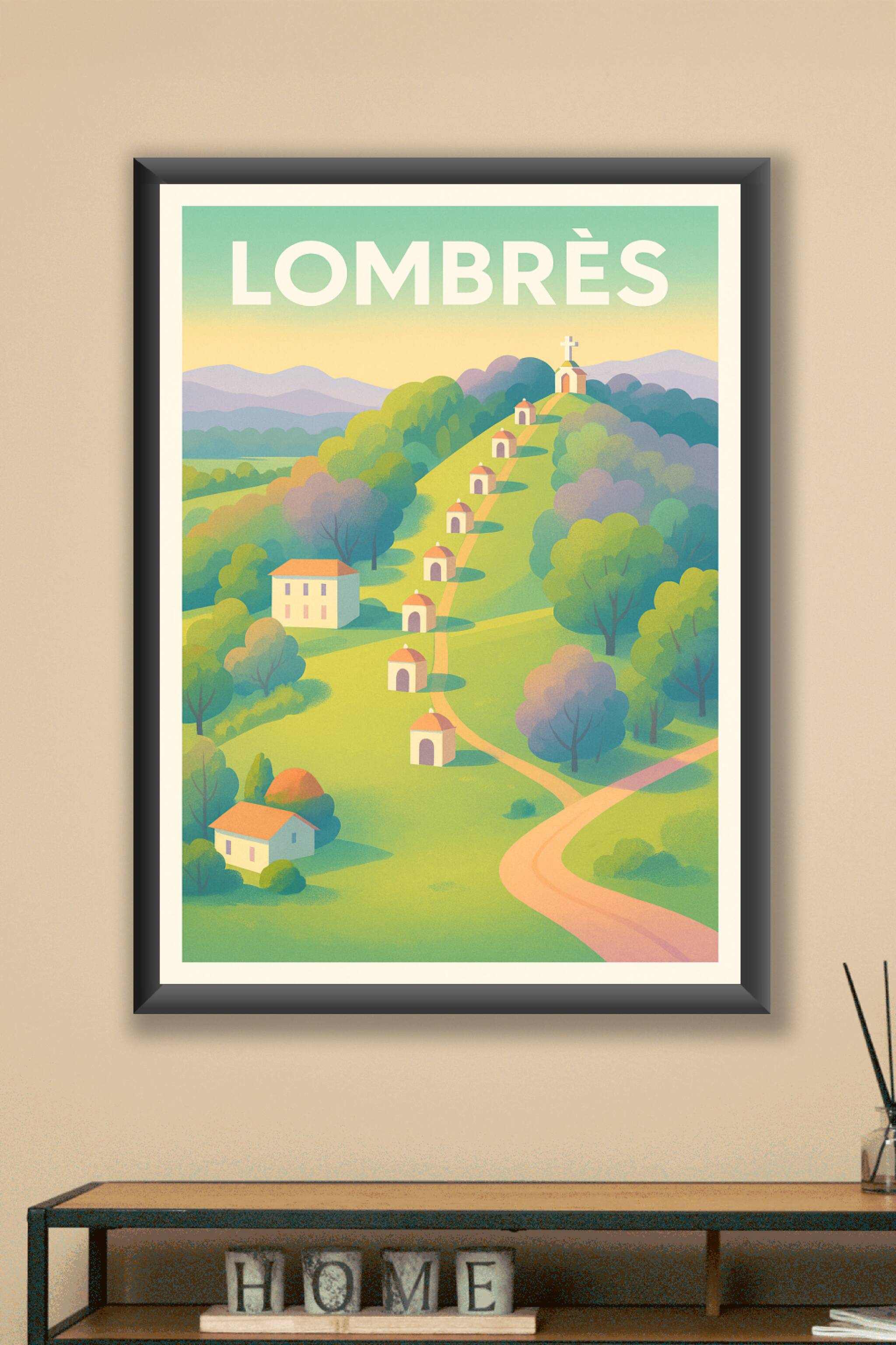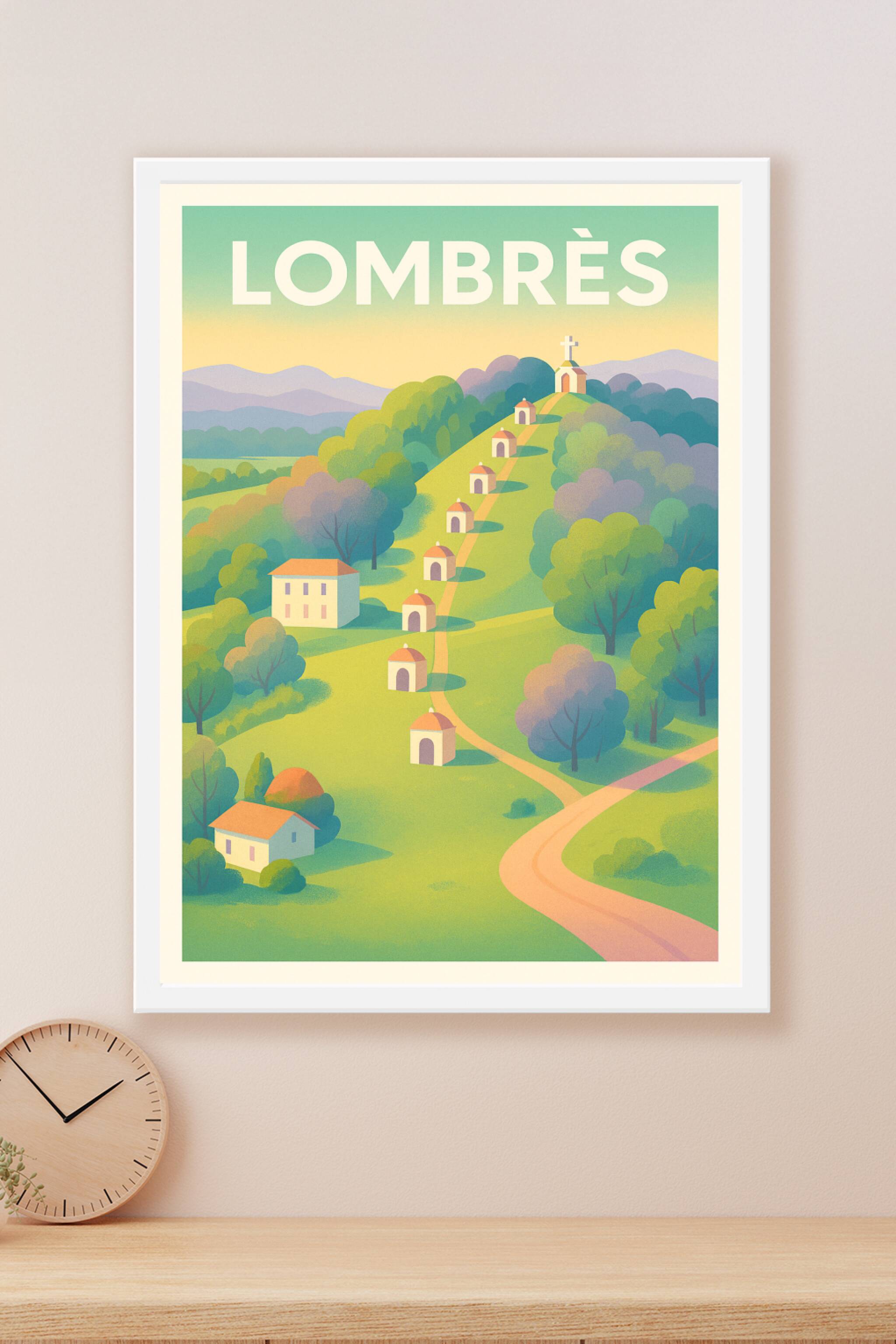 Découvrez la douceur champêtre de Lombrès avec cette affiche illustrée aux teintes pastel qui invite à la sérénité et à la contemplation. Le chemin...