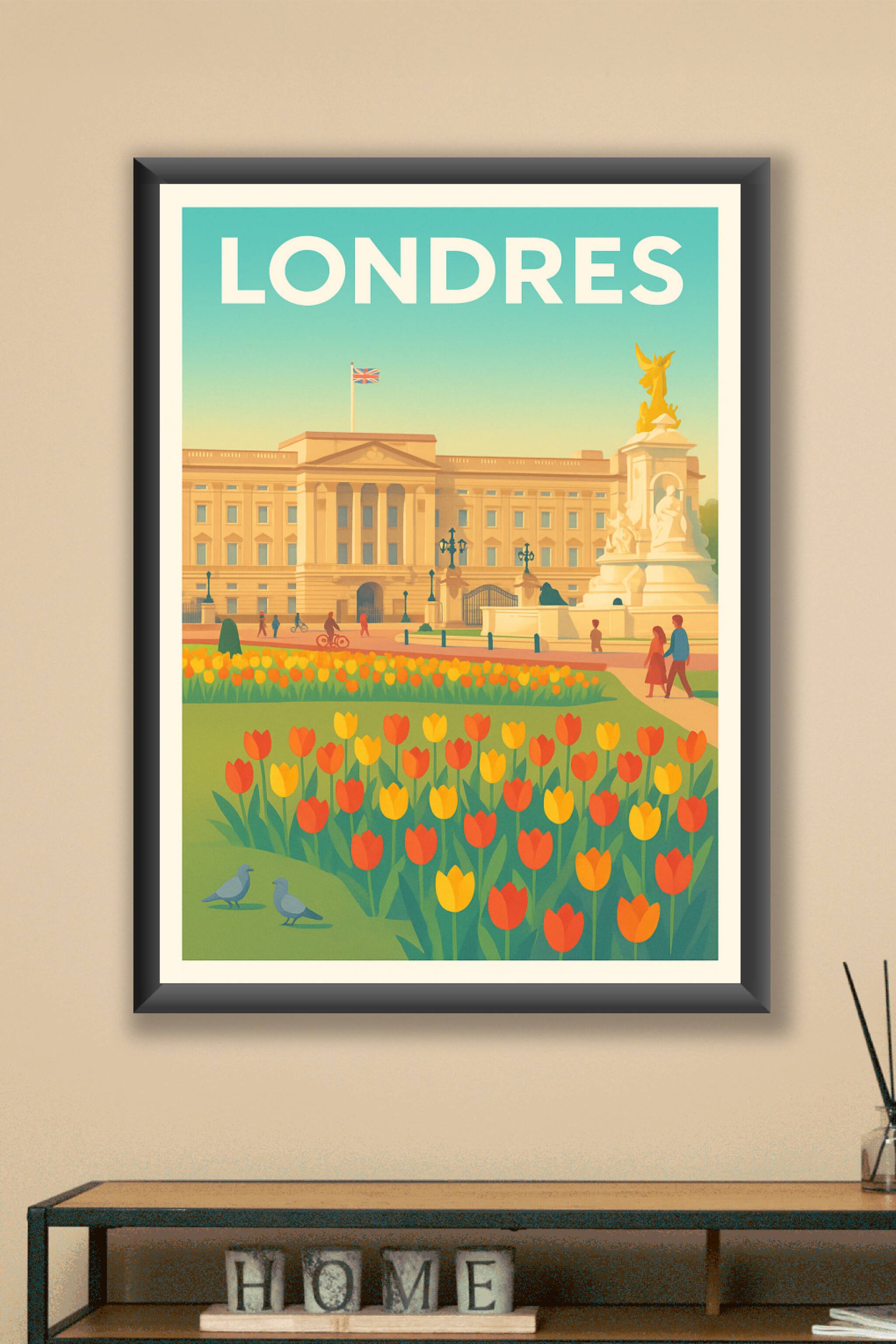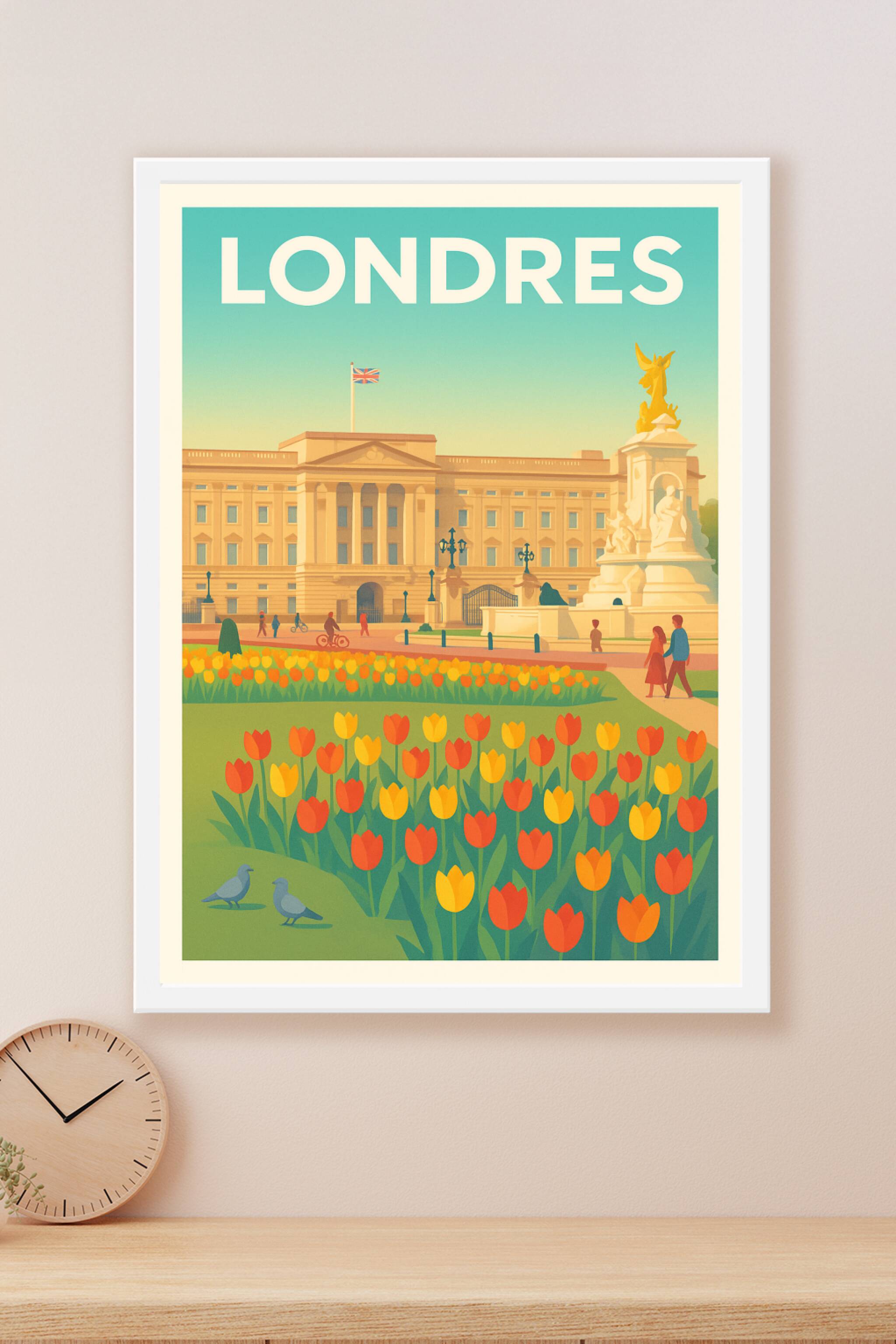 Découvrez la majesté de Londres au travers de cette affiche illustrée mettant en scène le palais de Buckingham et ses jardins fleuris de tulipes ro...