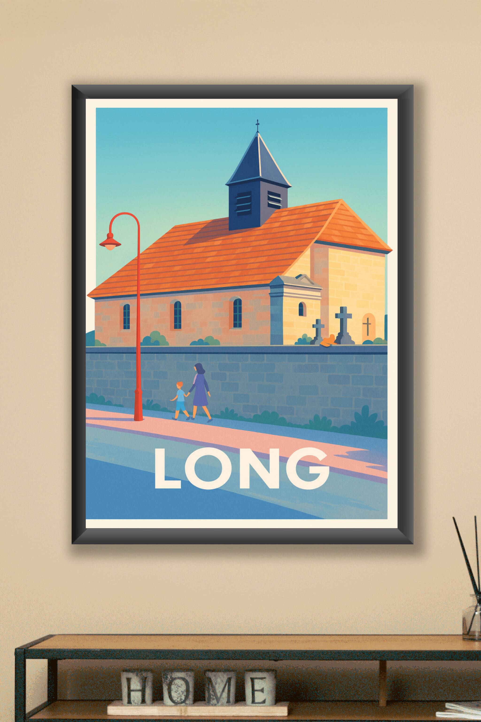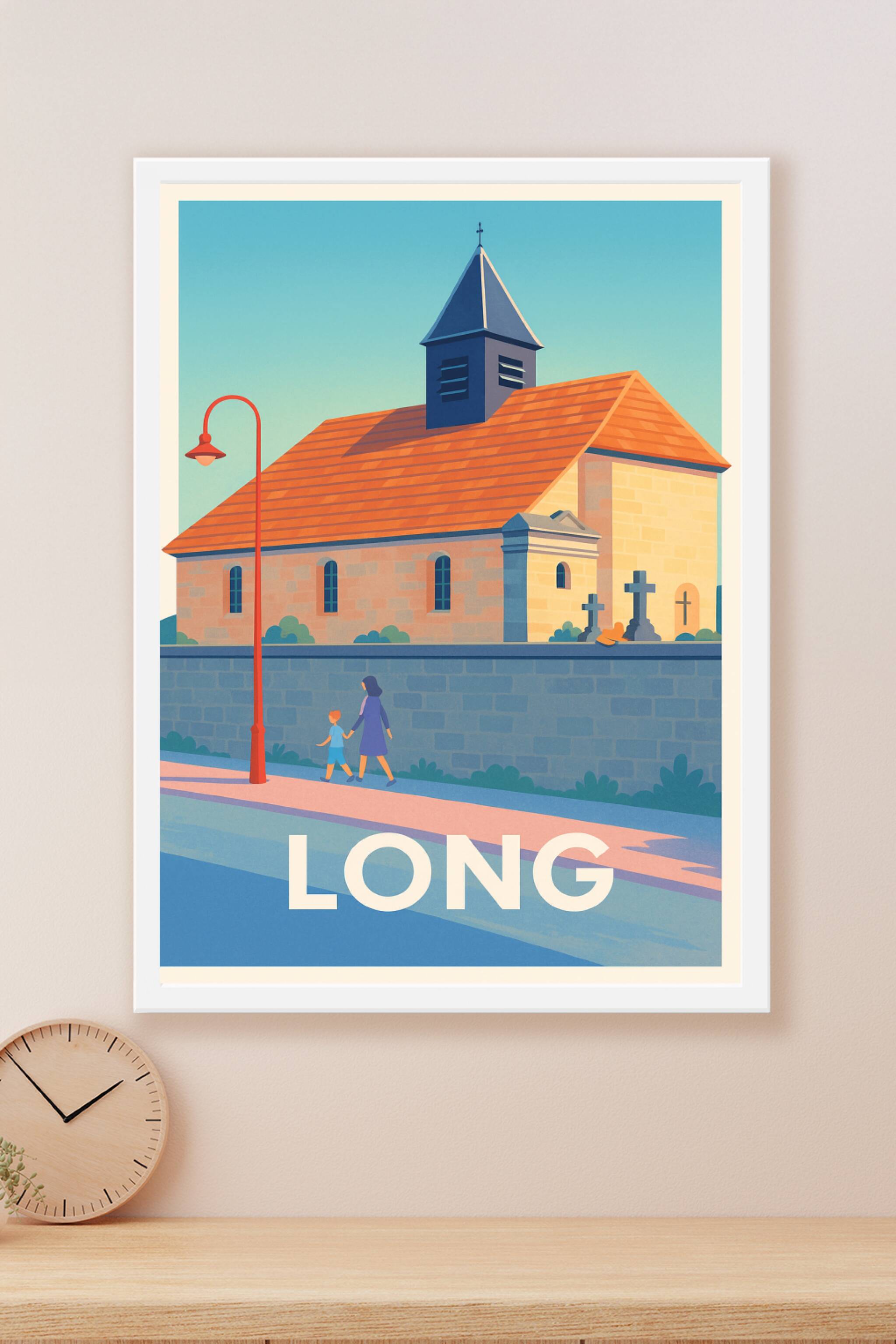 Découvrez la douceur de vivre de Long à travers cette affiche illustrée représentant une charmante église aux couleurs chaudes, baignée par une lum...