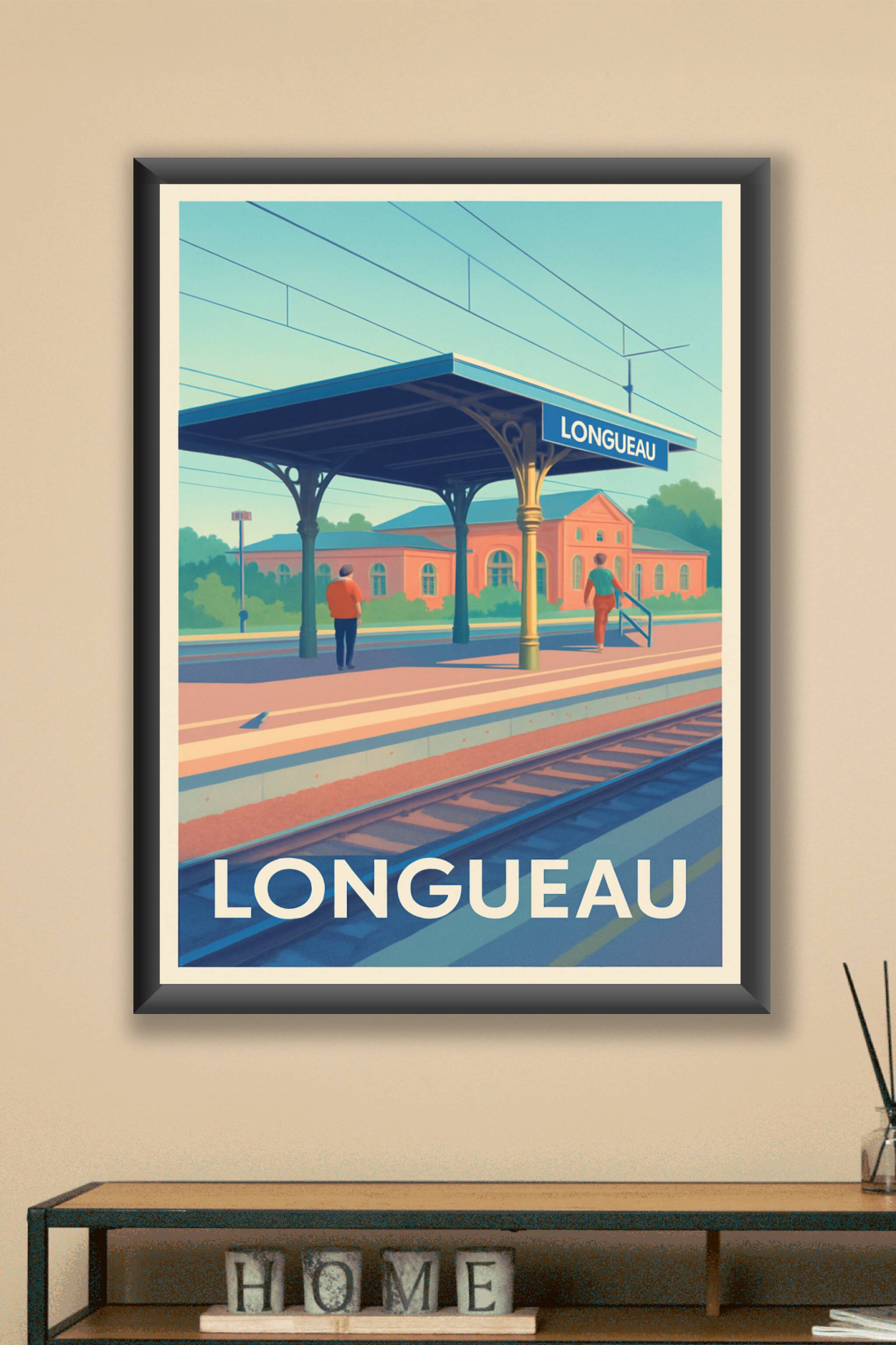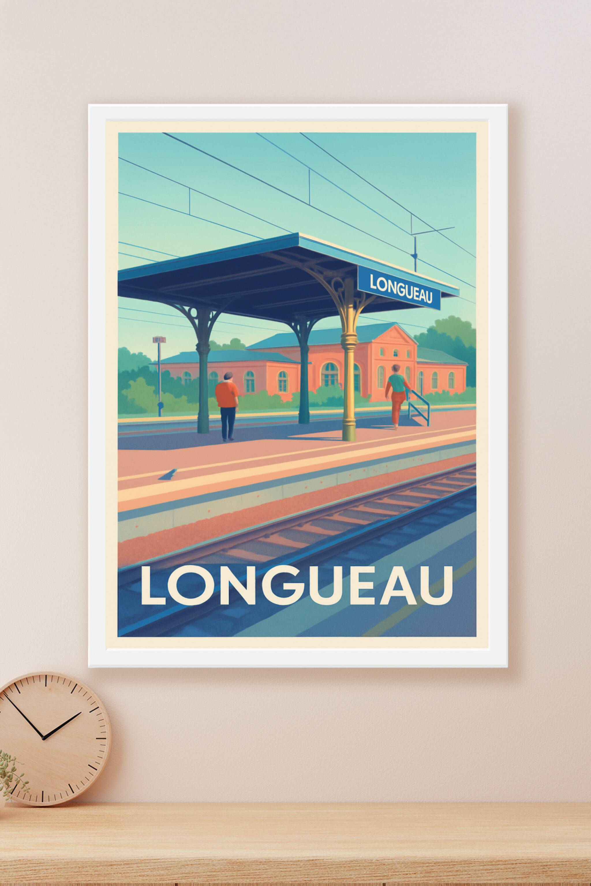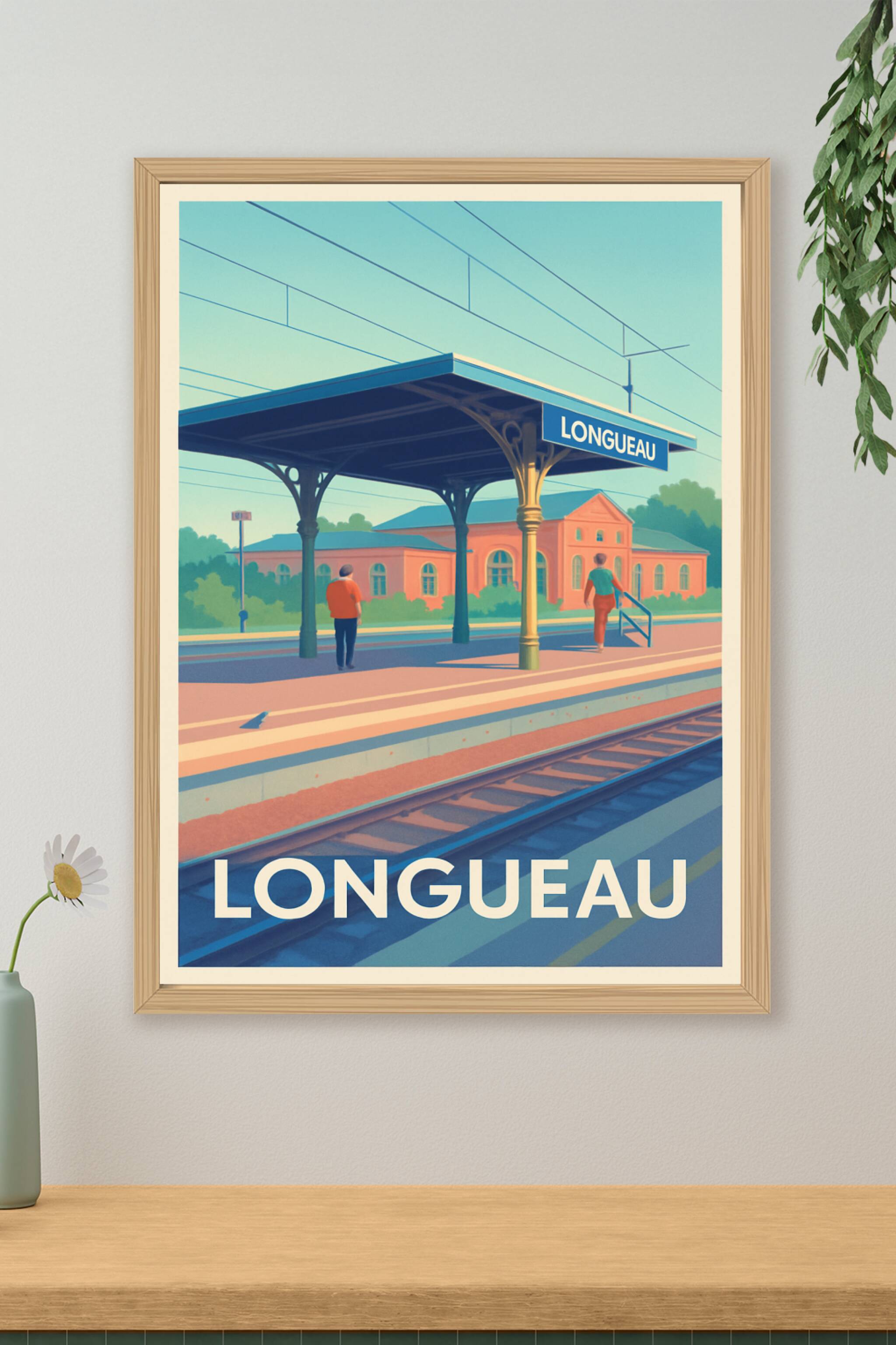 Découvrez l'élégance tranquille de Longueau avec cette affiche illustrant la gare et son quai baigné de lumière douce, où le quotidien semble suspe...