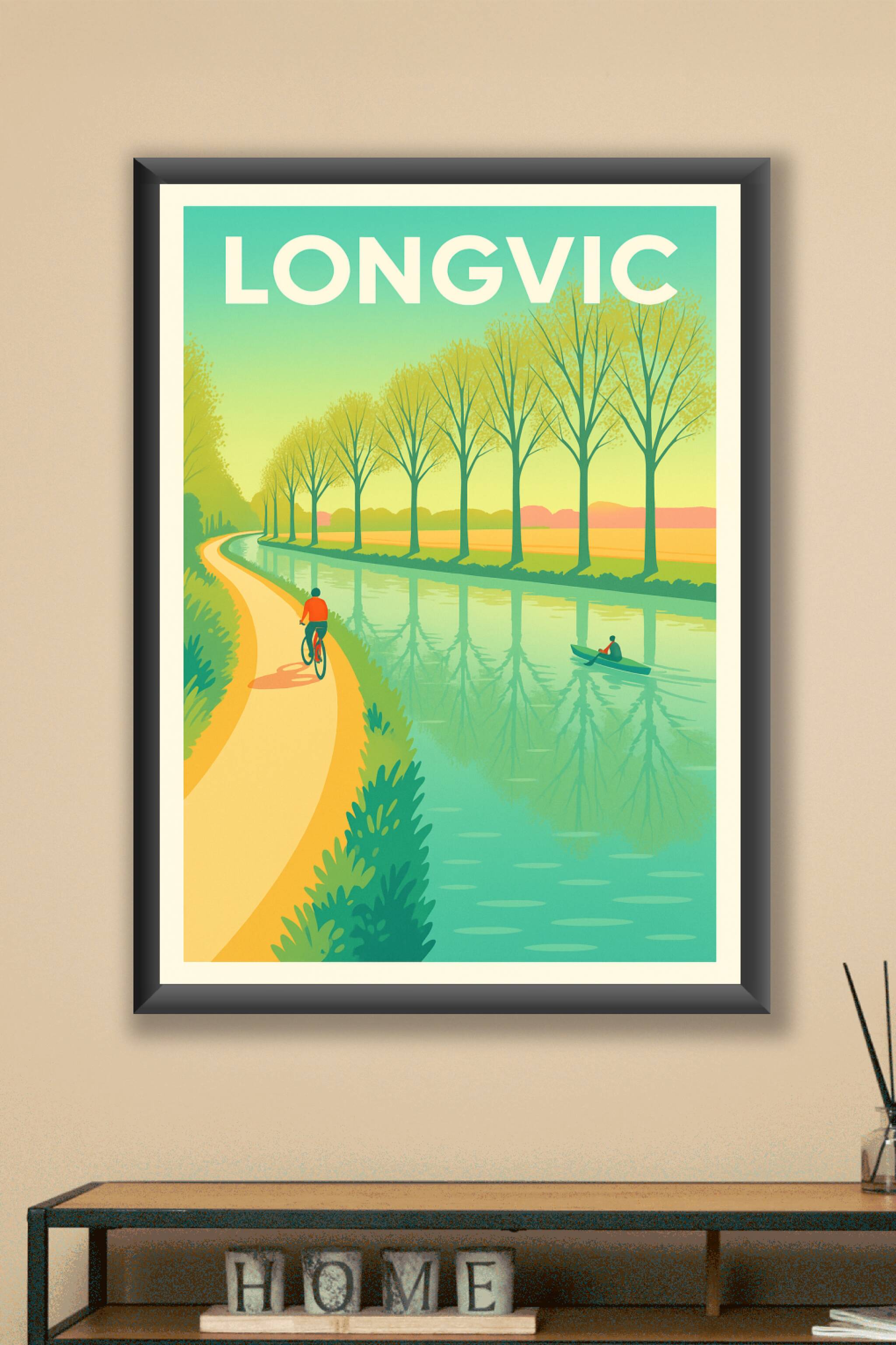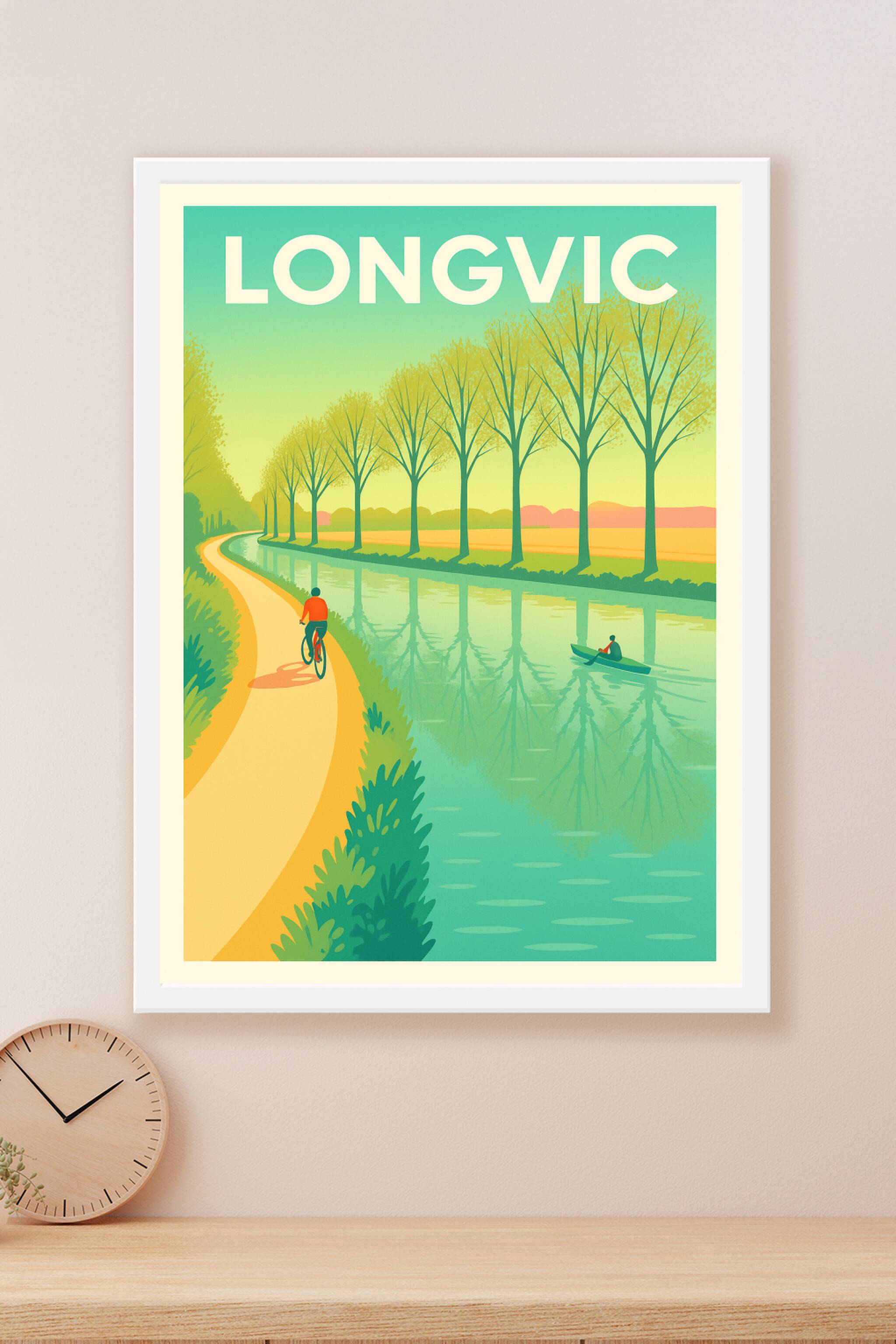 Découvrez l'harmonie paisible de Longvic avec cette affiche illustrée mettant en scène un cycliste et un canoéiste longeant un canal bordé d'arbres...