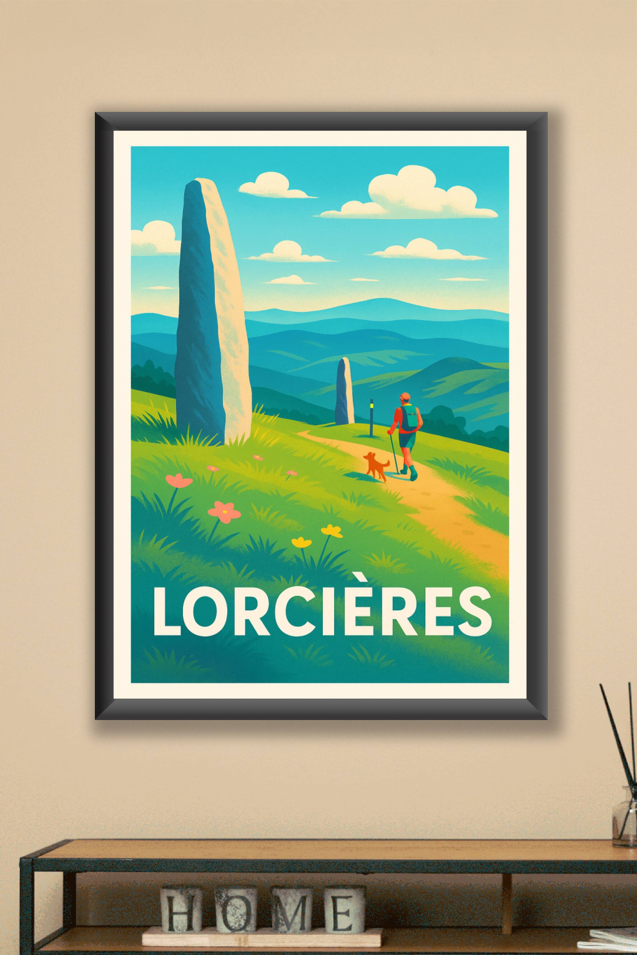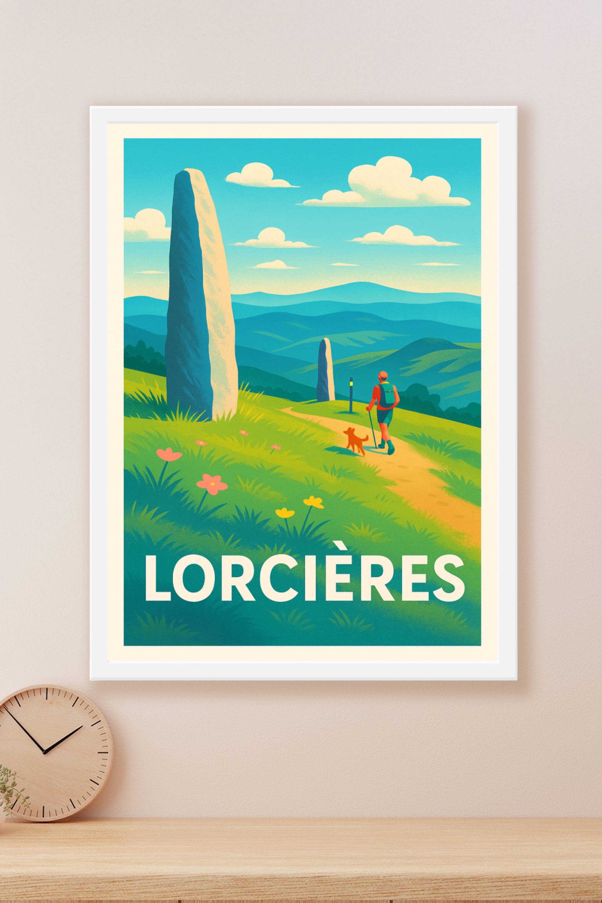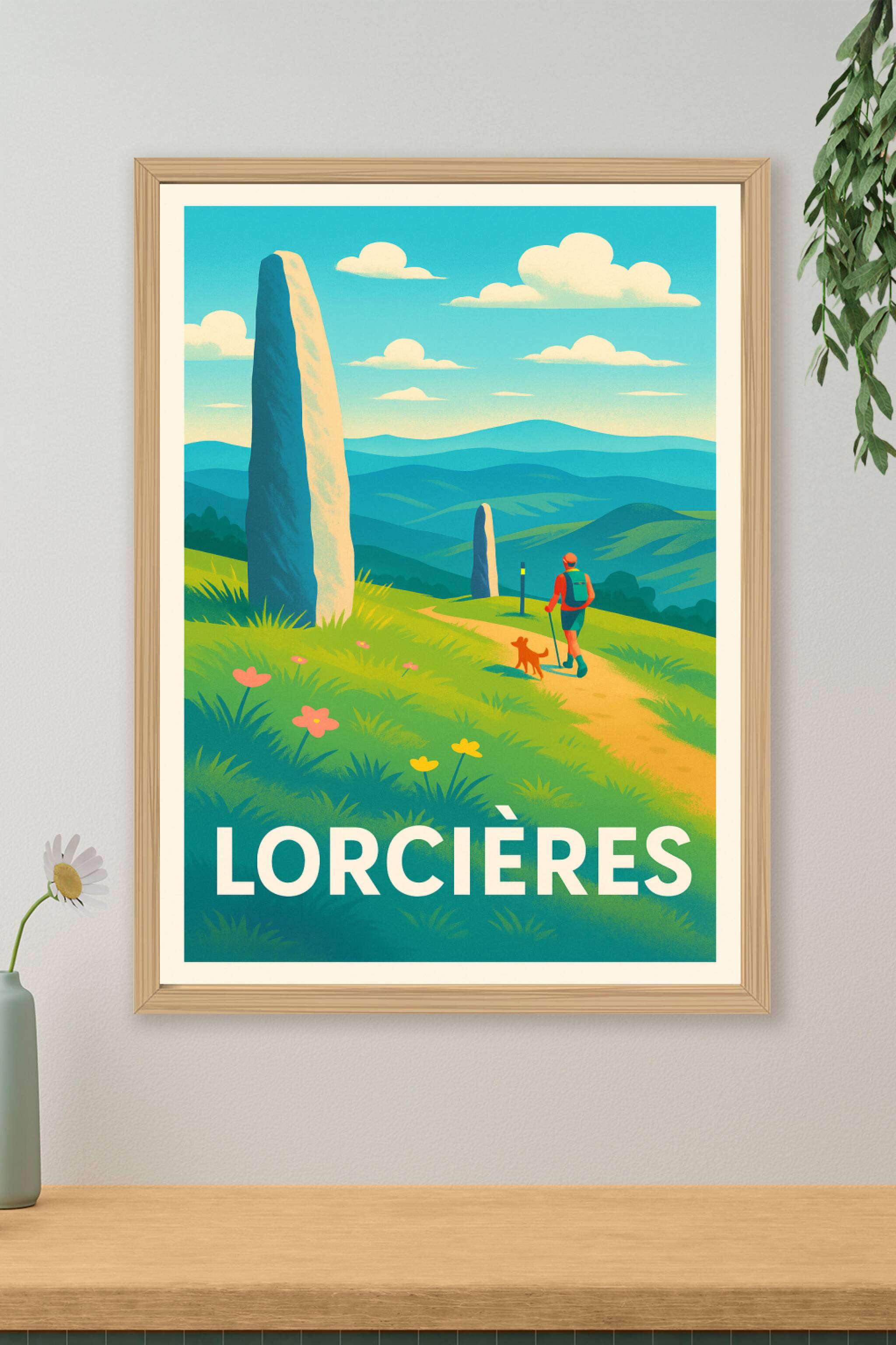 Découvrez la beauté naturelle et l'ambiance paisible de Lorcières avec ce poster représentant un randonneur et son chien sur un sentier entouré de ...