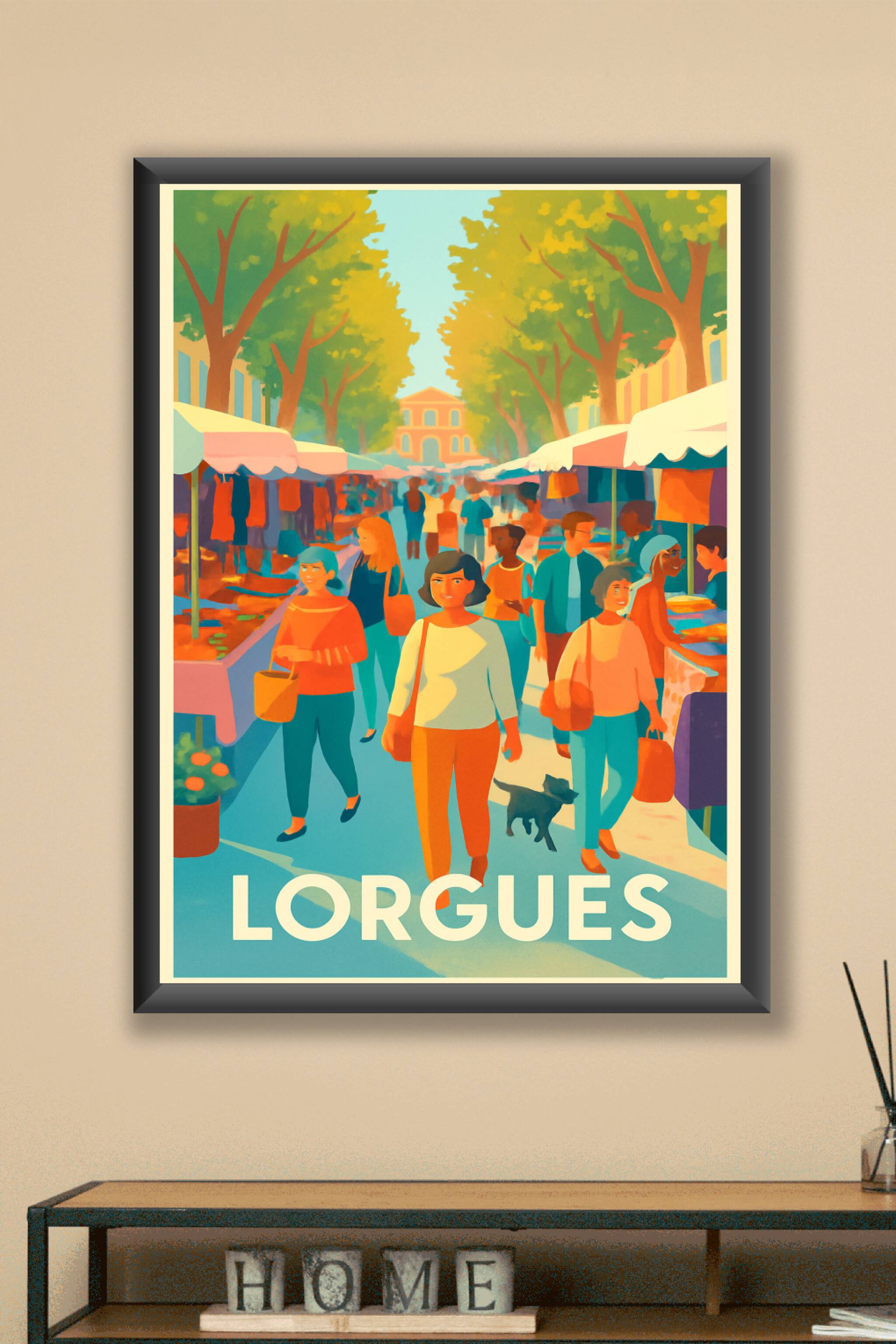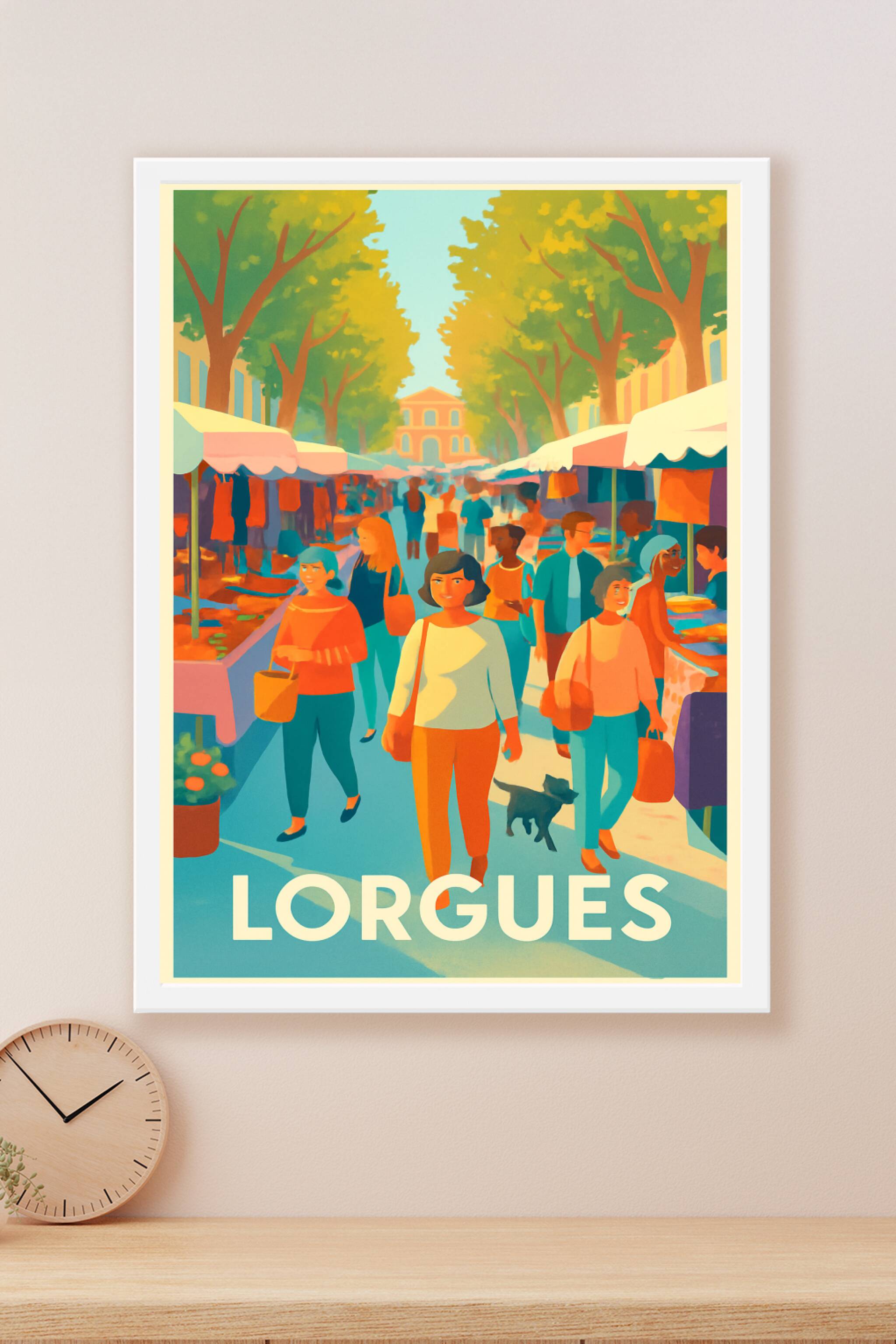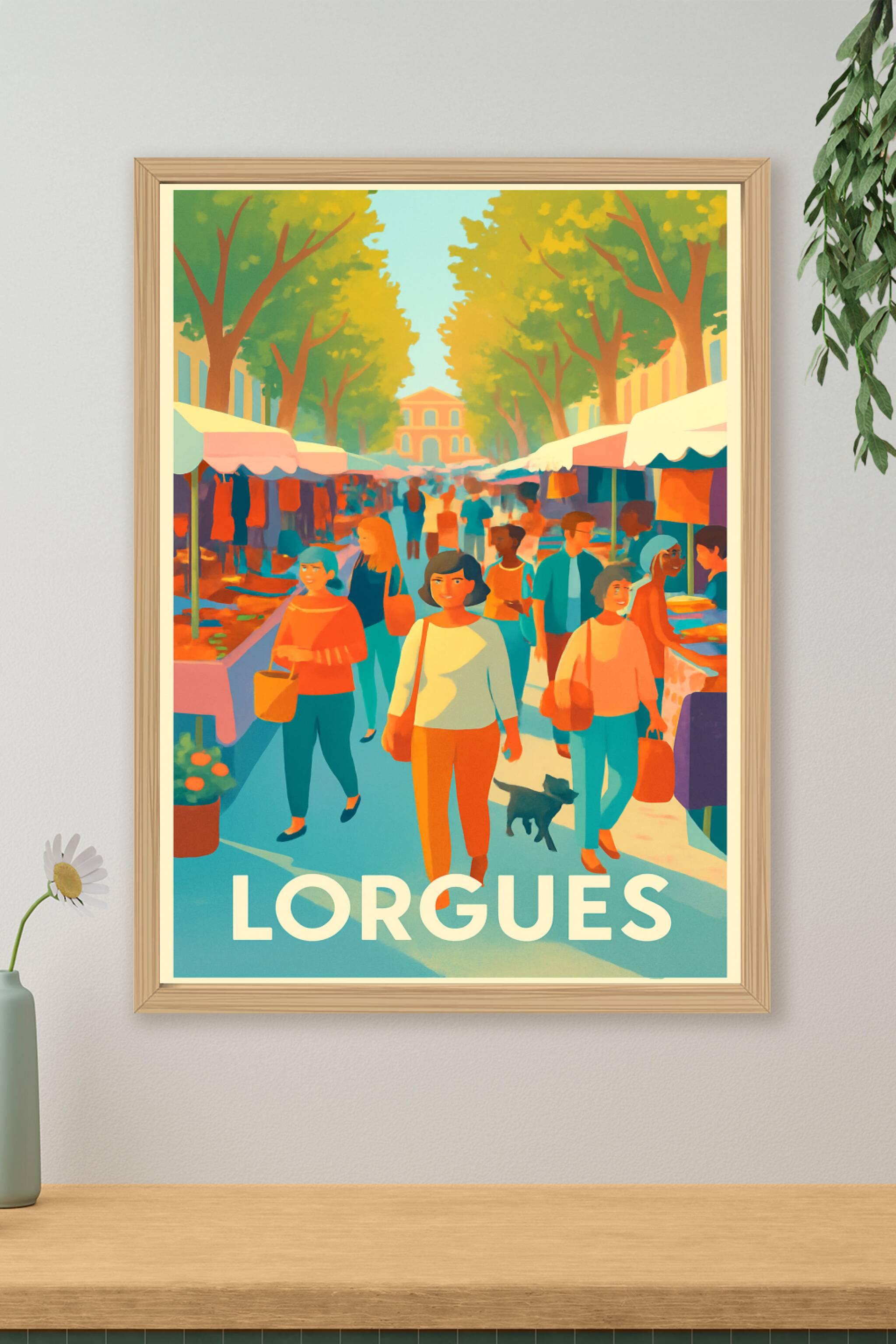Découvrez l'esprit vivant et coloré de Lorgues à travers cette magnifique affiche illustrant le marché local, animé et chaleureux. Ce poster captur...