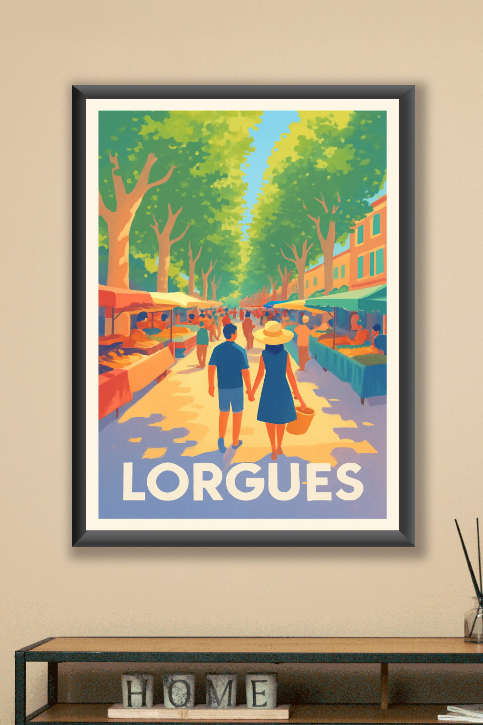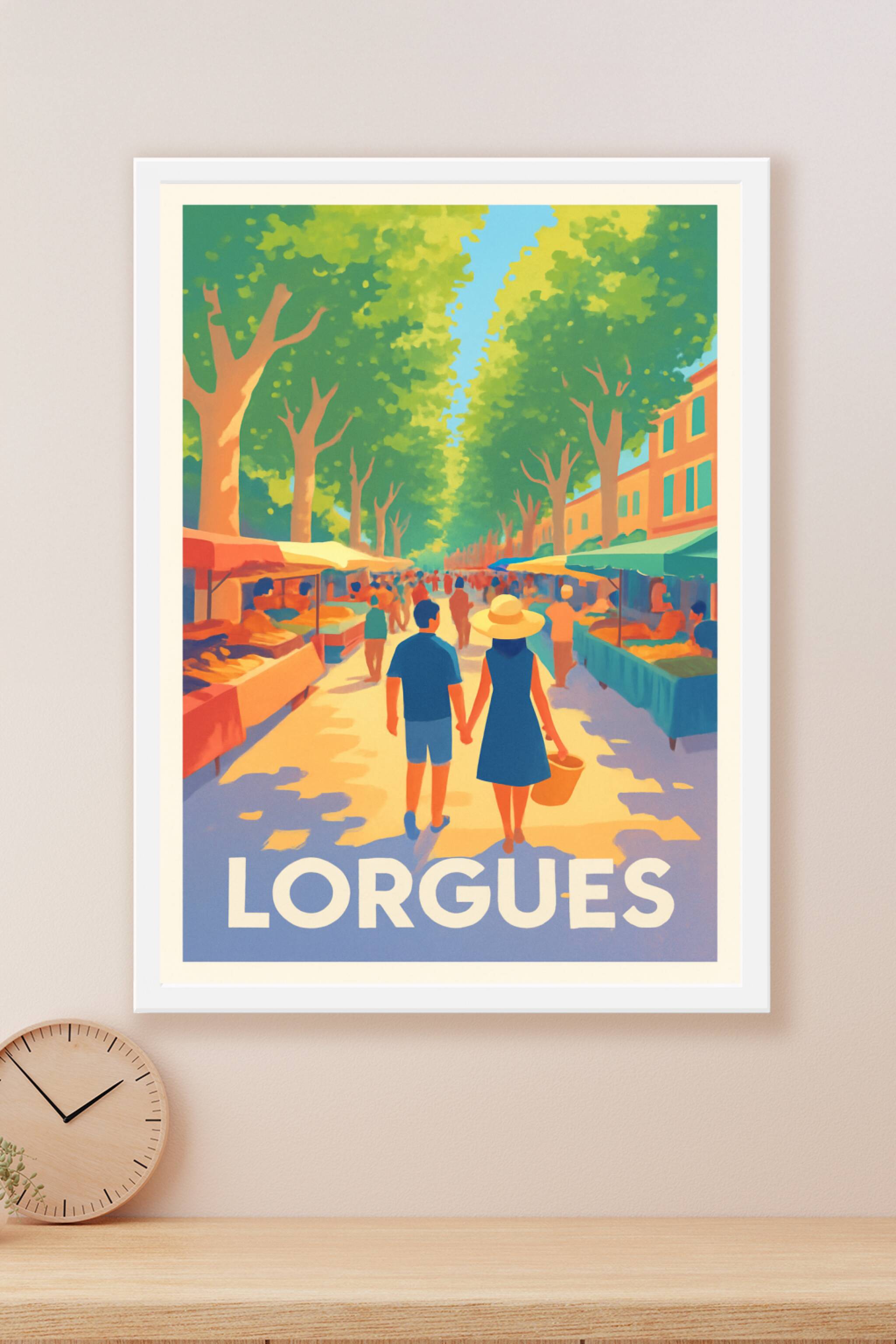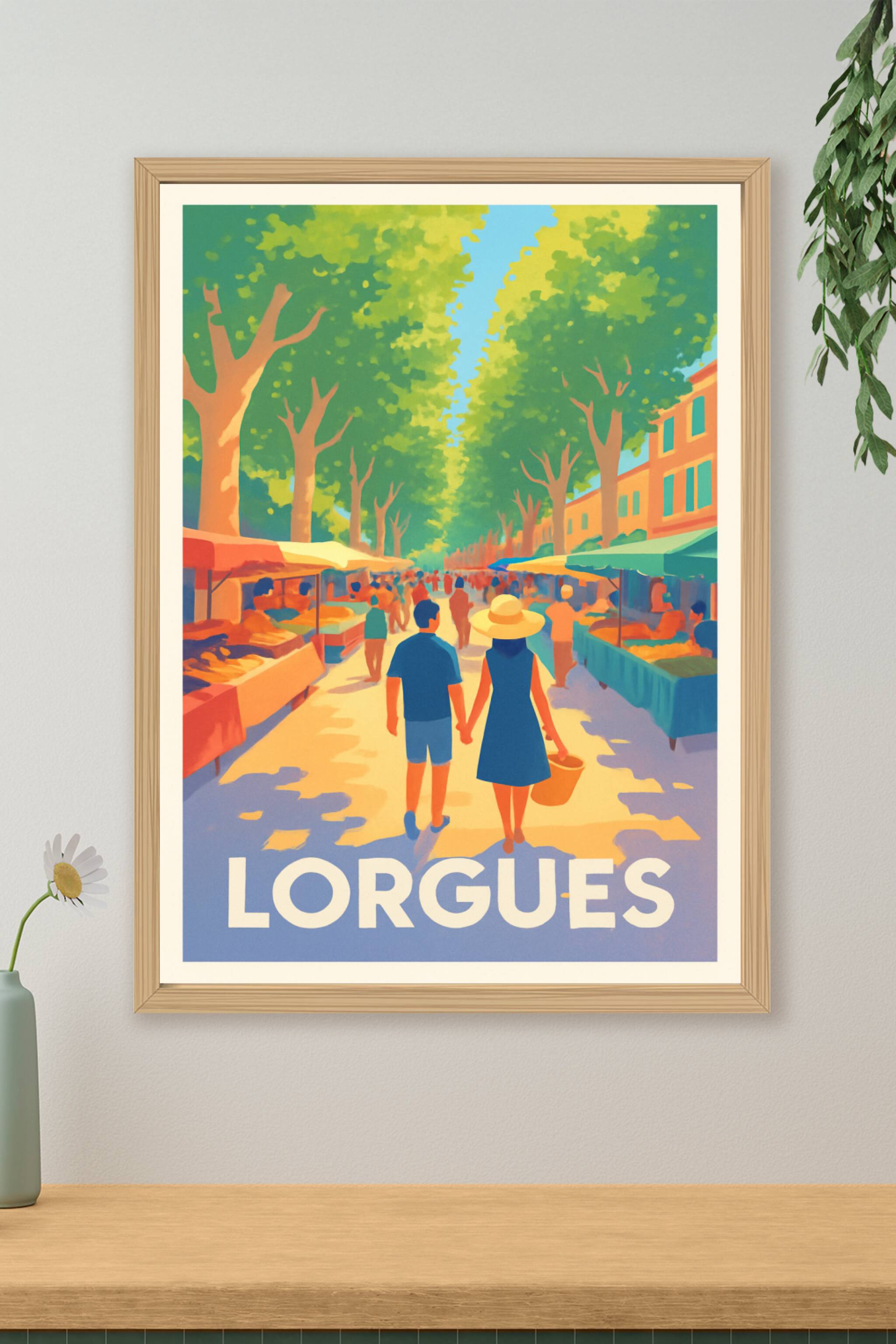 Découvrez la douceur de vivre à Lorgues avec ce poster vibrant qui capture l'ambiance animée et chaleureuse d'un marché provençal en plein soleil. ...