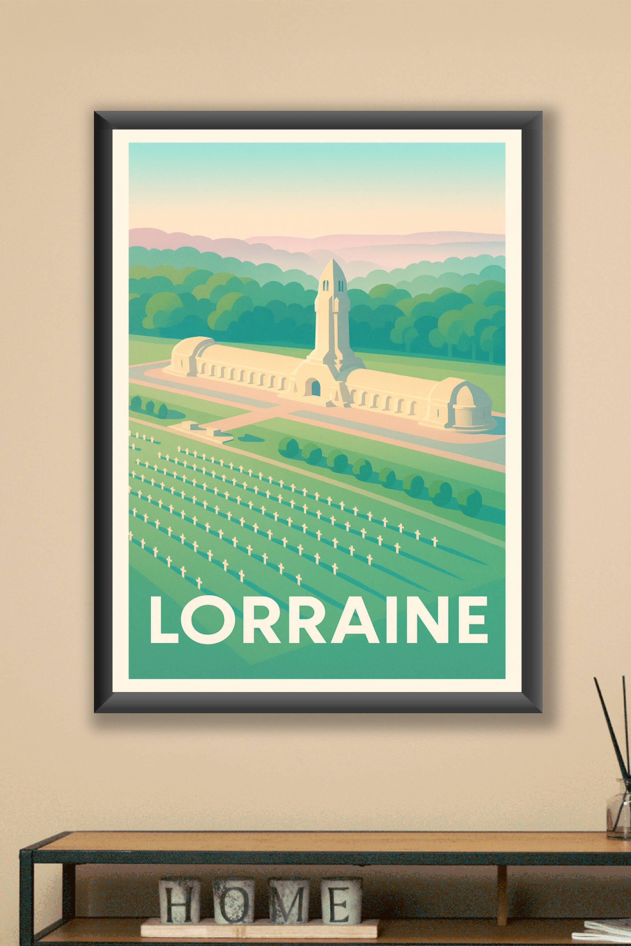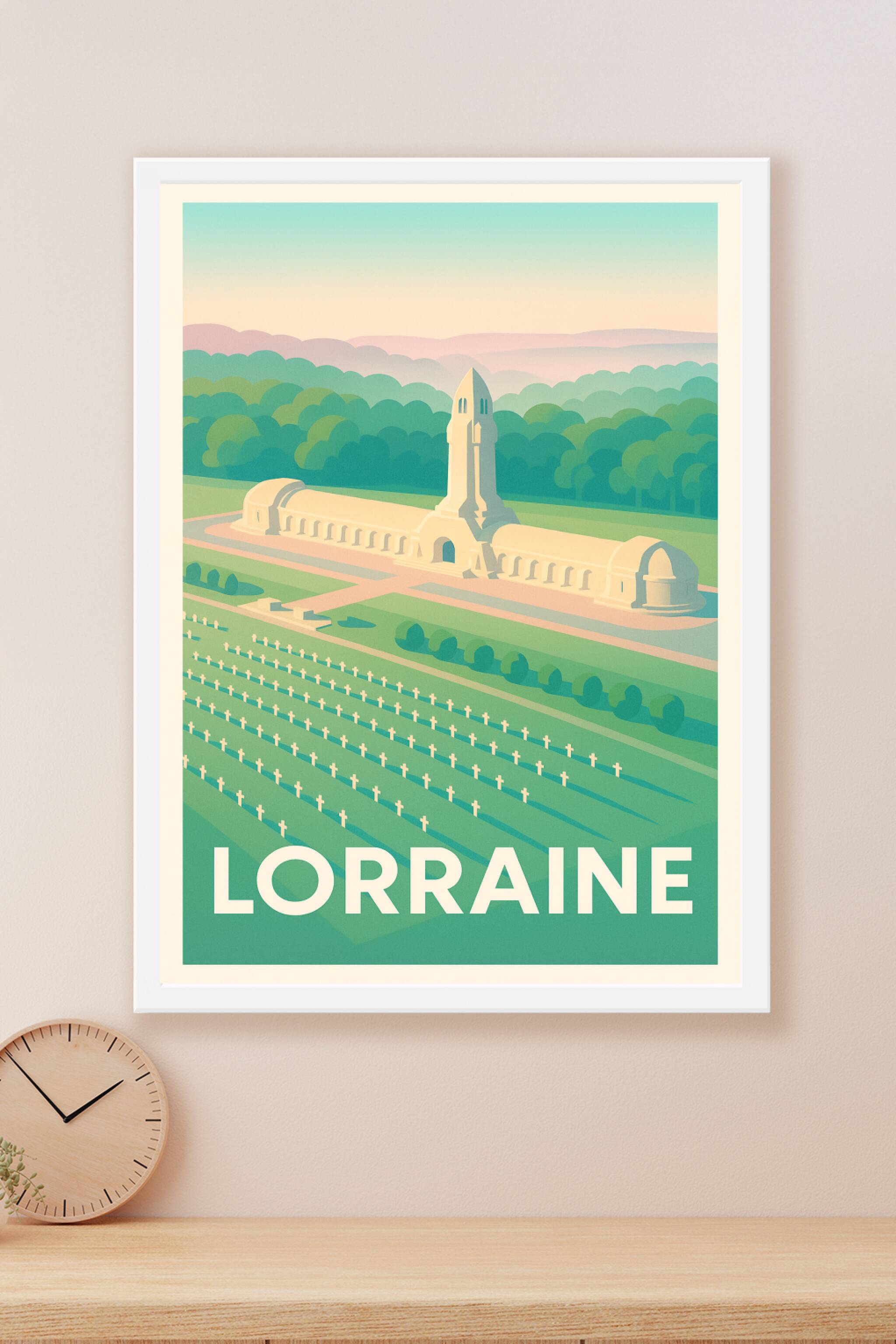 Découvrez cette affiche élégante qui célèbre la région de Lorraine à travers l’illustration du célèbre mémorial et ses vastes cimetières, symboles de mémoire et de paix. Ce poster au style épuré et coloré apporte une atmosphère apaisante et respectueuse à votre décoration intérieure. Imprimé en tirage "Fine Art" sur papier 305g coton, ce poster offre une qualité d’impression exceptionnelle et une longue tenue des couleurs. Disponible en formats A1 à A4, avec ou sans cadre, cette affiche s’adapte à tous les intérieurs, pour sublimer votre maison ou offrir un cadeau chargé de sens aux passionnés d’histoire et de patrimoine.
