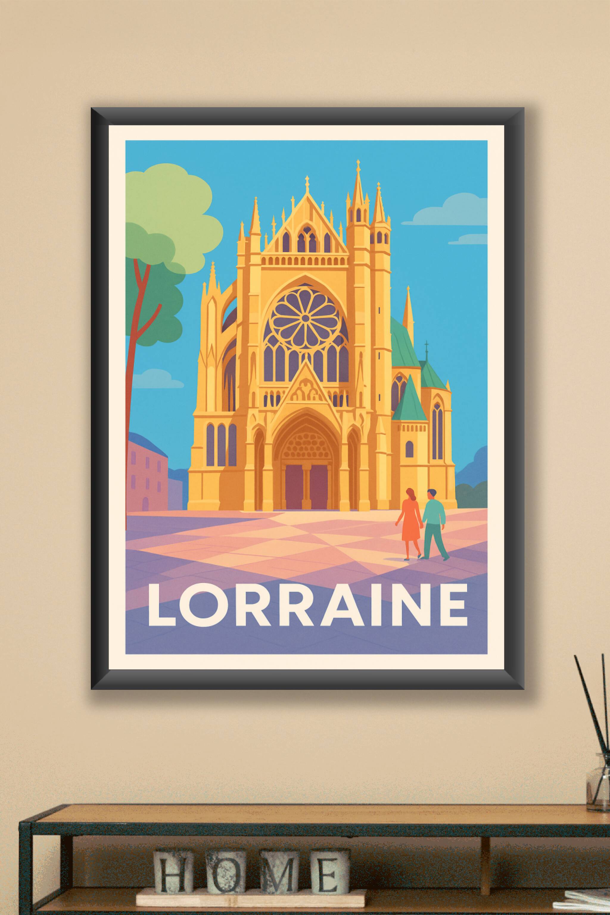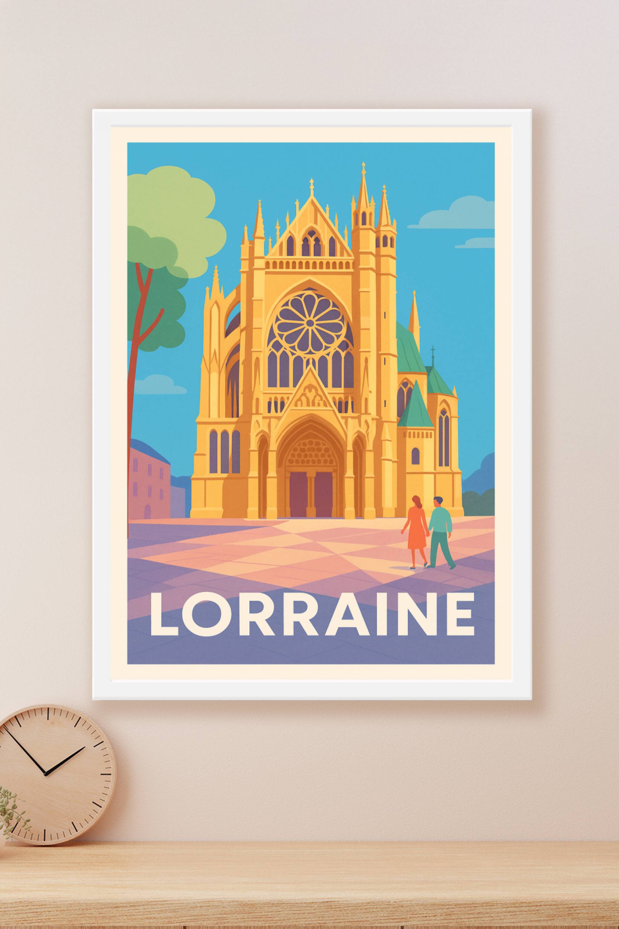 Découvrez la splendeur architecturale de la Lorraine à travers cette affiche illustrée mettant en avant une cathédrale gothique. Ce poster mêle cou...