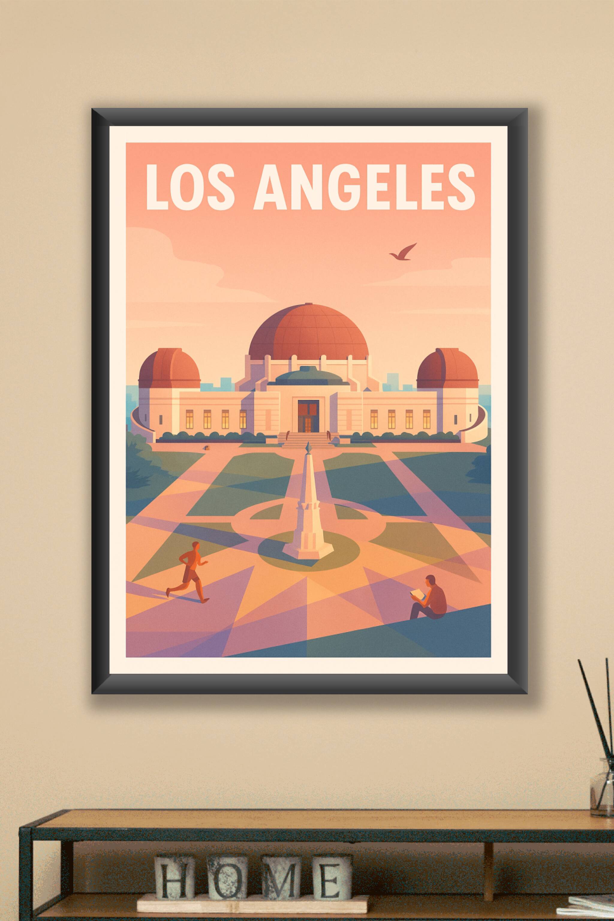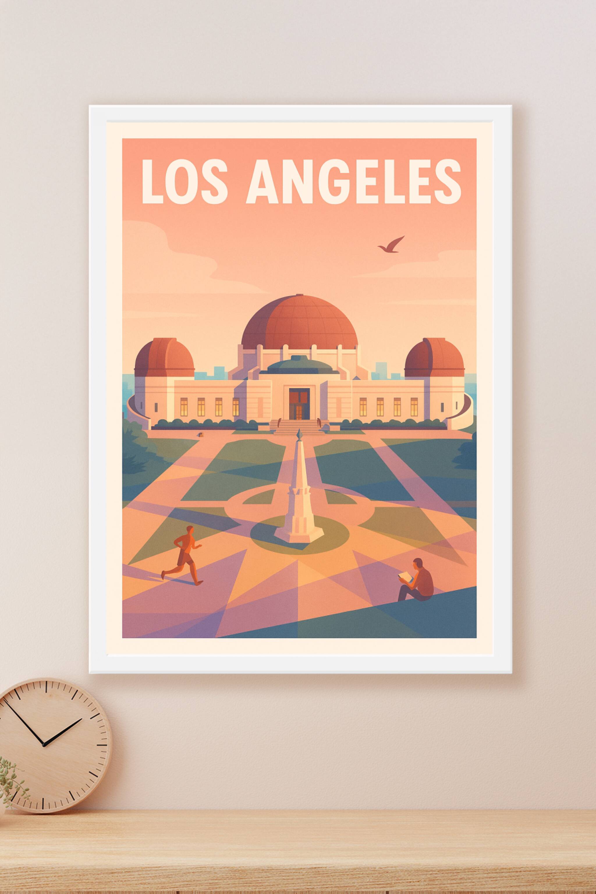 Découvrez la beauté emblématique de Los Angeles avec cette affiche illustrée au style rétro, mettant en scène le célèbre Griffith Observatory baign...