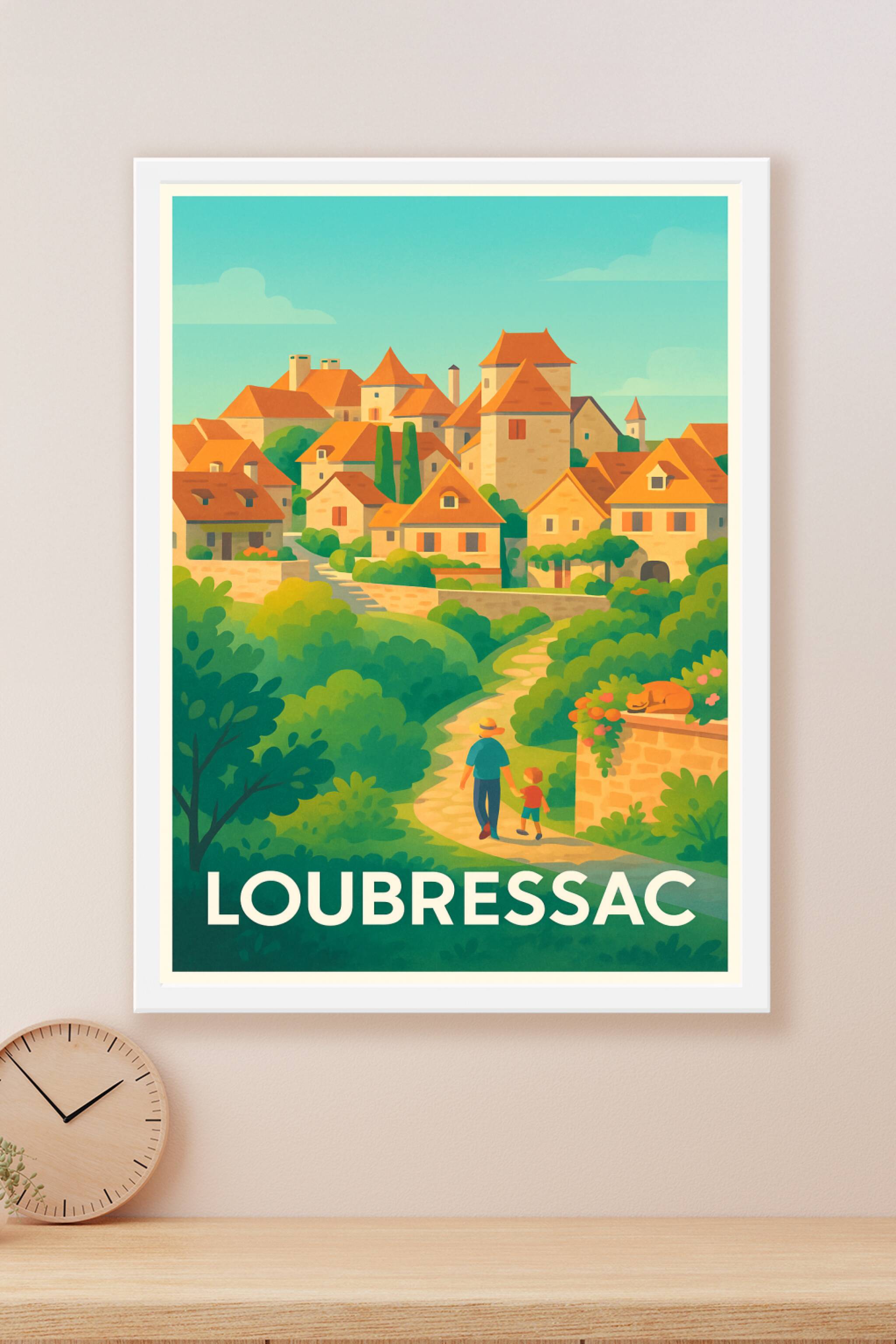 Découvrez la beauté paisible du village de Loubressac à travers cette affiche illustrée au style doux et vintage. Ce poster vous plonge dans un paysage enchanteur où maisons de pierre et toits orange se mêlent harmonieusement aux collines verdoyantes. Parfait pour apporter une touche chaleureuse et authentique à votre décoration intérieure, cette affiche est proposée en tirage "Fine Art" de haute qualité sur papier 305g coton, garantissant des couleurs éclatantes et une texture agréable au toucher. Disponible en formats A1 à A4, avec ou sans cadre, ce poster s'adapte à tous vos espaces et envies. Offrez-vous un morceau de ce village plein de charme ou un cadeau original pour les amoureux de la France profonde, avec un produit fabriqué en France et au rendu premium.