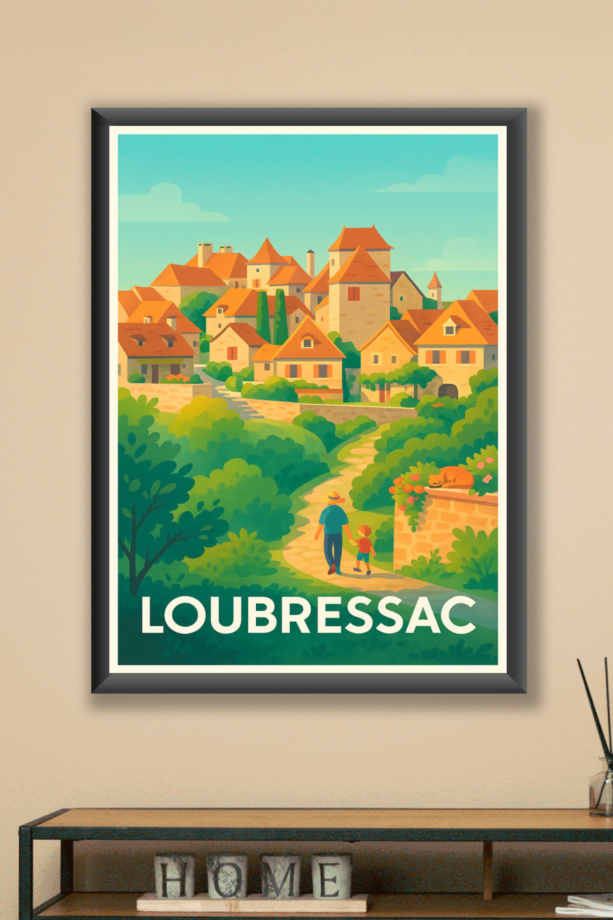 Découvrez la beauté paisible du village de Loubressac à travers cette affiche illustrée au style doux et vintage. Ce poster vous plonge dans un pay...