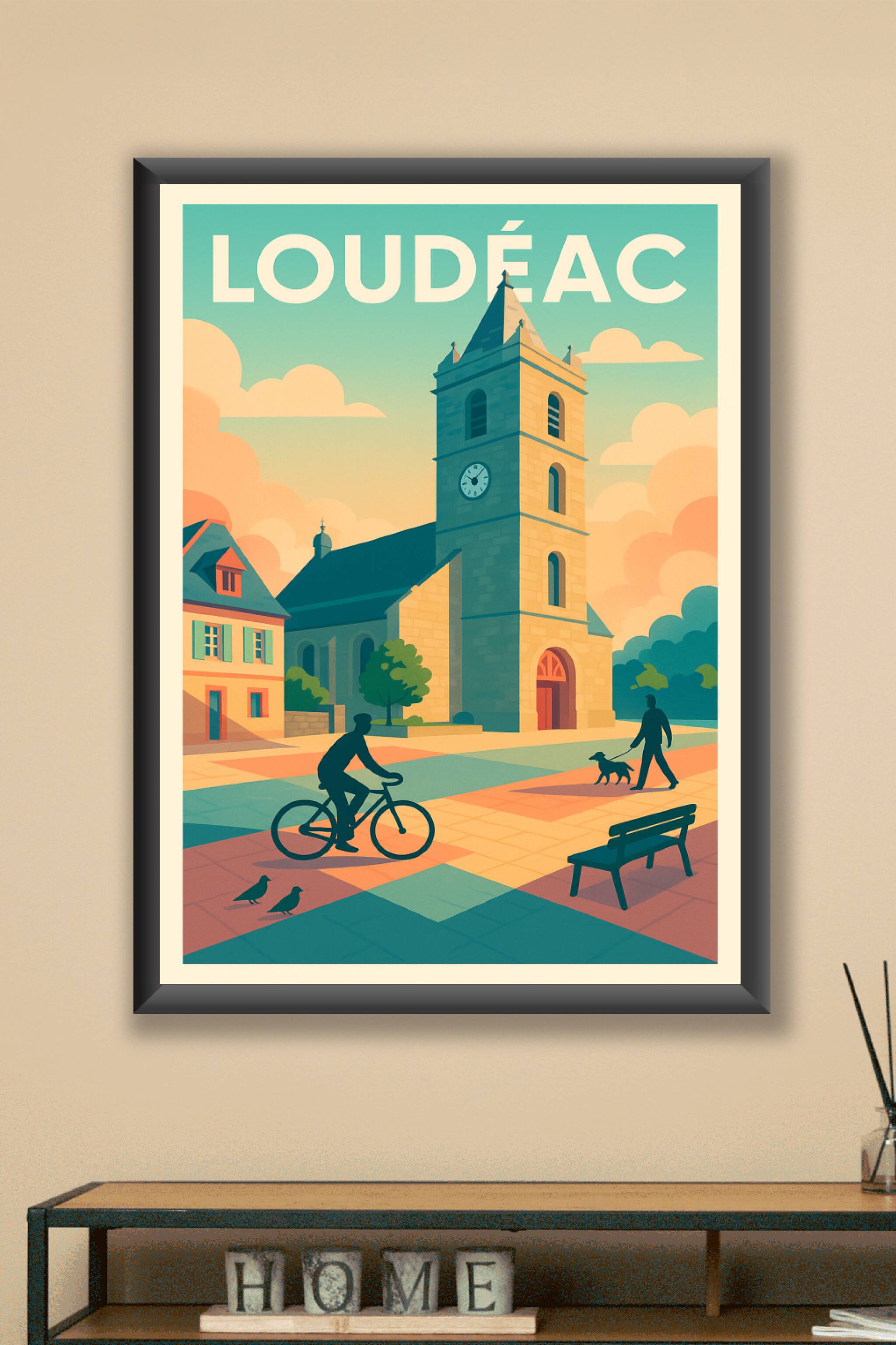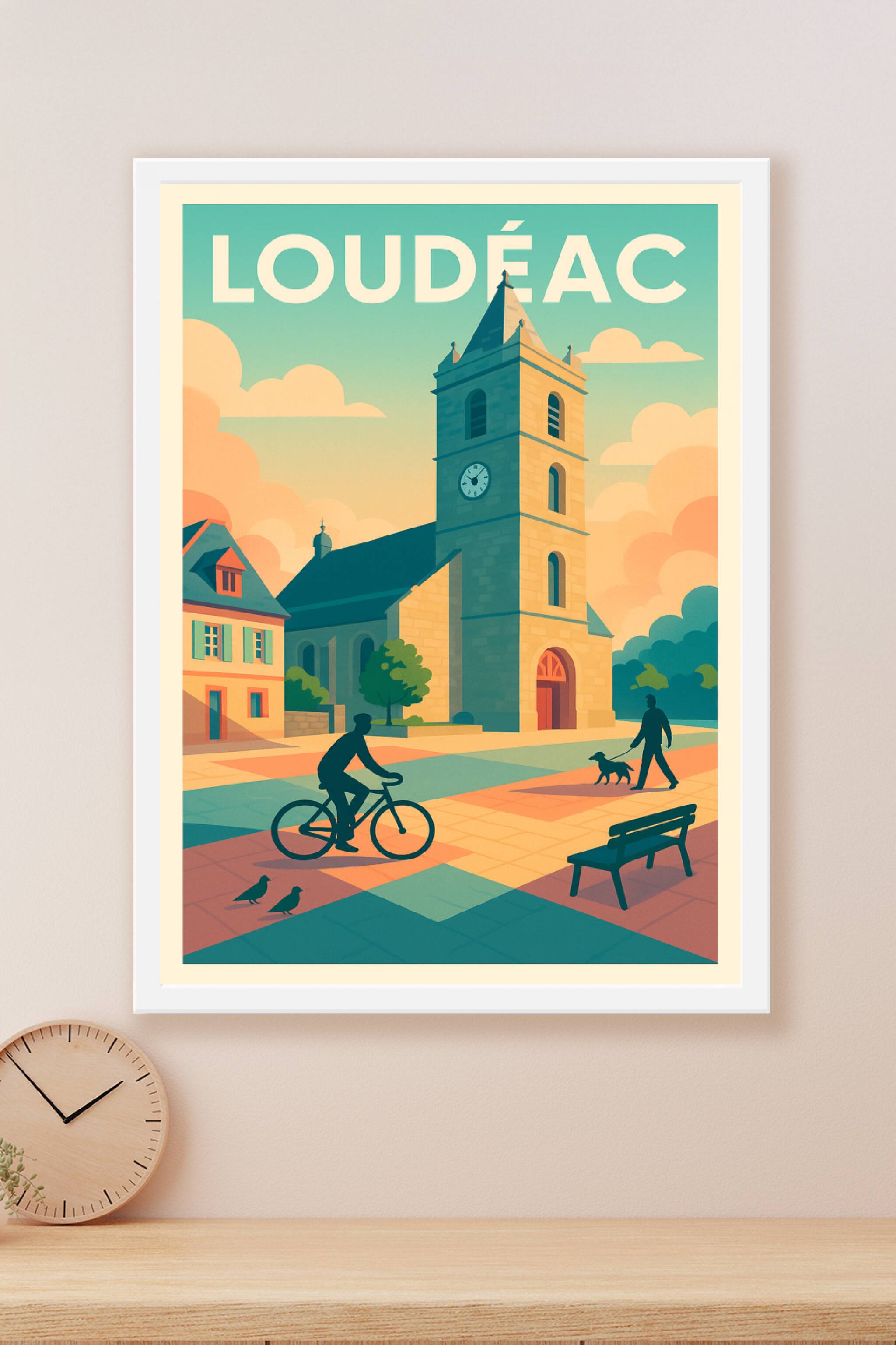 Découvrez l'atmosphère paisible et chaleureuse de Loudéac avec cette affiche illustrée mettant en avant son architecture typique et son ambiance co...