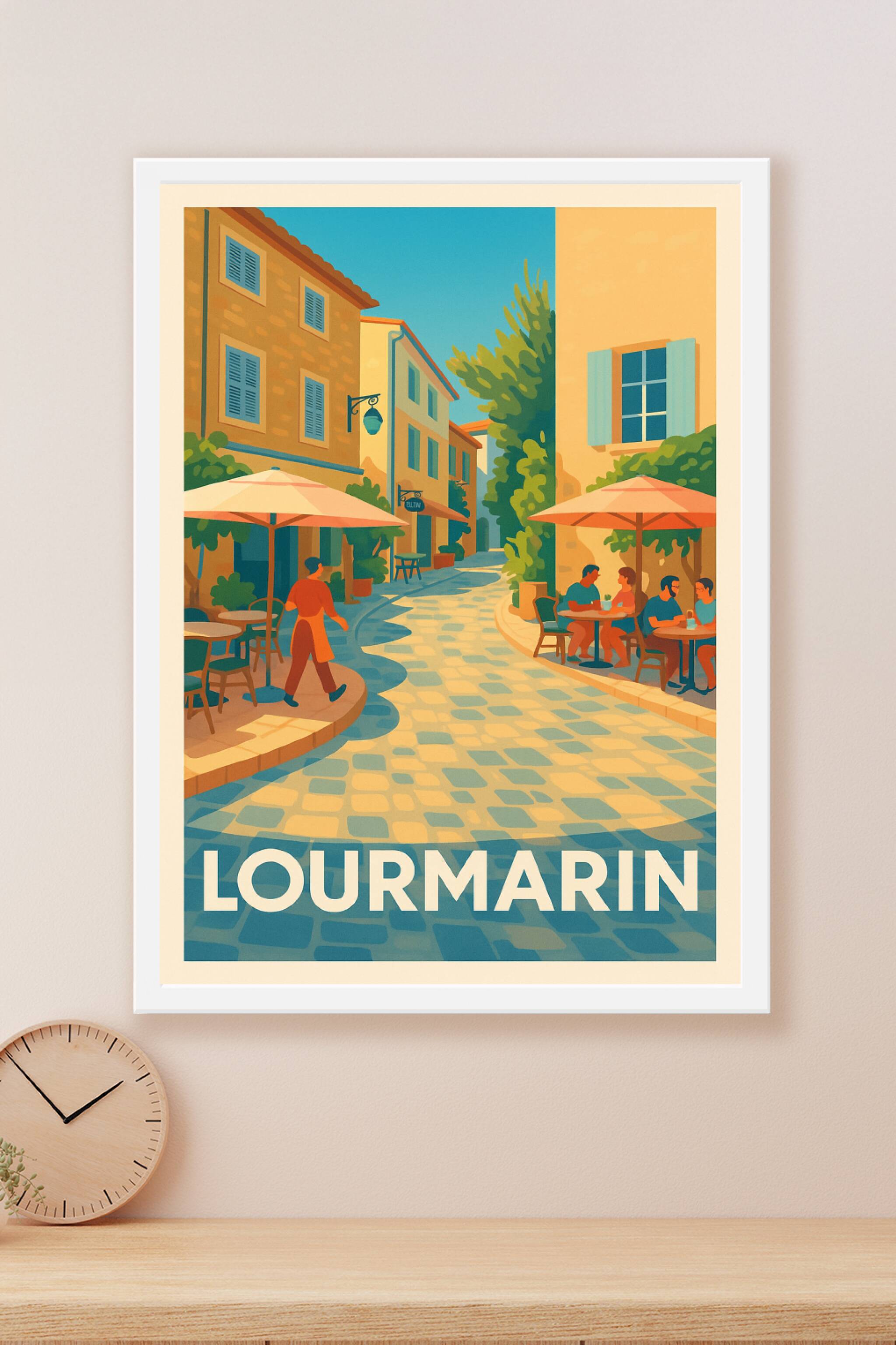 Découvrez le doux charme de Lourmarin, ce village provençal où le soleil caresse les ruelles pavées. Cette affiche au style illustré et coloré vous...