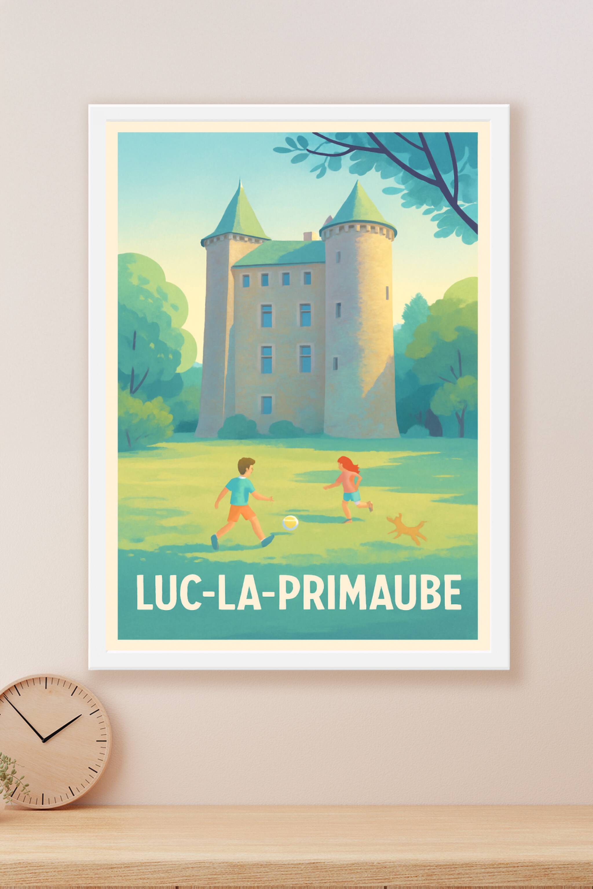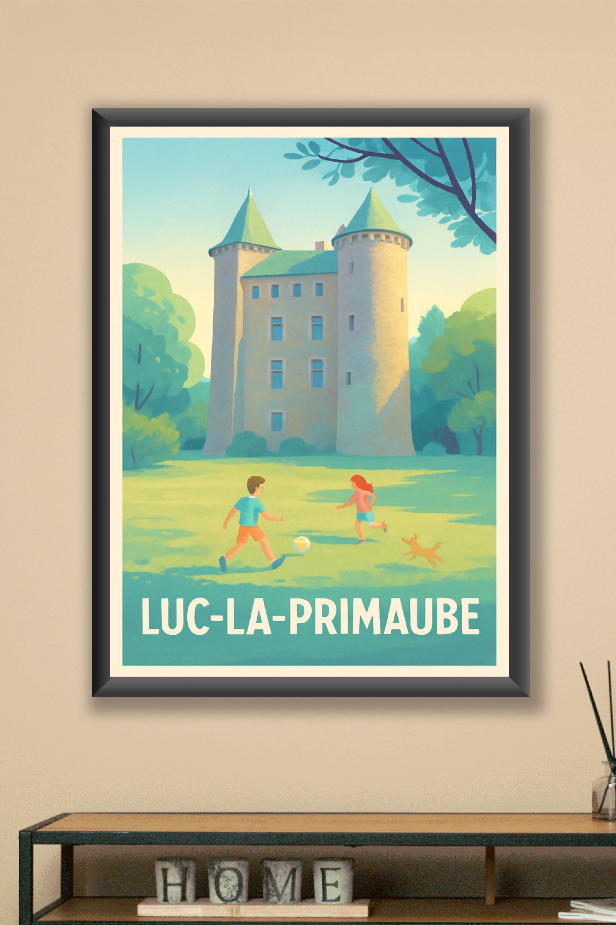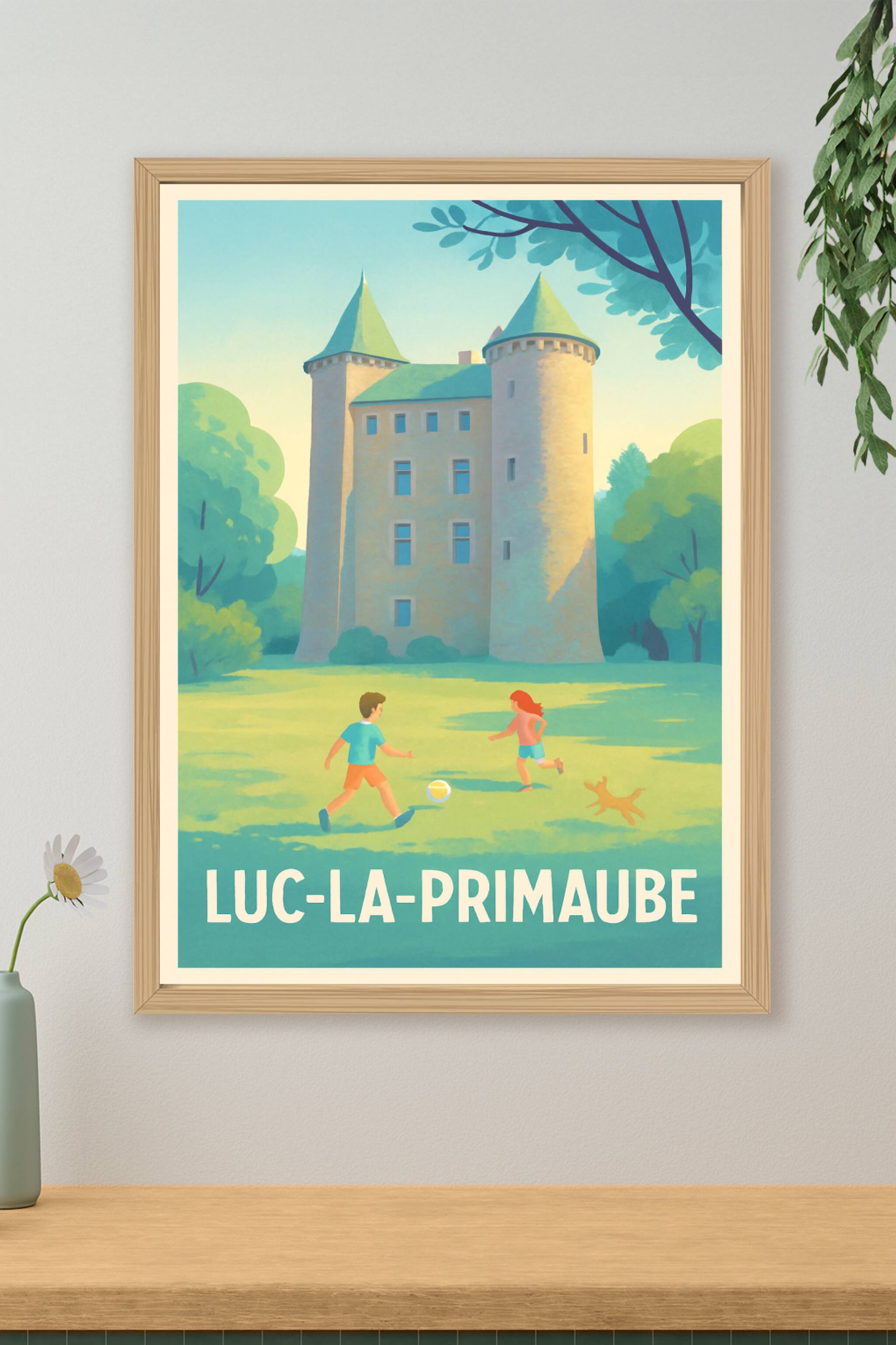Découvrez l'atmosphère paisible et enchantée de Luc-la-Primaube à travers cette affiche illustrée mettant en scène un château aux allures de conte ...