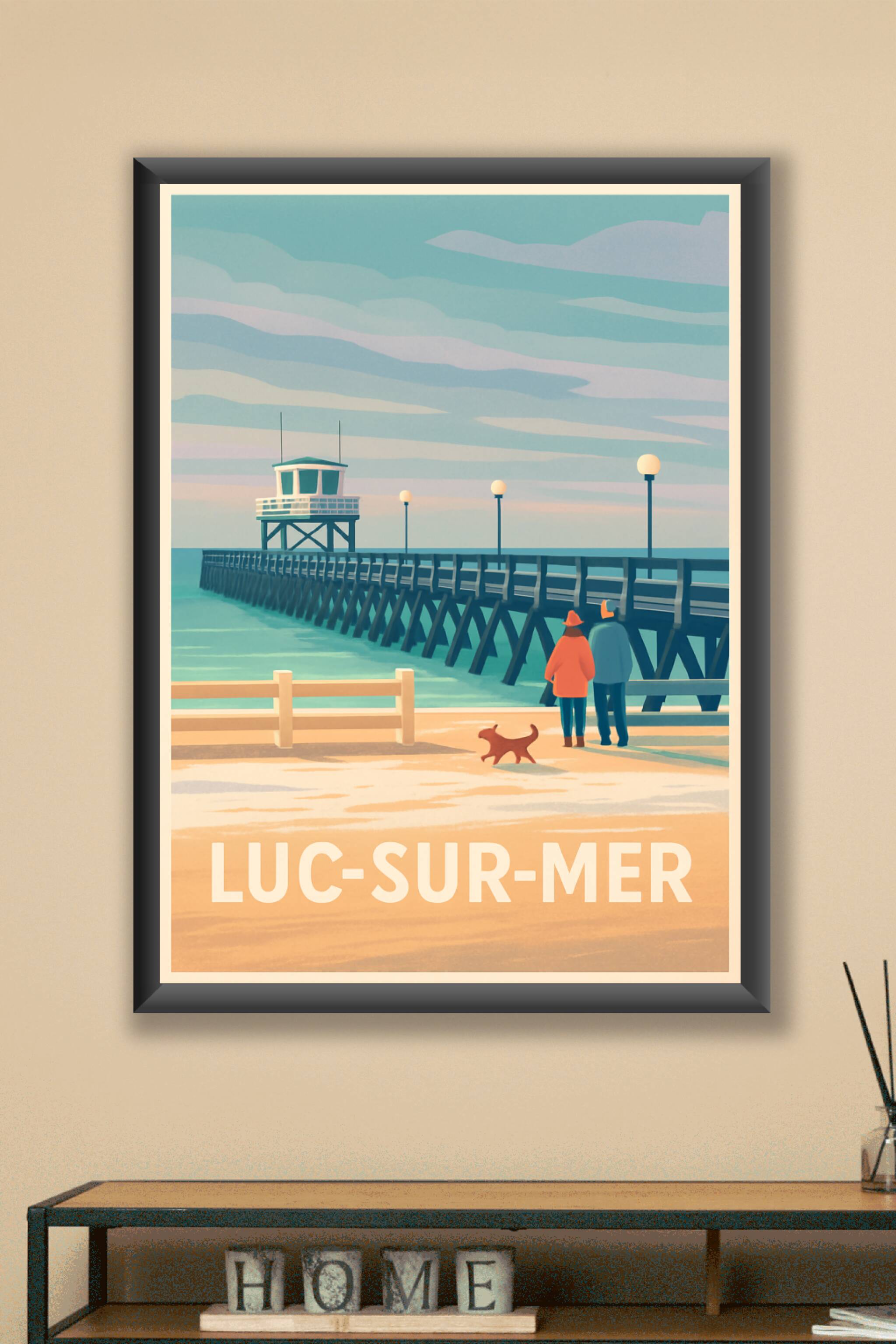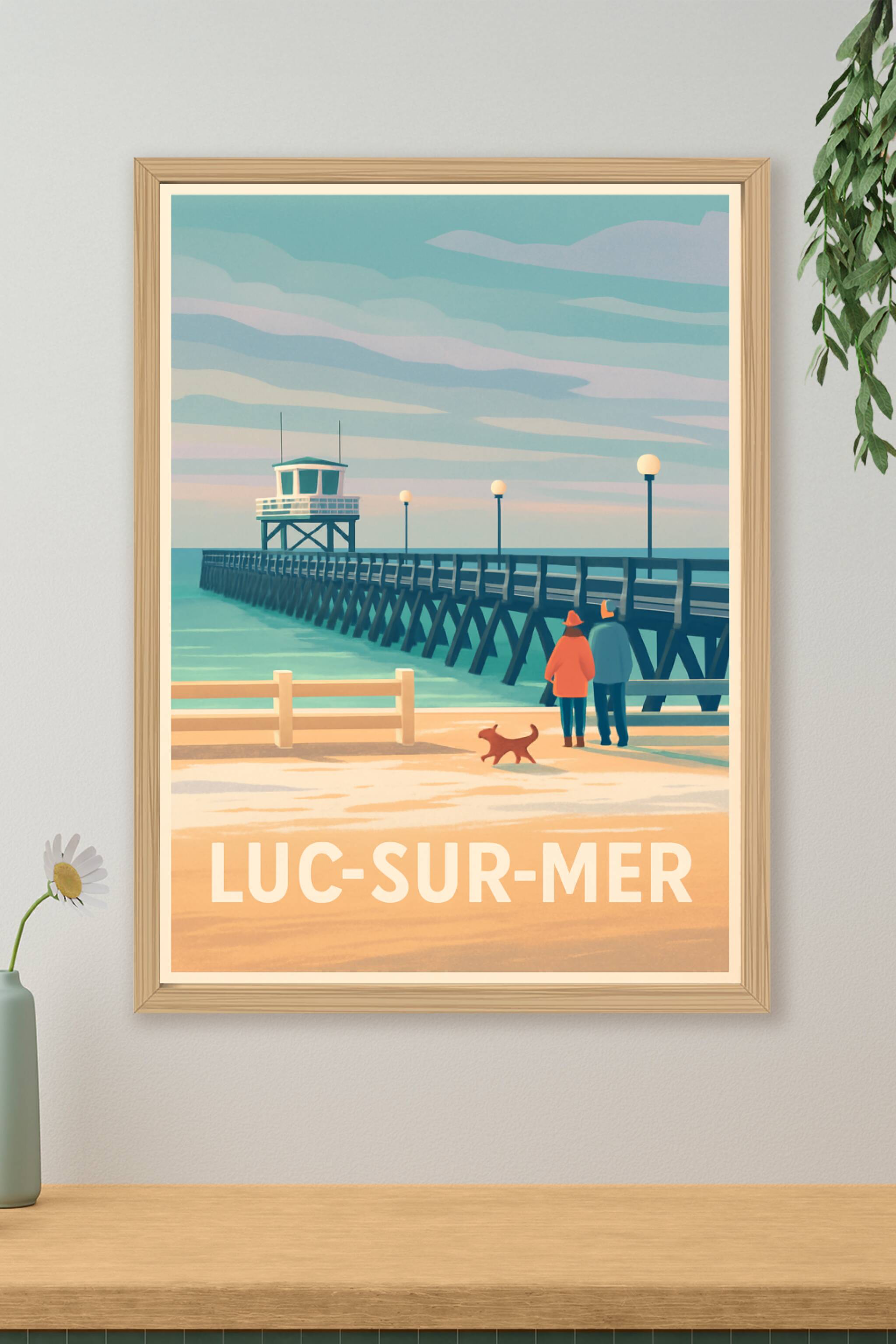 Découvrez la douceur et la tranquillité de Luc-sur-Mer à travers cette affiche illustrée qui capture le charme de sa jetée emblématique. Un couple ...