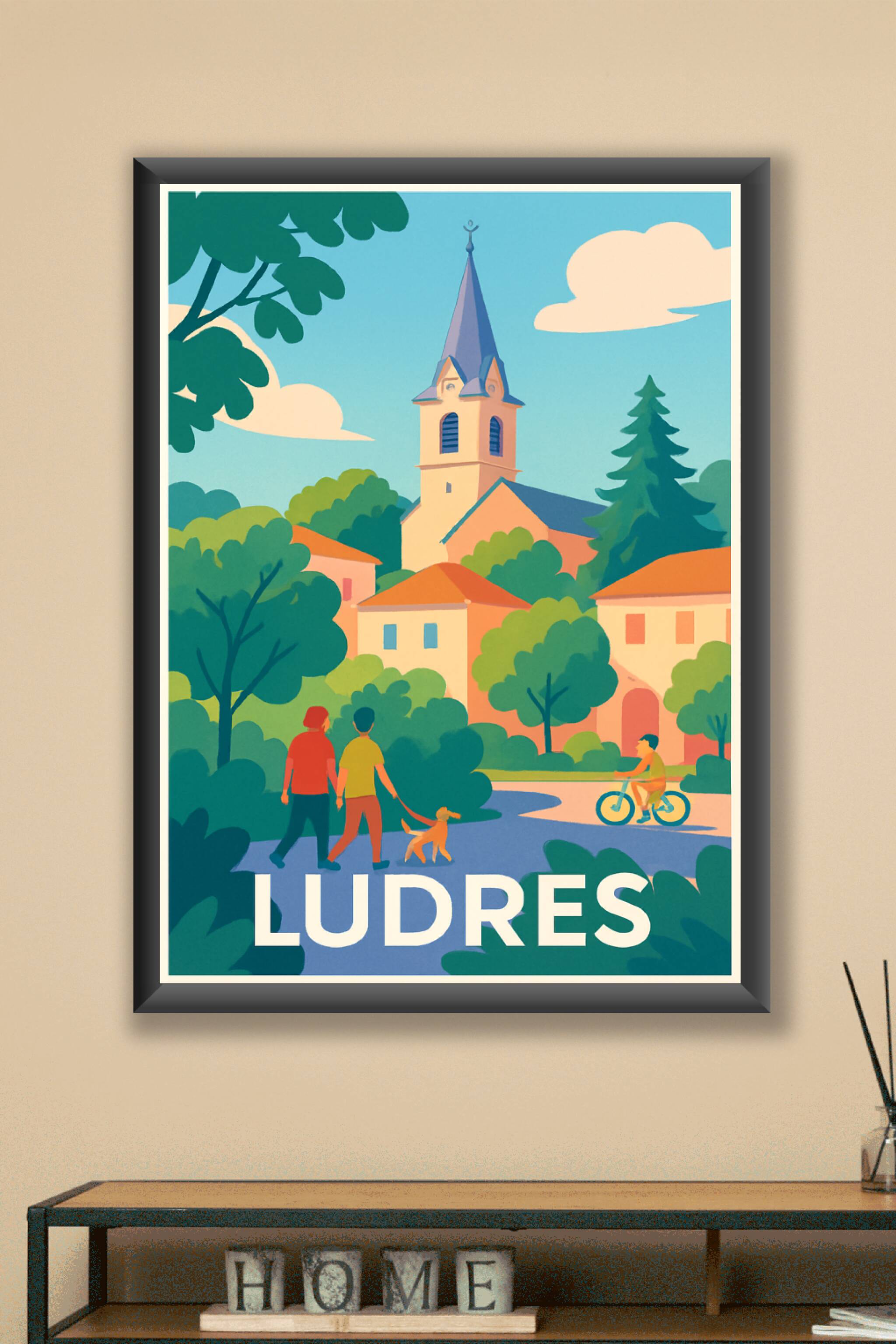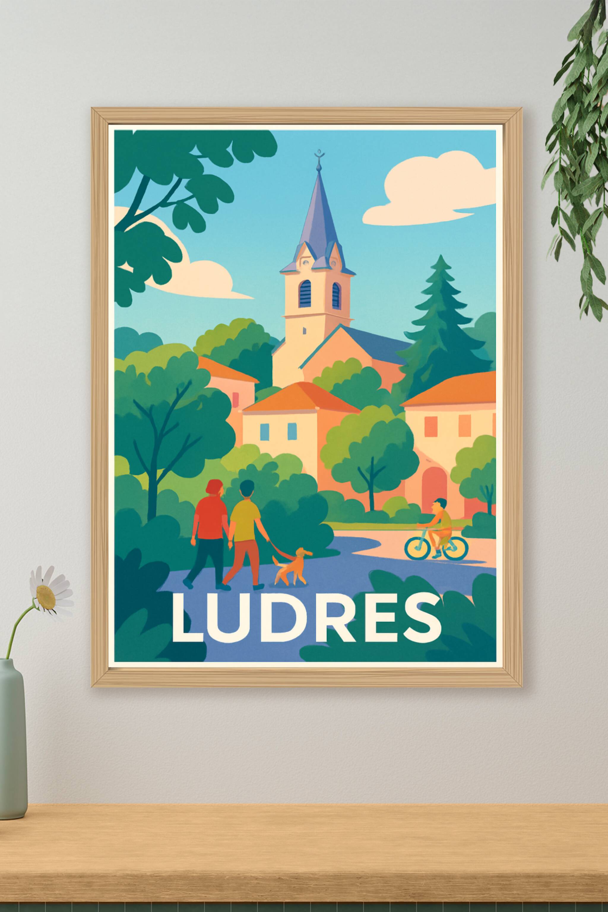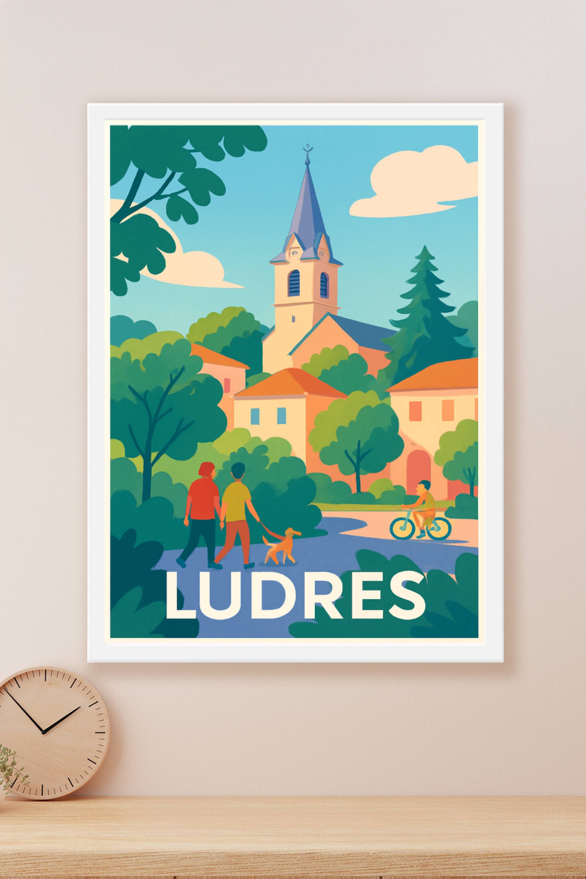 Découvrez le calme et la douceur de vivre de Ludres à travers cette affiche élégante et colorée. Ce poster illustre un village serein aux maisons c...