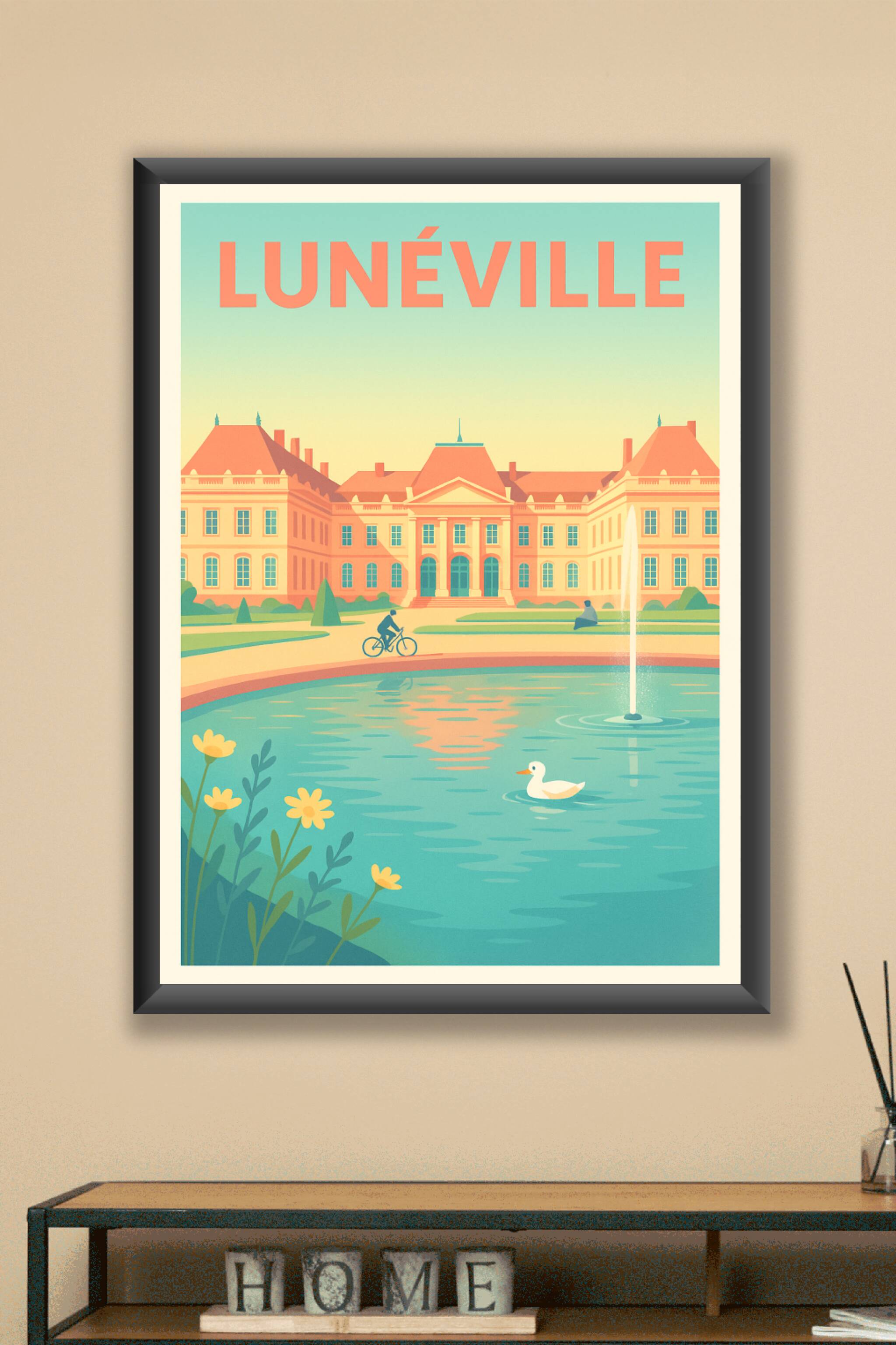 Découvrez la douceur de vivre en Lorraine avec cette affiche représentant le Château de Lunéville, sublimé par un style graphique doux et rétro. Un poster qui capture la tranquillité des jardins et la majesté de l'architecture classique, avec un cycliste qui parcourt la scène, un canard qui nage paisiblement dans la fontaine, et des couleurs apaisantes qui invitent au rêve.Ce poster est imprimé en tirage "Fine Art" sur papier 305g coton, garantissant une qualité d'impression exceptionnelle et des couleurs durables. Disponible en plusieurs formats, de l'A4 à l'A1, avec ou sans cadre, il s'intègre parfaitement à tout type de décoration intérieure.Ajoutez une touche élégante et historique à votre maison ou offrez un souvenir raffiné de cette belle ville grâce à cette affiche de qualité premium, fabriquée en France.