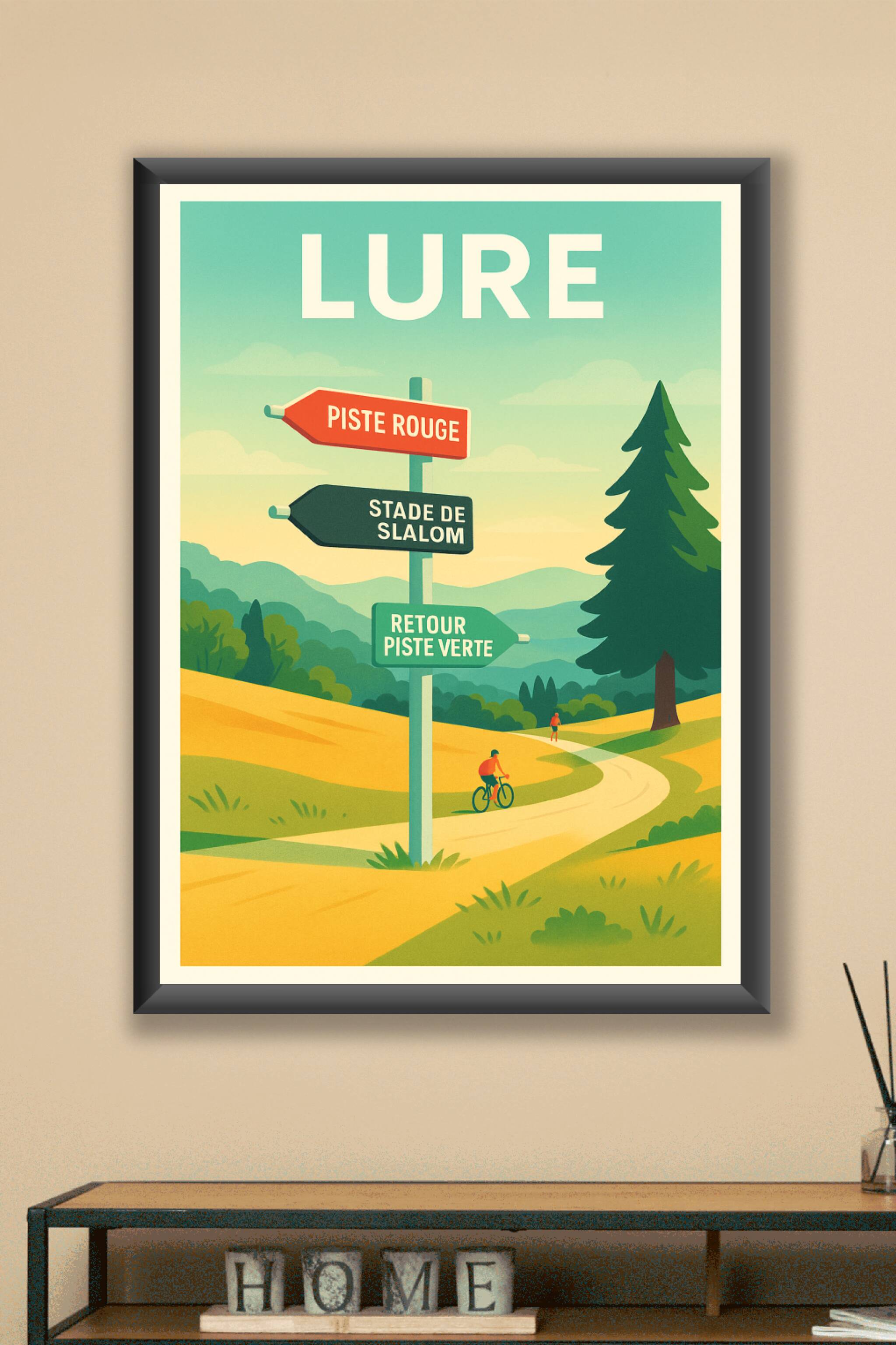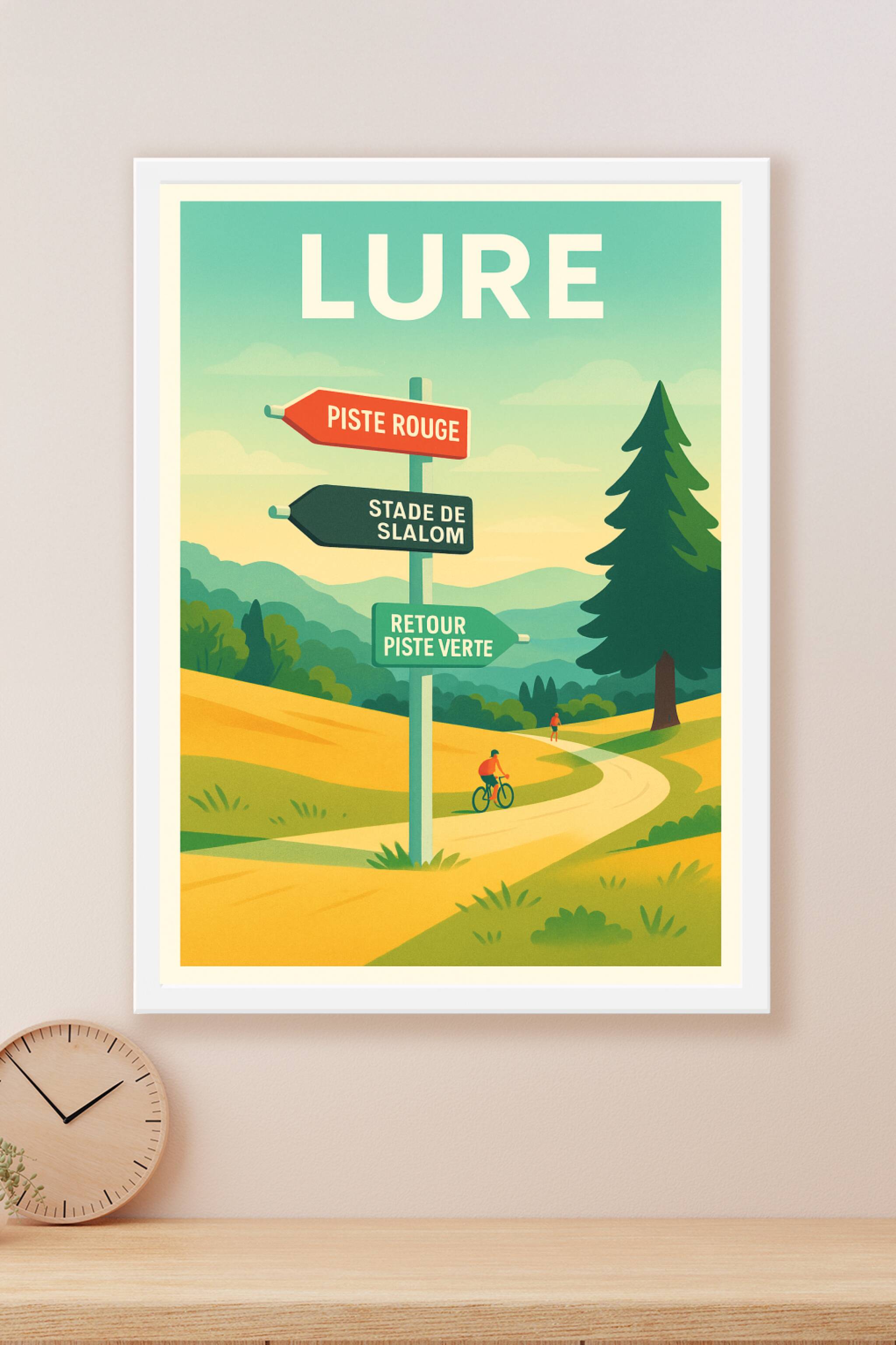 Découvrez l'esprit sportif et naturel de Lure à travers cette affiche vintage qui met en avant ses célèbres pistes et sentiers. Le poster illustre un paysage bucolique avec un cycliste sur un chemin sinueux, entouré de forêts et de collines, parfait pour les amateurs de plein air et de randonnées. Disponible en tirage Fine Art, cette affiche est imprimée sur un papier coton 305g de haute qualité, garantissant des couleurs éclatantes et une durabilité exceptionnelle. Choisissez parmi les formats A1 à A4, avec ou sans cadre, pour embellir votre intérieur ou offrir un souvenir unique aux passionnés d'aventure. Profitez d'une impression française premium qui sublime chaque détail de cette illustration inspirante.