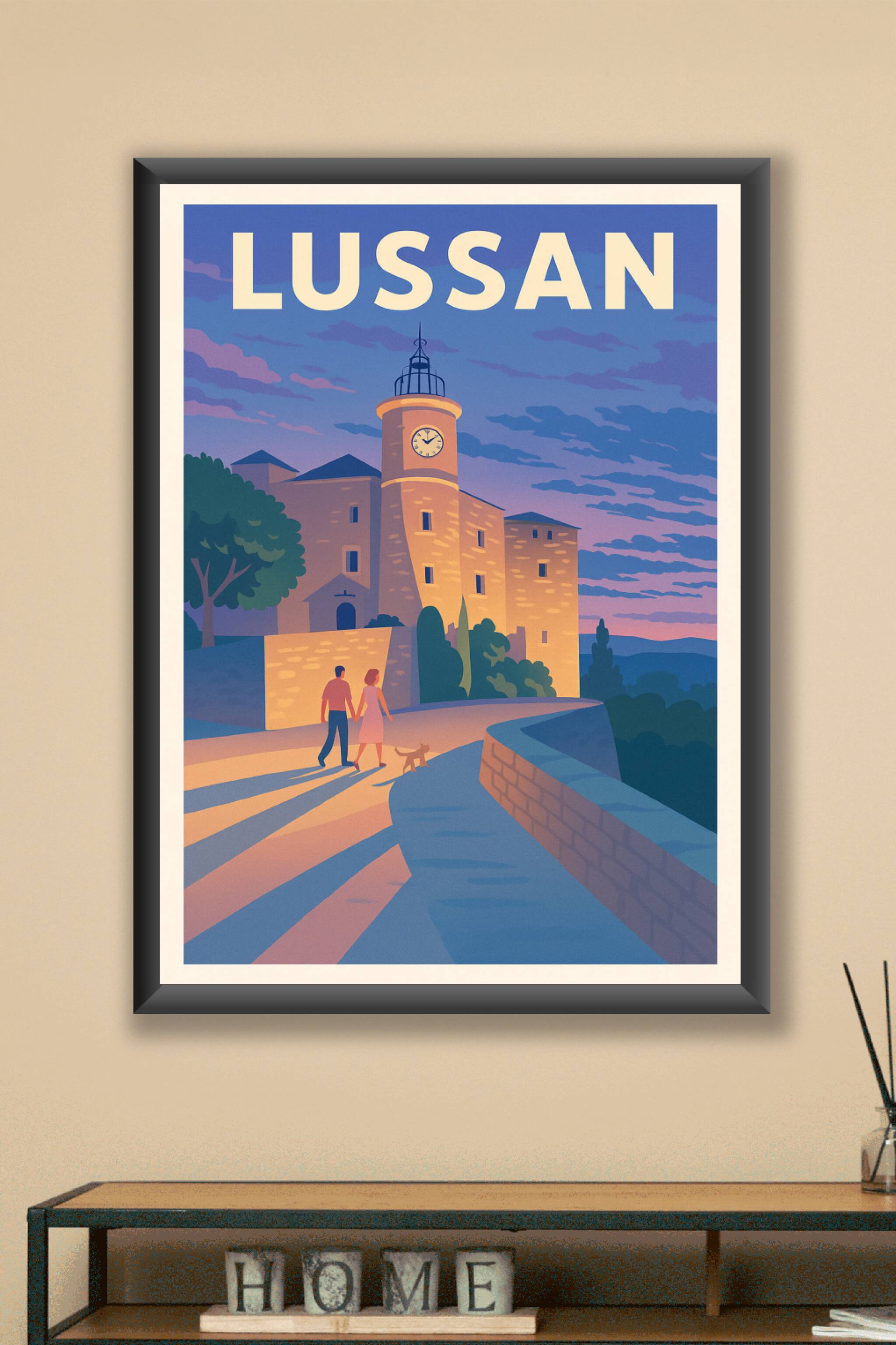 Découvrez la douceur du soir à Lussan avec ce poster illustré mettant en lumière son architecture emblématique et ses ruelles baignées dans une lum...
