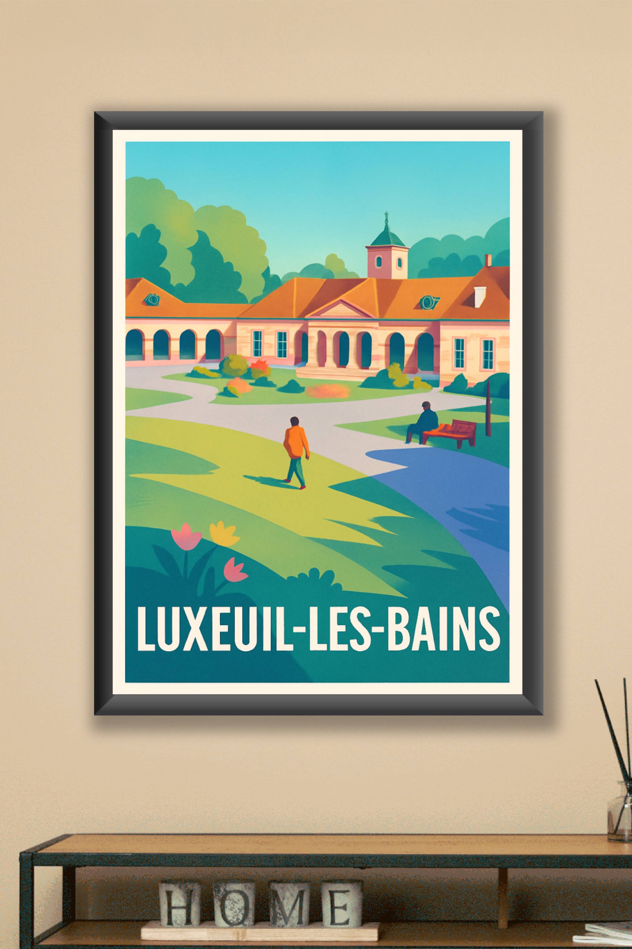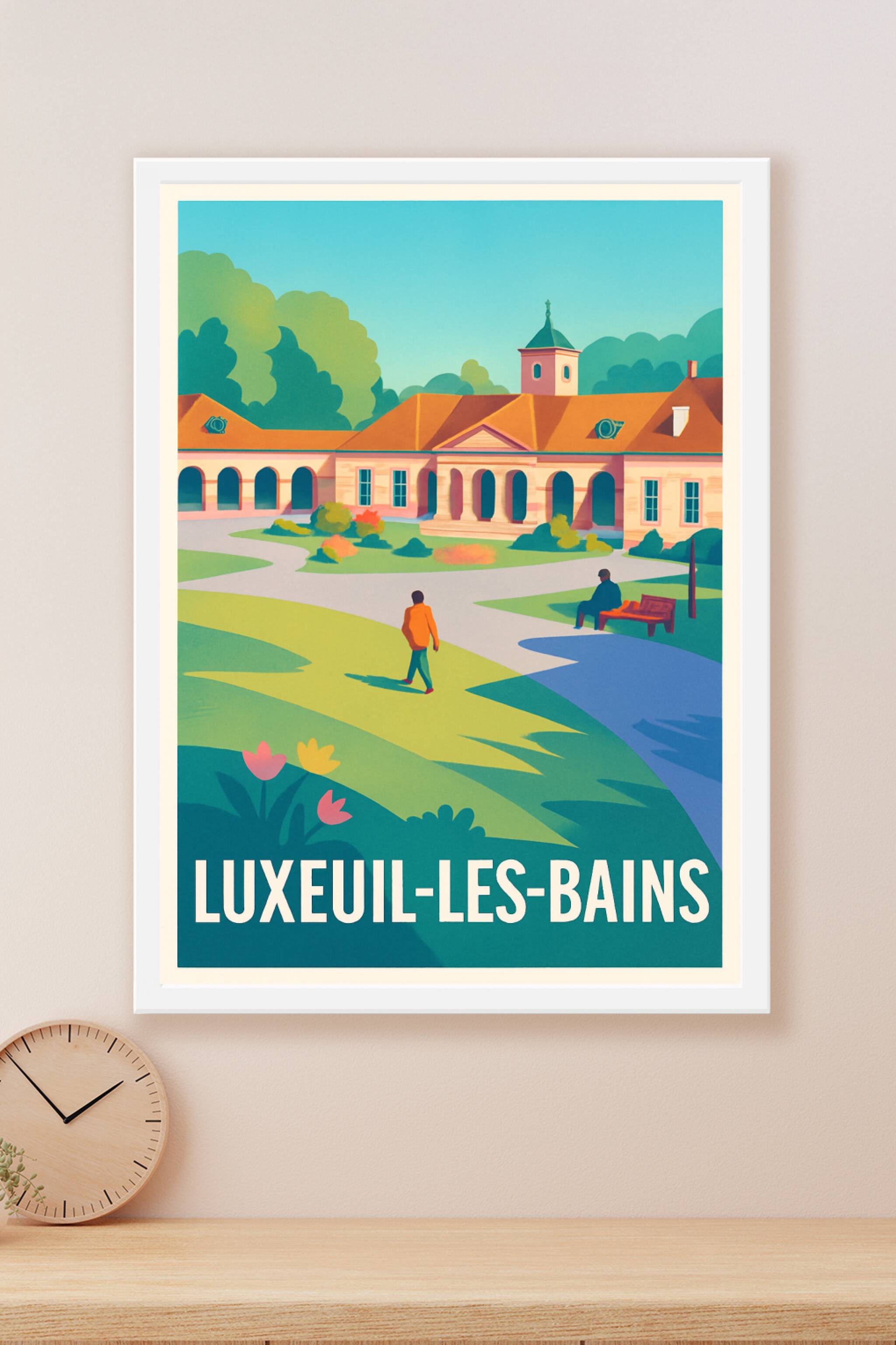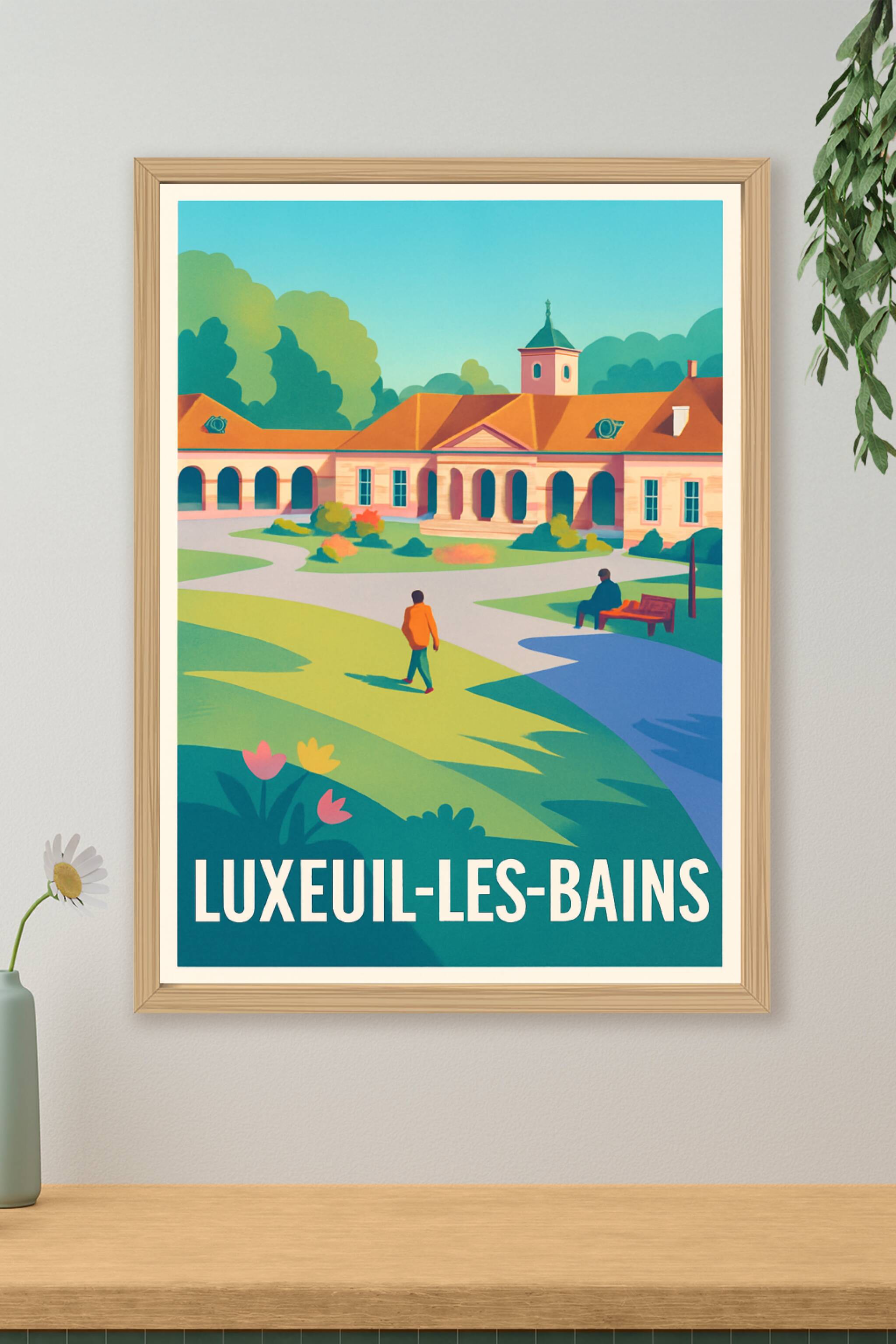 Découvrez le charme apaisant de Luxeuil-les-Bains avec cette affiche illustrée aux couleurs douces et lumineuses. Le poster met en scène la tranqui...