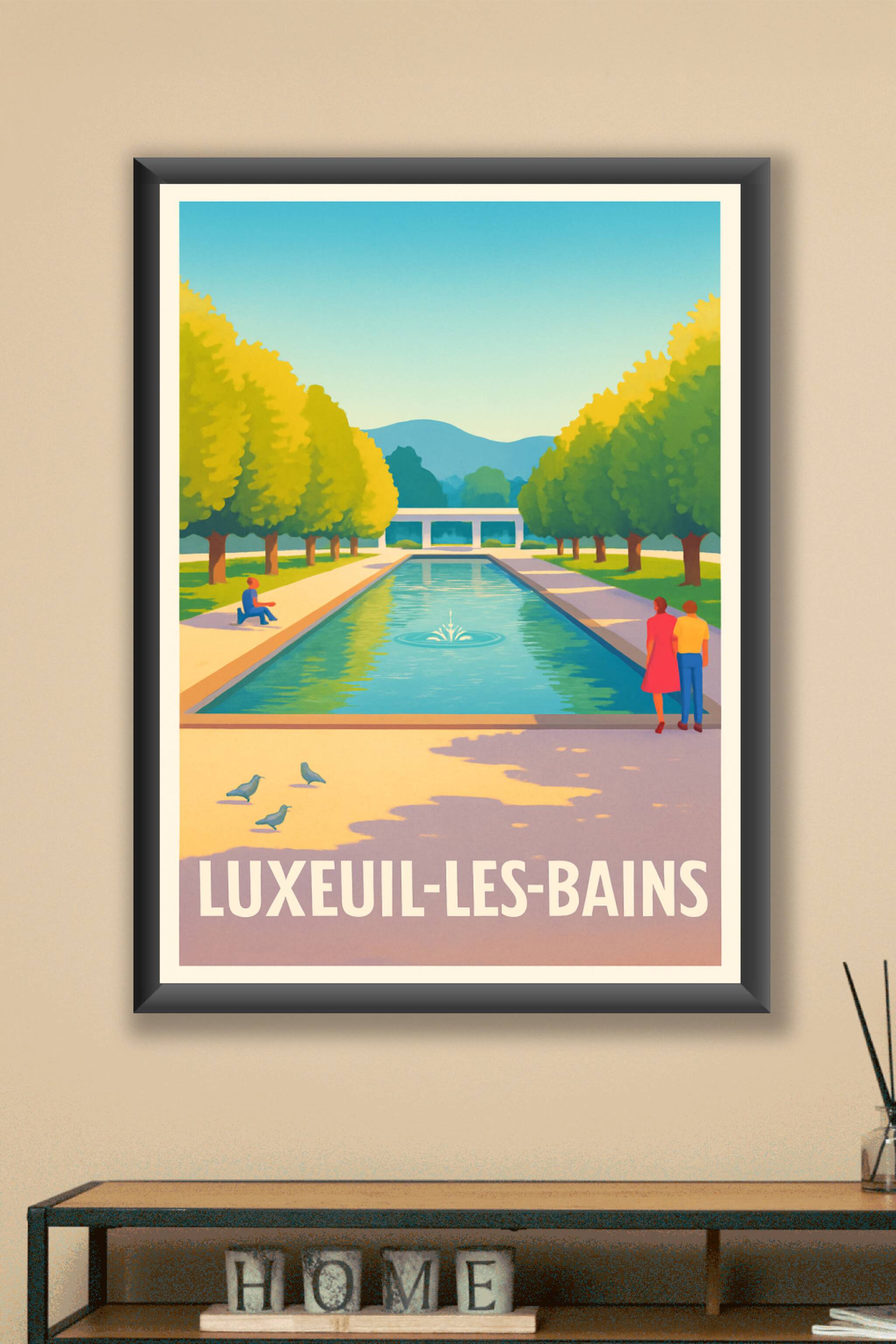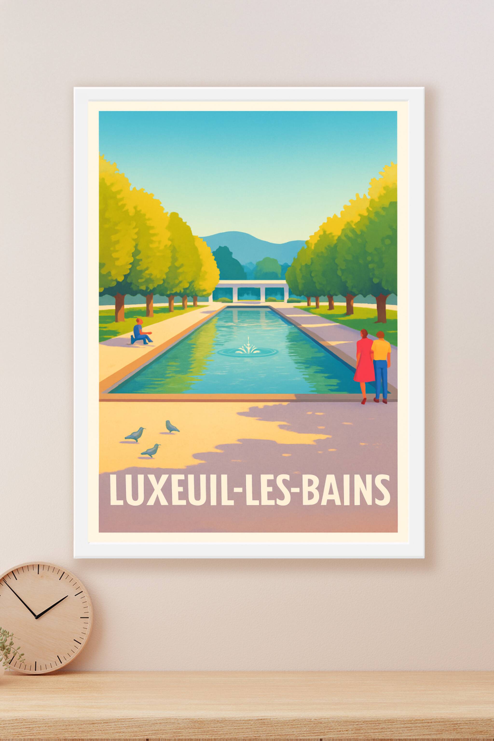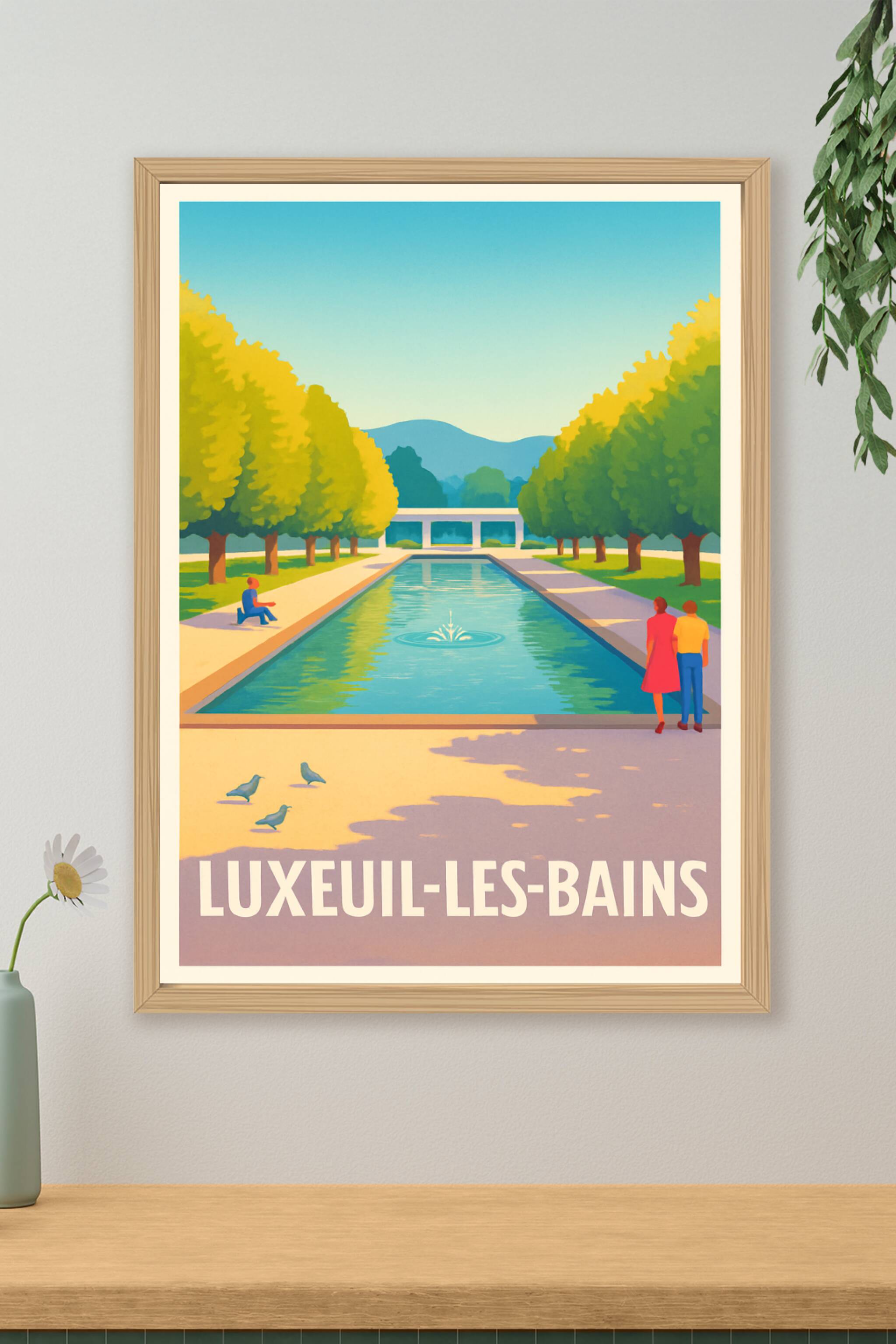 Découvrez l'élégance paisible de Luxeuil-les-Bains avec cette affiche illustrée mettant en scène un jardin arboré bordant un bassin central, symbol...