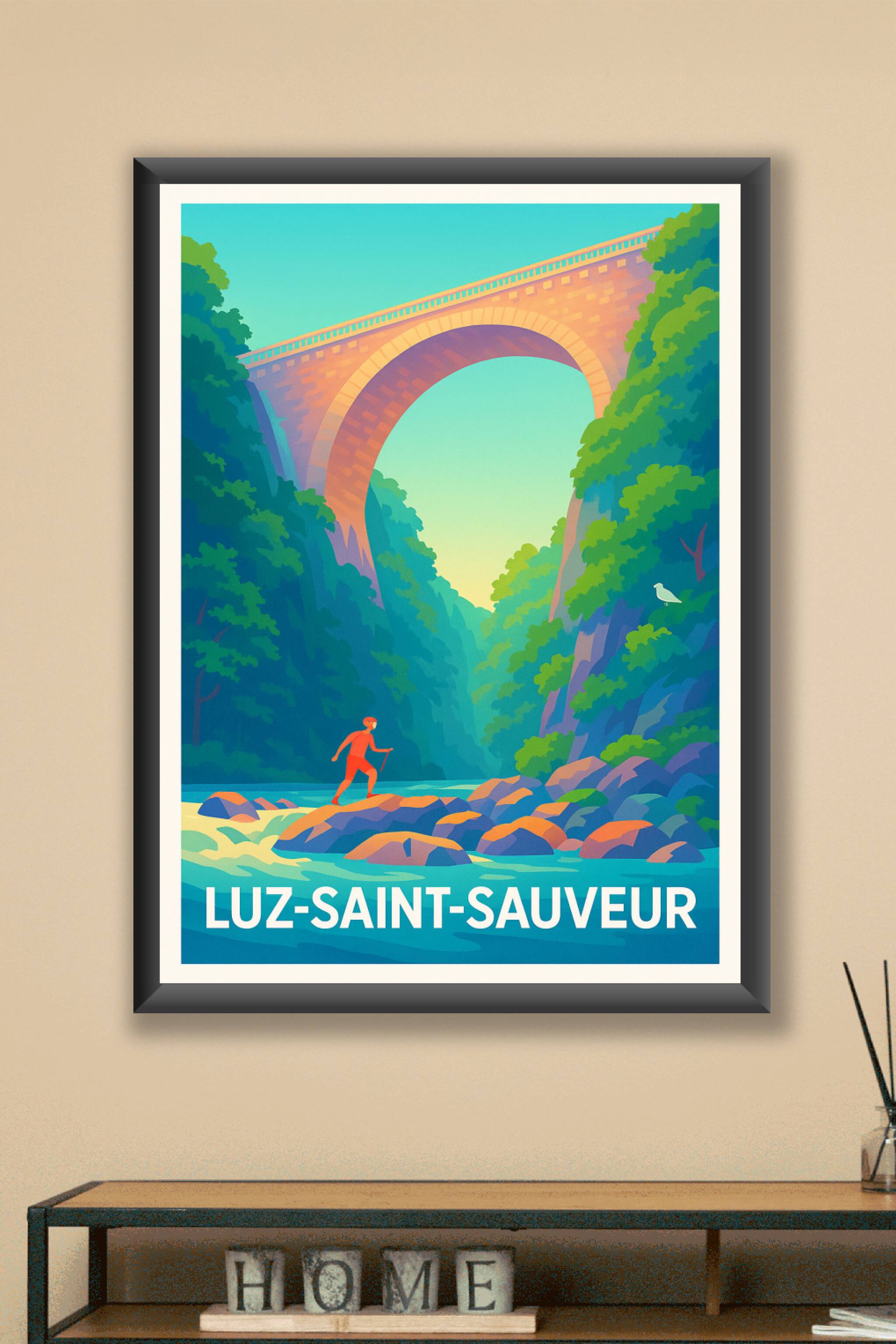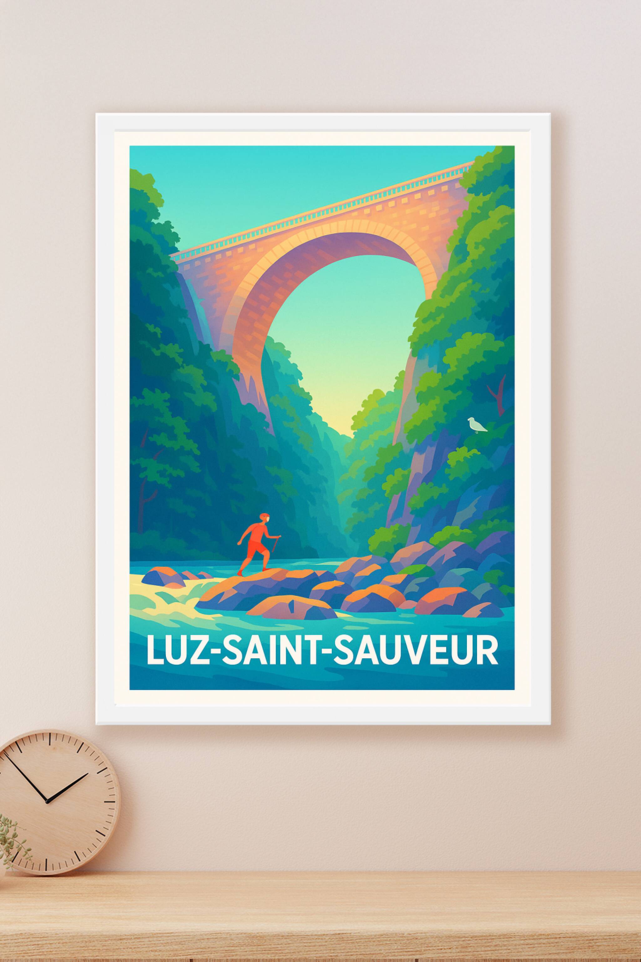Découvrez la beauté sauvage et apaisante de Luz-Saint-Sauveur avec cette affiche illustrée mettant en scène un ravissant pont en pierre surplombant...
