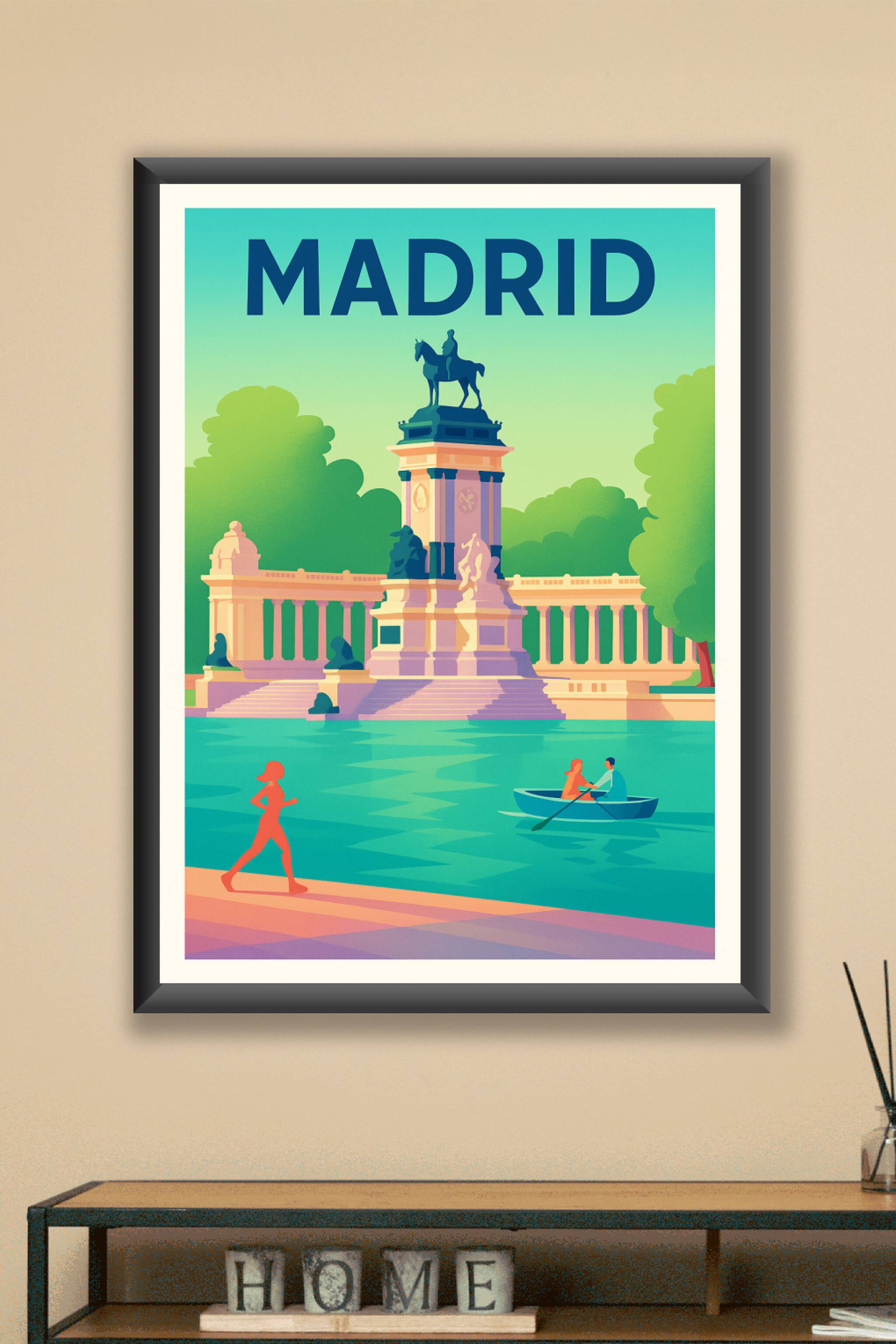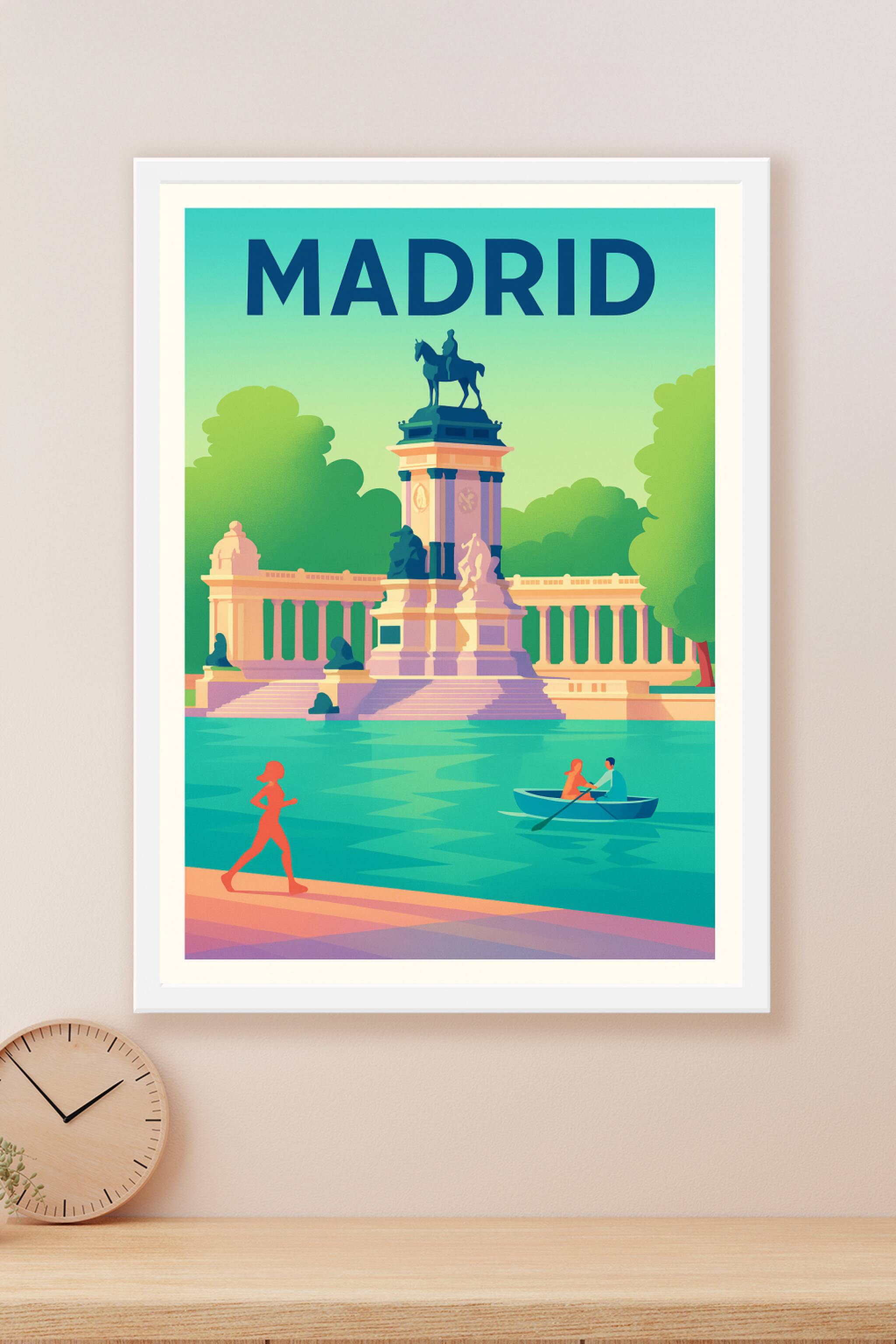 Découvrez l'atmosphère paisible et colorée du parc du Retiro à Madrid avec cette affiche illustrée au style doux et moderne. Ce poster met en scène la célèbre statue équestre dans un cadre verdoyant, où les promeneurs et les barques sur le lac invitent à la détente et à la contemplation. Imprimée en tirage "Fine Art" sur un papier de coton 305g de haute qualité, cette affiche est disponible en formats A1 à A4, avec ou sans cadre, pour s'adapter à votre intérieur ou offrir un cadeau unique. Profitez d'une impression premium 100% fabriquée en France pour sublimer votre décoration avec ce poster emblématique de la capitale espagnole.
