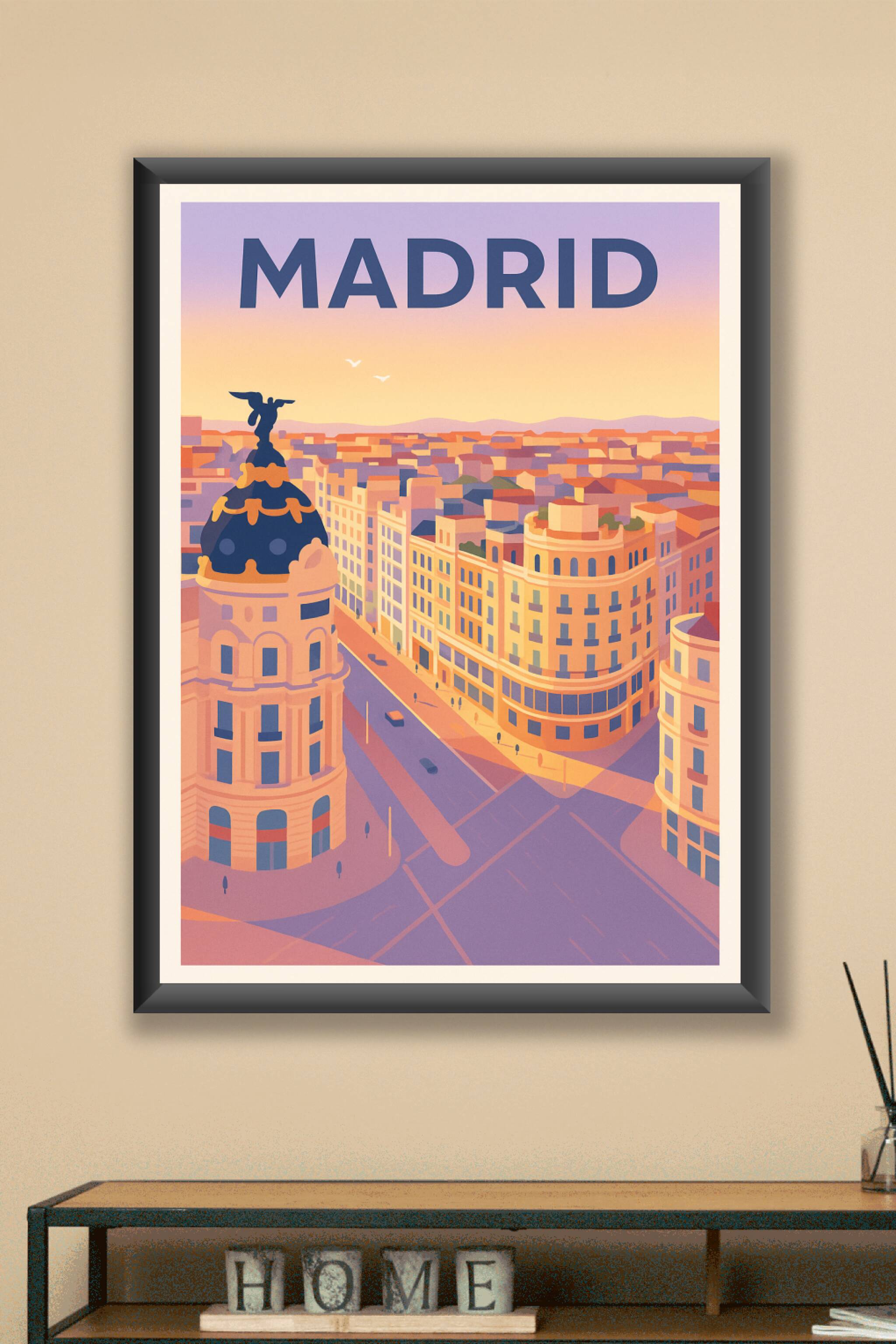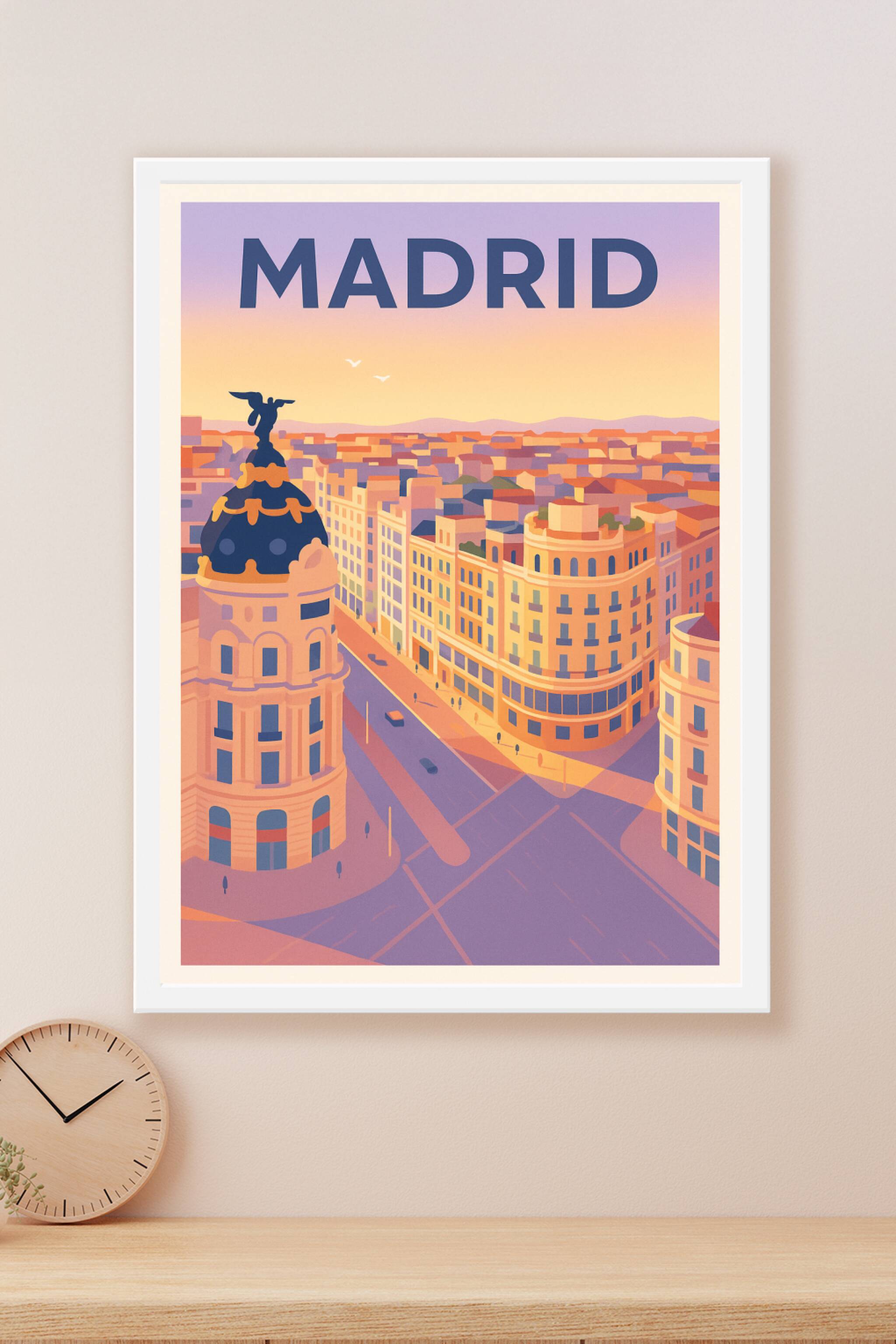 Découvrez cette affiche poster illustrant Madrid sous une lumière chaude et douce, capturant l'essence vibrante et architecturale de la ville. Les ...