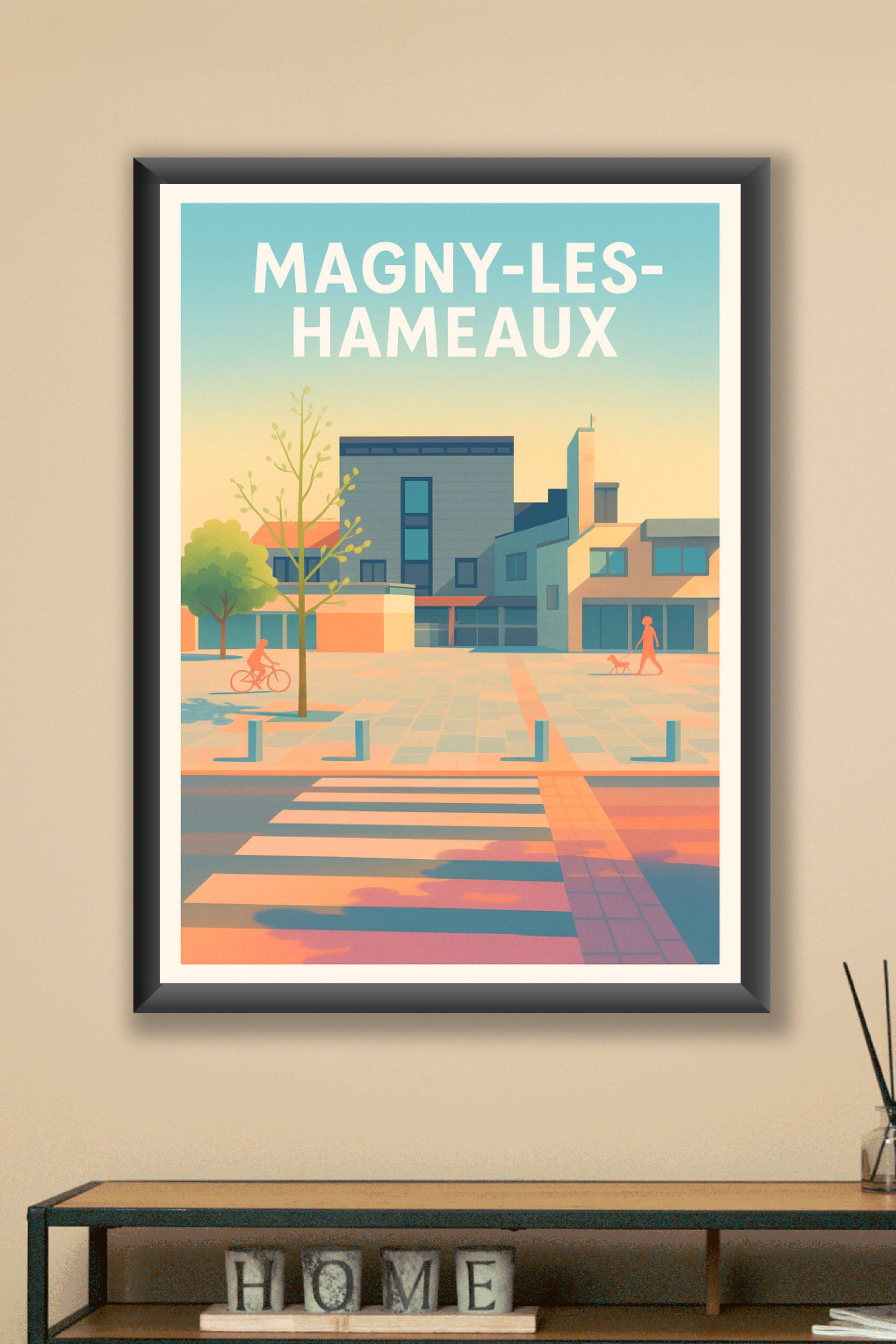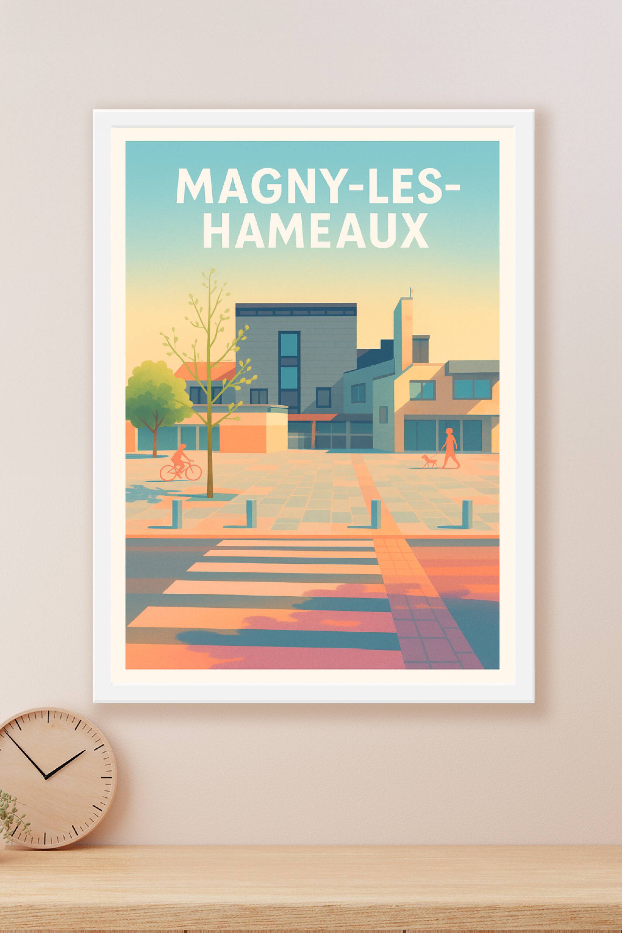 Découvrez l'ambiance paisible et moderne de Magny-les-Hameaux avec cette affiche illustrée mettant en scène une scène urbaine baignée de lumière do...