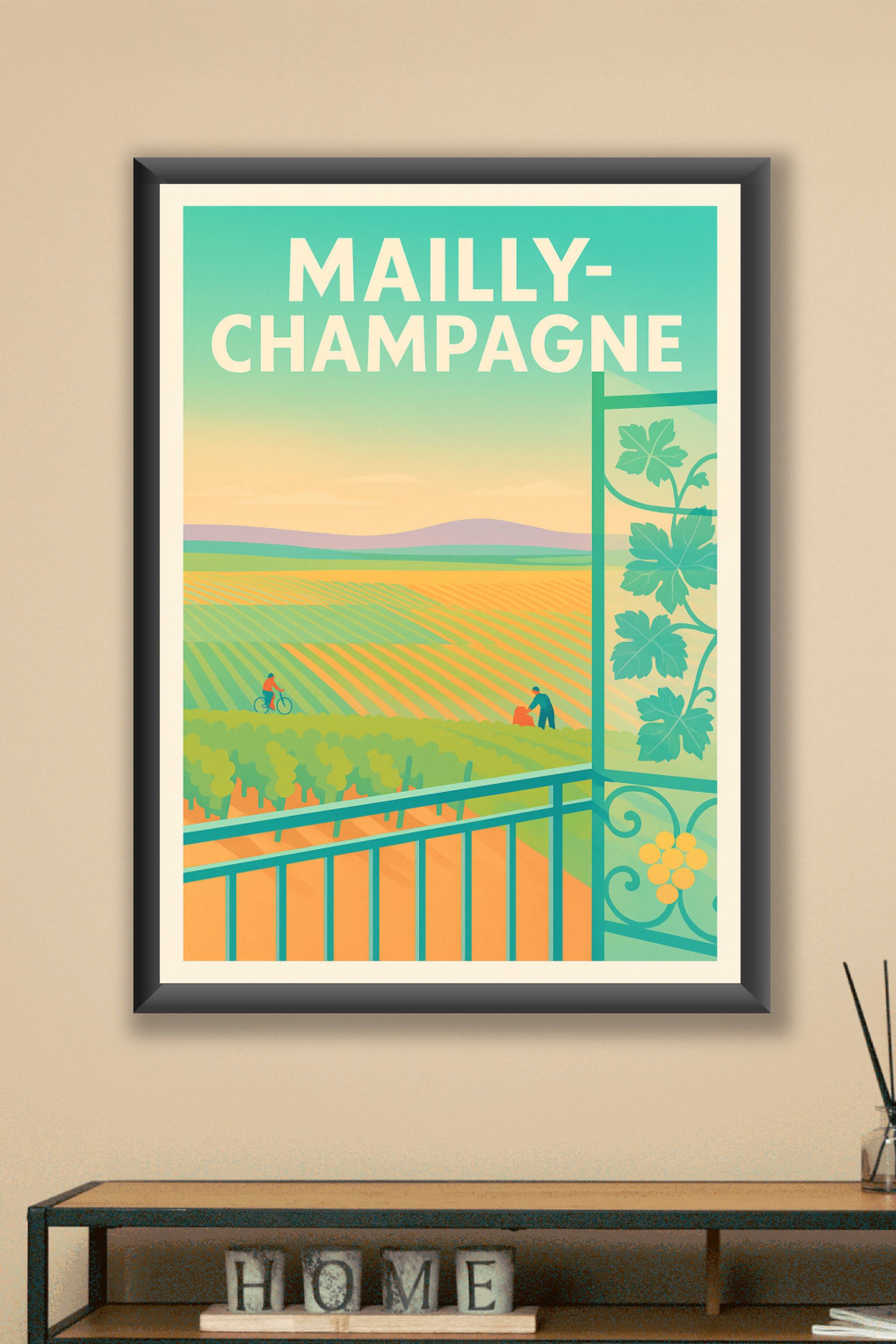 Découvrez la douceur de vivre de Mailly-Champagne à travers cette affiche qui capture l'harmonie des vastes vignobles et la quiétude des paysages c...