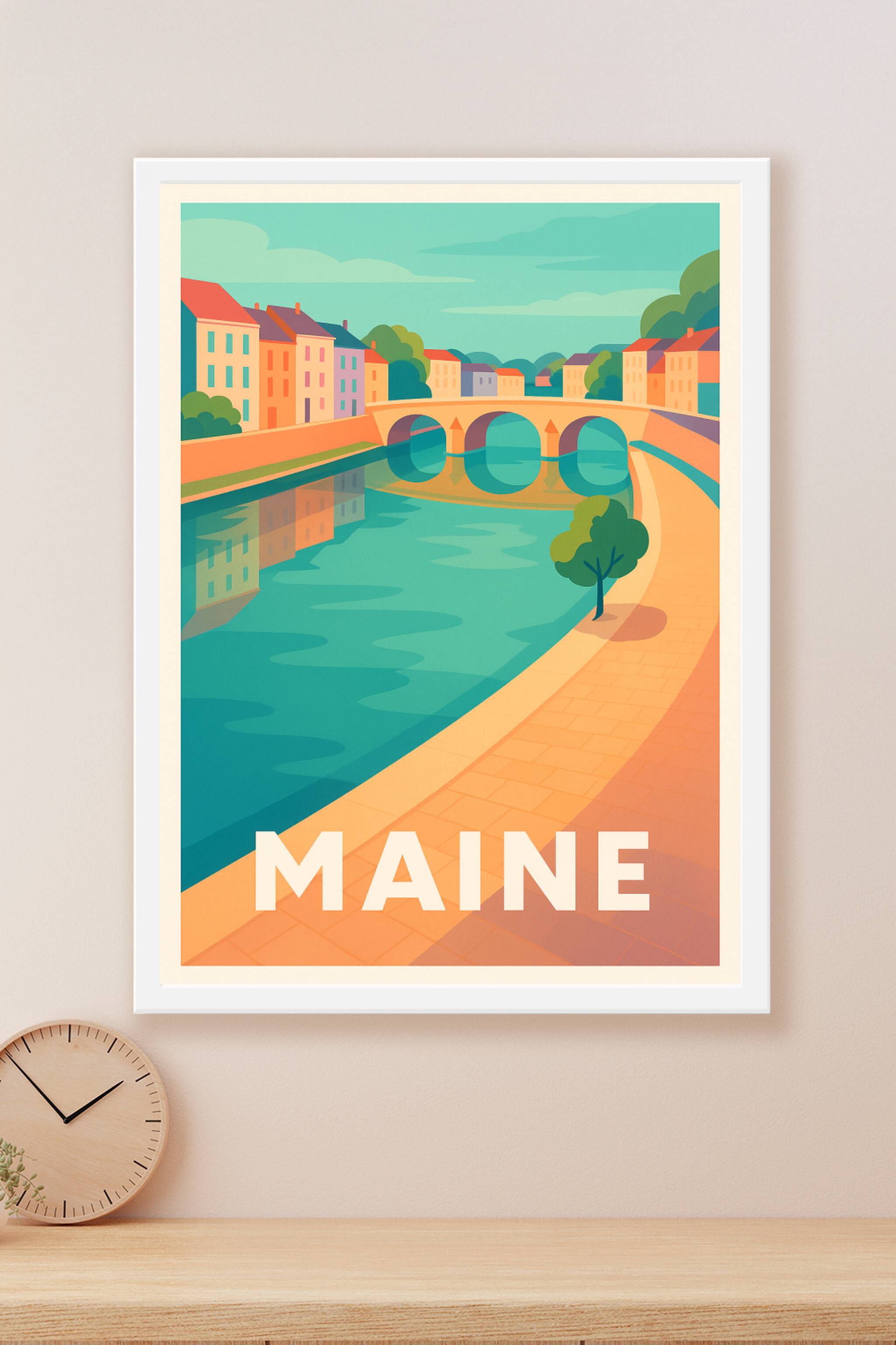 Découvrez la douceur de vivre de Maine à travers cet affiché illustré aux couleurs pastel et au style graphique épuré. Ce poster met en scène un pont ancien et ses maisons colorées qui se reflètent paisiblement dans l'eau, invitant à la rêverie et à la sérénité.Cette affiche est imprimée en tirage "Fine Art" sur un papier 305g coton, garantissant une qualité d'impression et une durabilité supérieures. Disponible en plusieurs formats A1 à A4, avec ou sans cadre, elle s'adapte à tous les espaces pour une décoration élégante et raffinée. Offrez-vous ou à vos proches ce poster de qualité premium, fabriqué en France, pour revivre l'atmosphère unique de Maine chez vous.