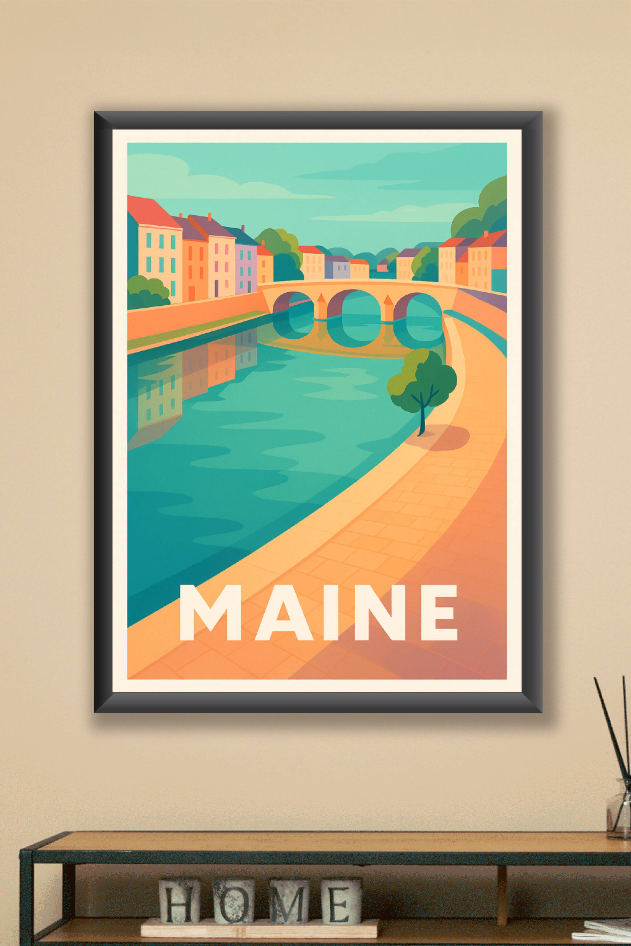 Découvrez la douceur de vivre de Maine à travers cet affiché illustré aux couleurs pastel et au style graphique épuré. Ce poster met en scène un po...