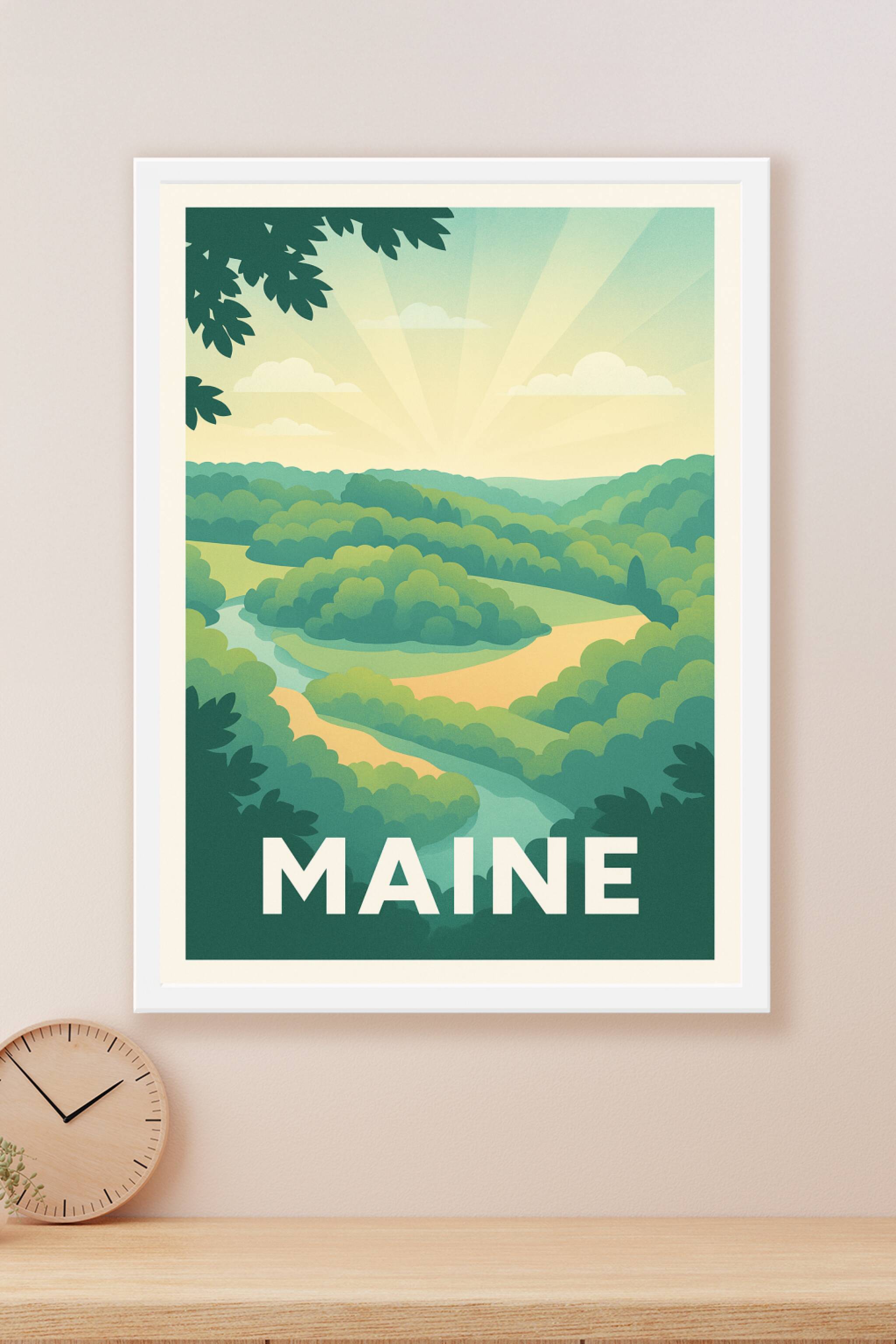 Découvrez la sérénité et la beauté naturelle du Maine avec cette affiche illustrée mettant en scène ses collines verdoyantes et ses rivières sinueu...