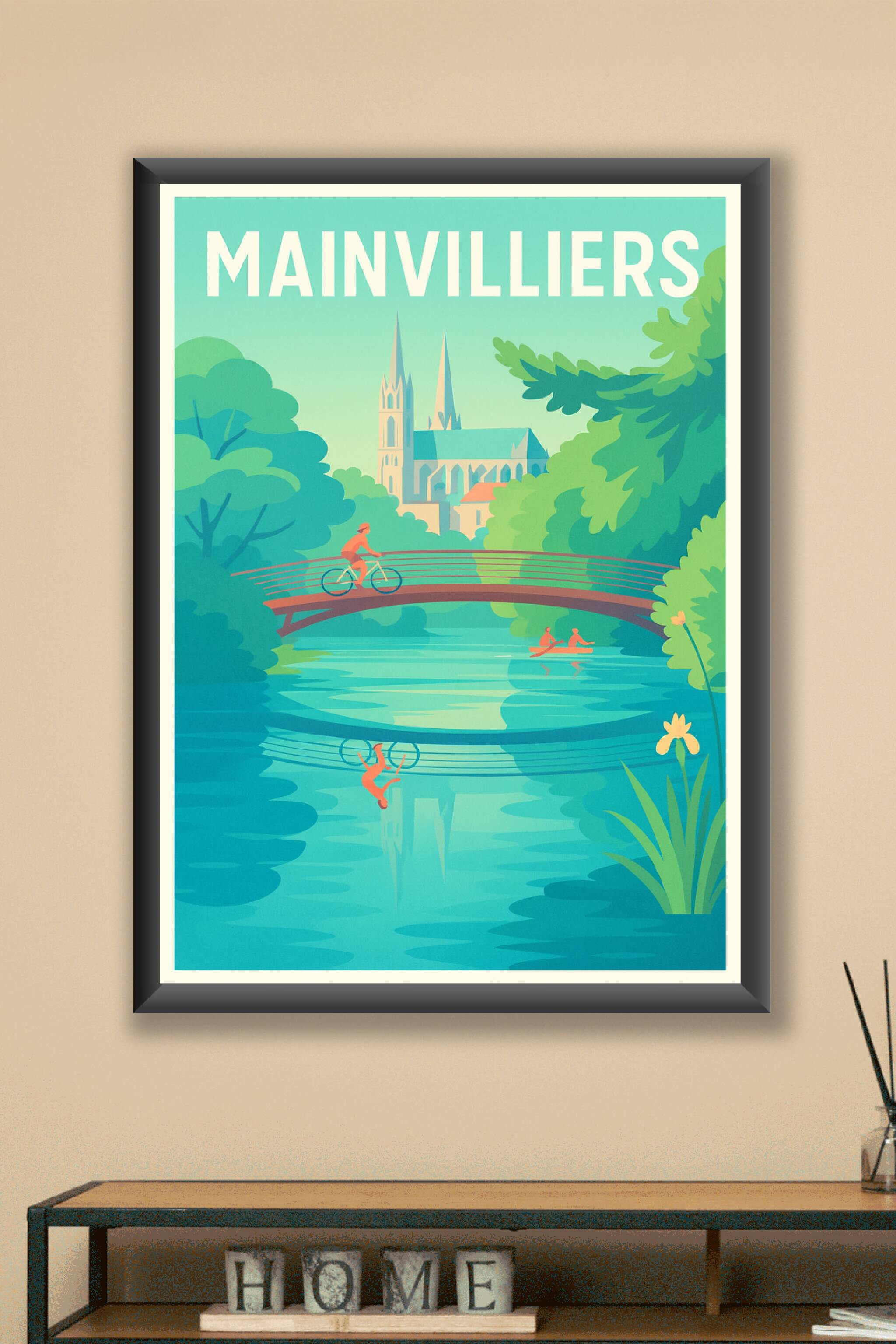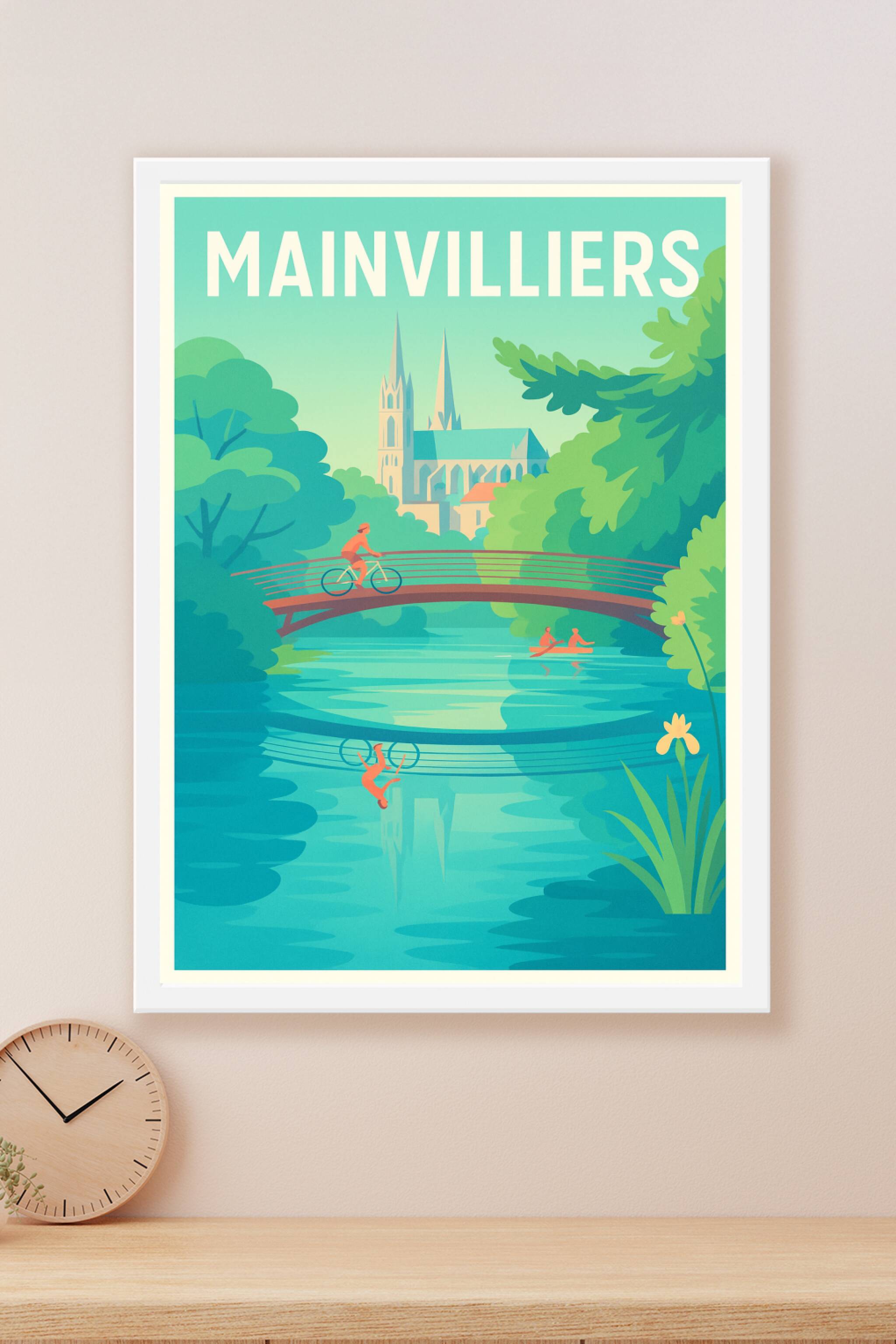 Découvrez la douceur de vivre à Mainvilliers avec cette affiche au style épuré et lumineux. Le poster met en scène une balade à vélo sur un pont su...