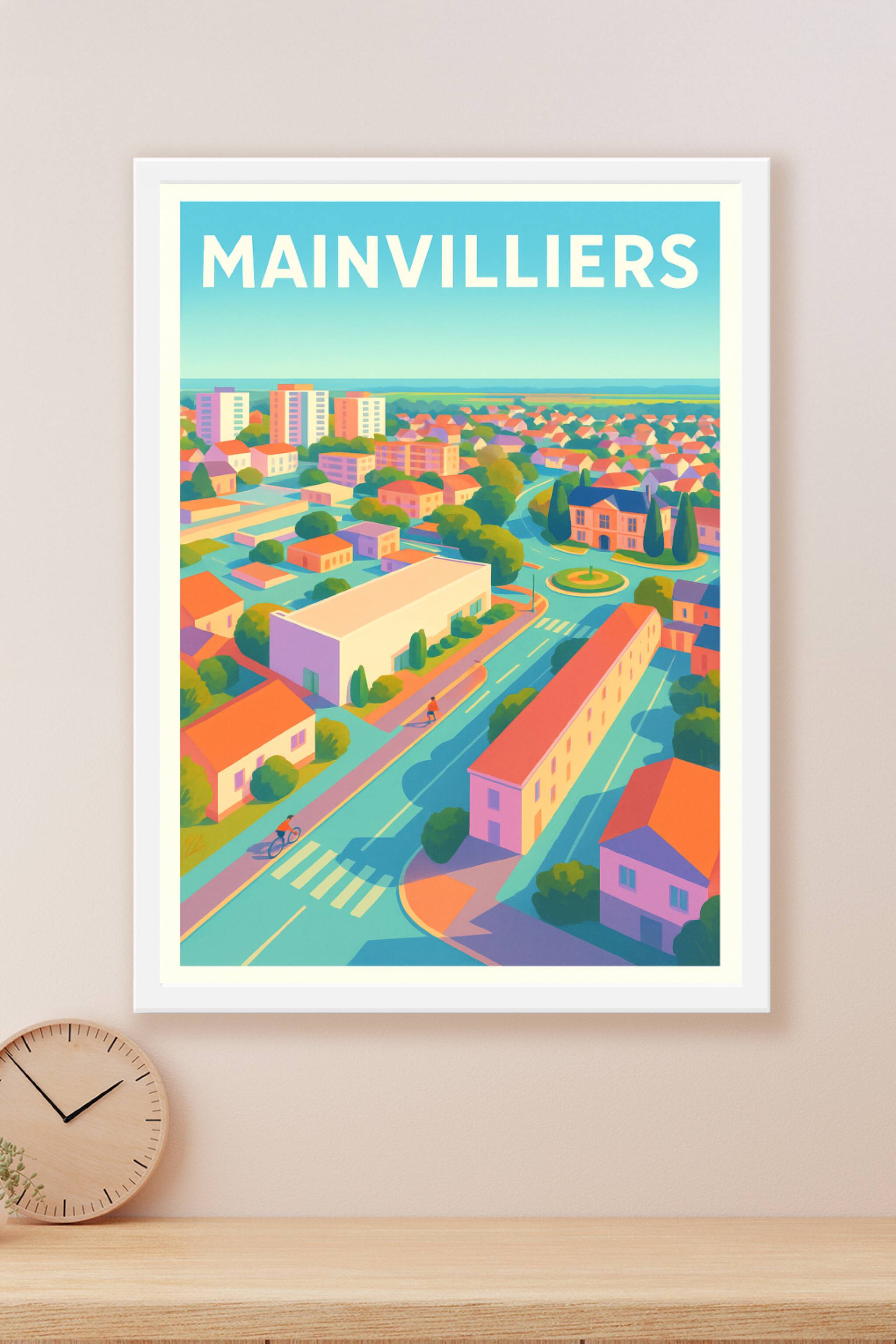 Découvrez Mainvilliers sous un angle vibrant et apaisant grâce à cette affiche illustrée en couleurs pastel. Ce poster capture avec finesse l'archi...