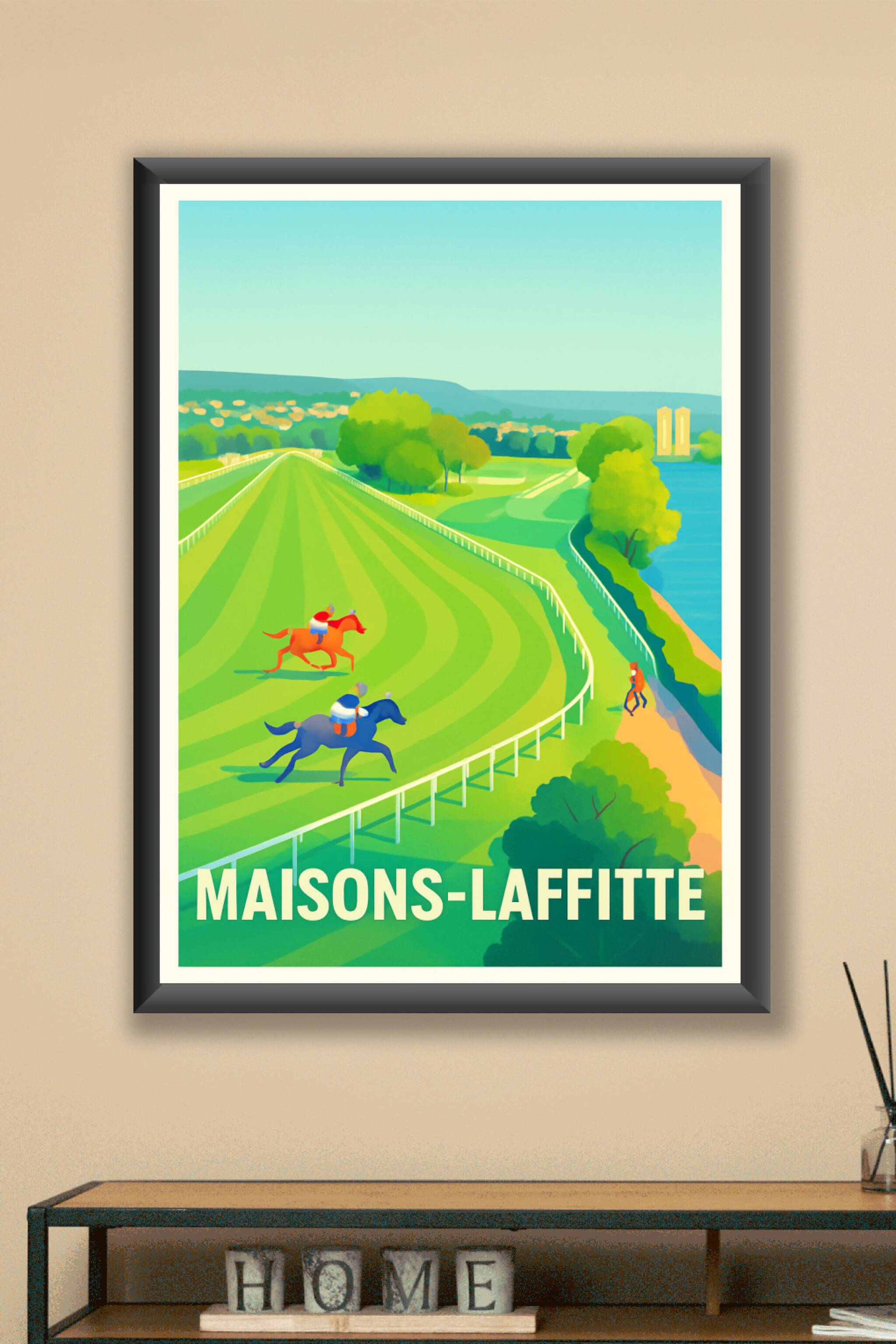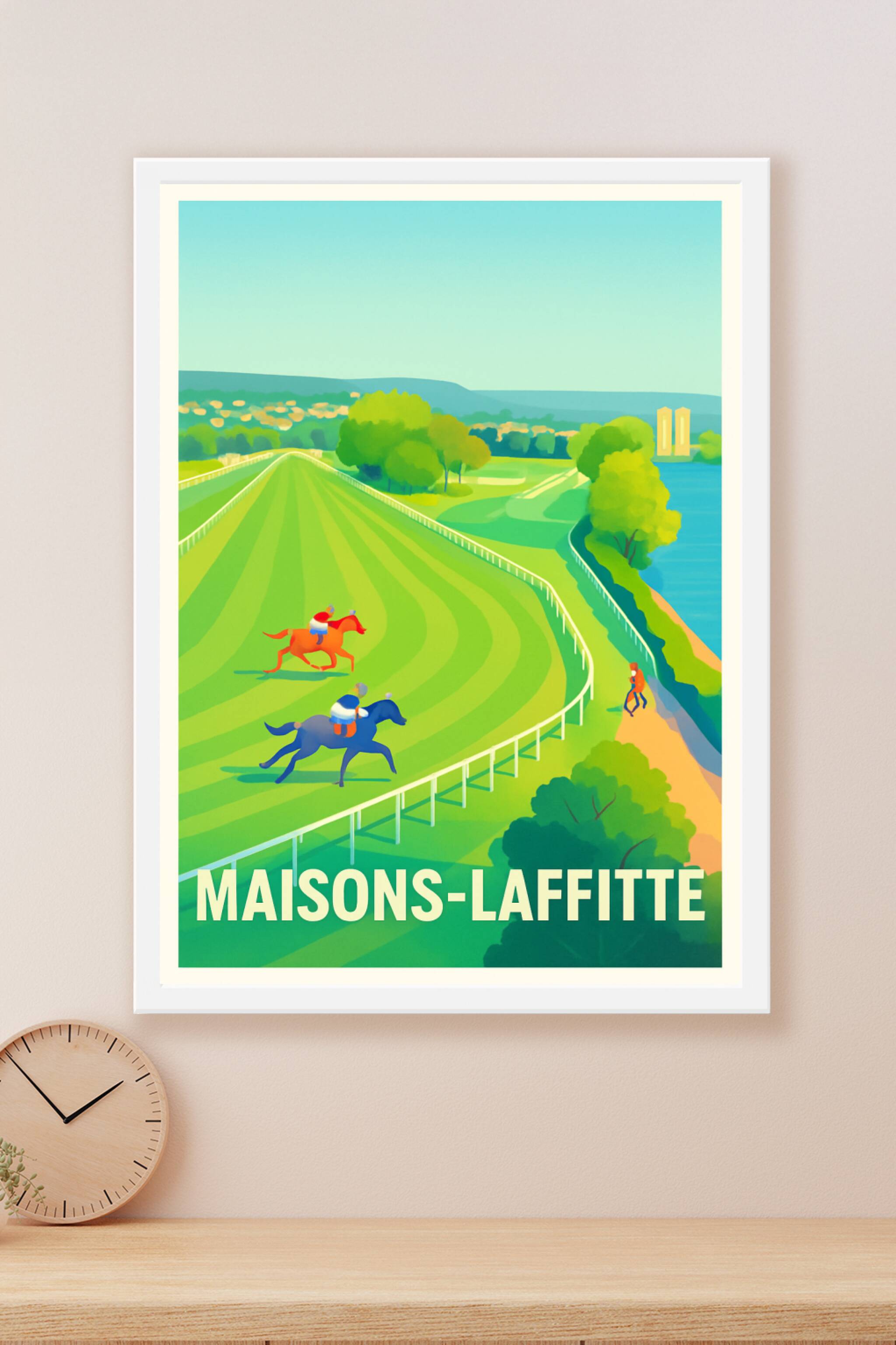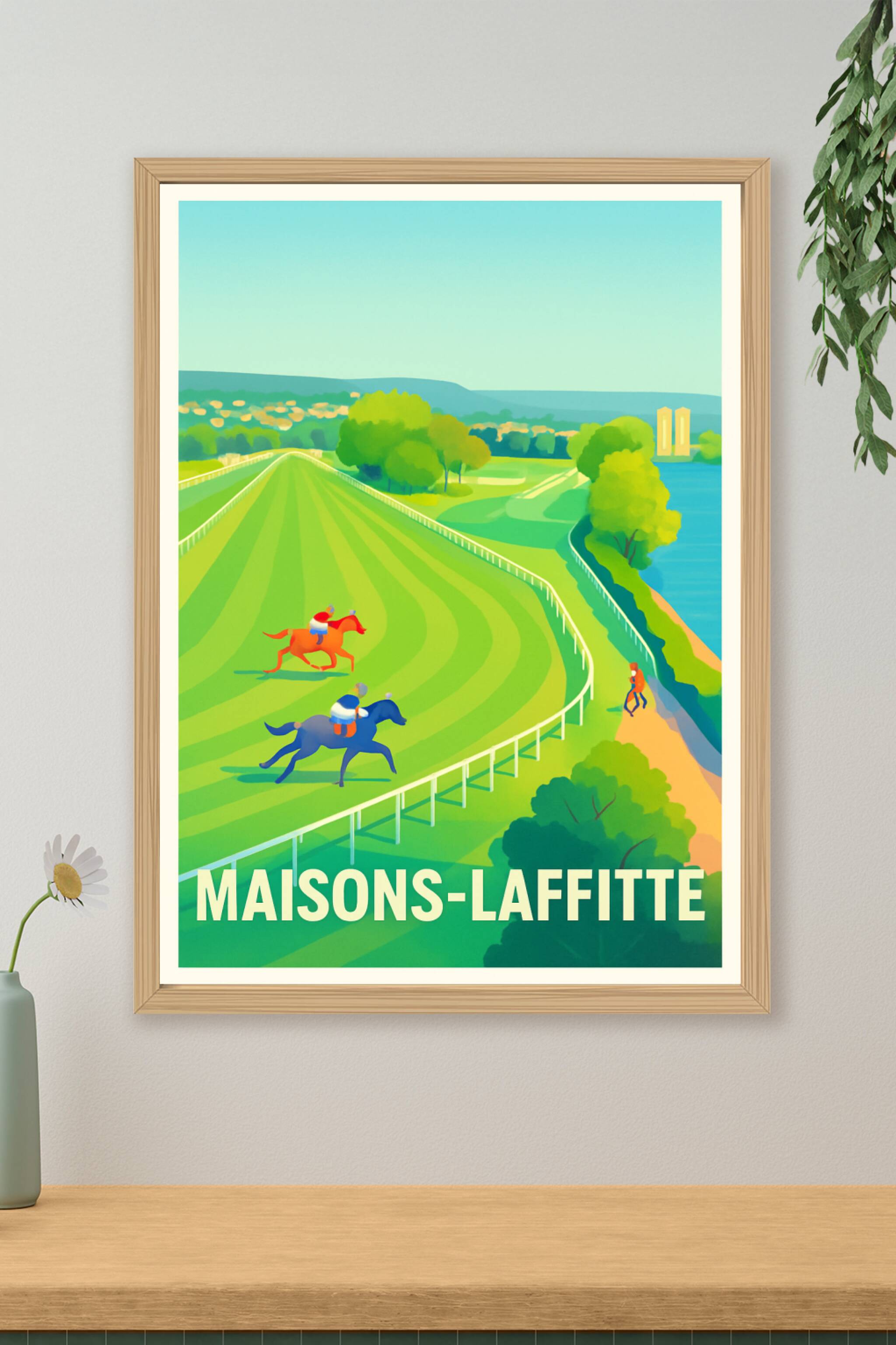 Découvrez le charme unique de Maisons-Laffitte, ville réputée pour son hippodrome et son histoire équestre, avec cette affiche au style lumineux et...