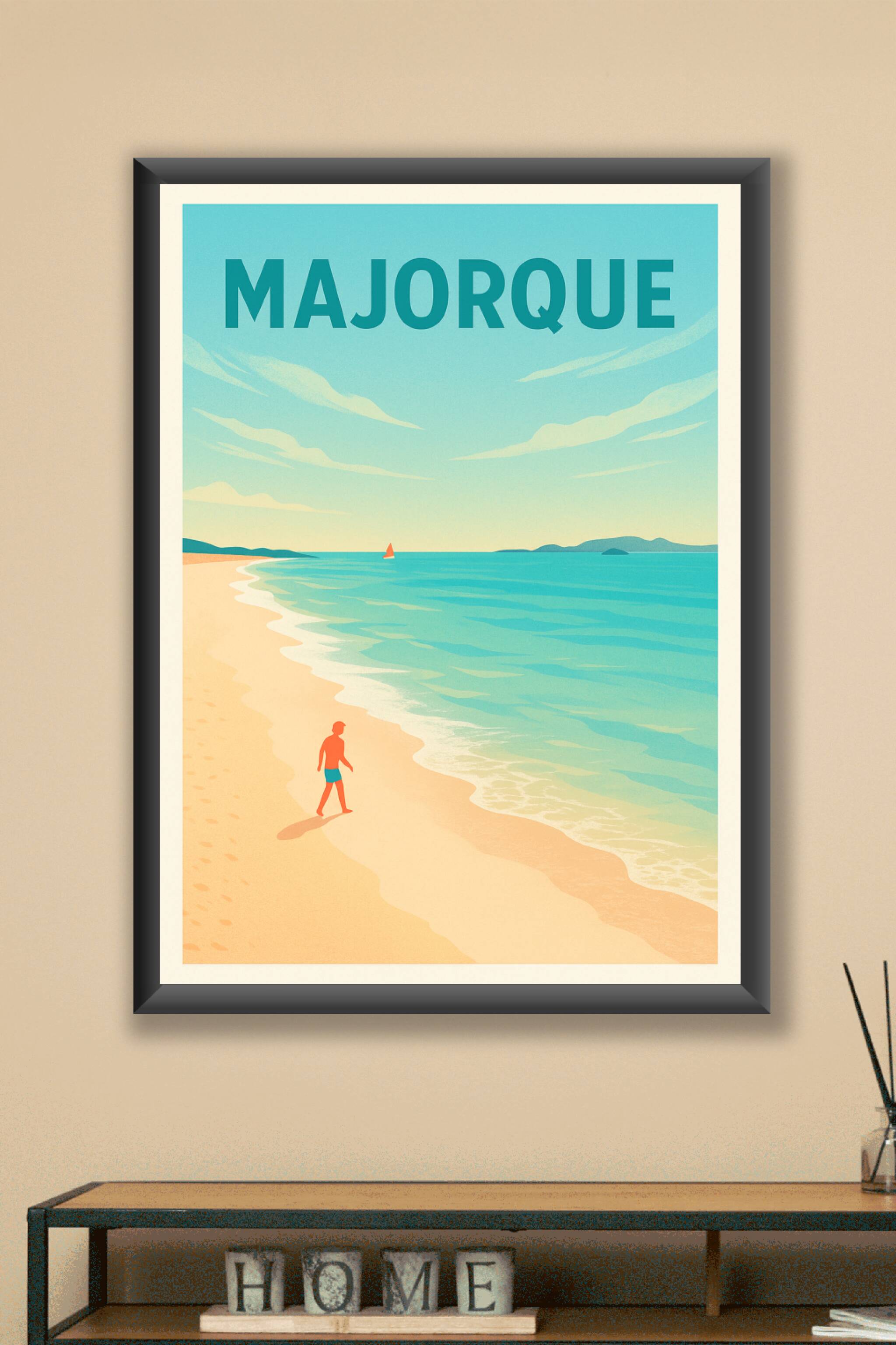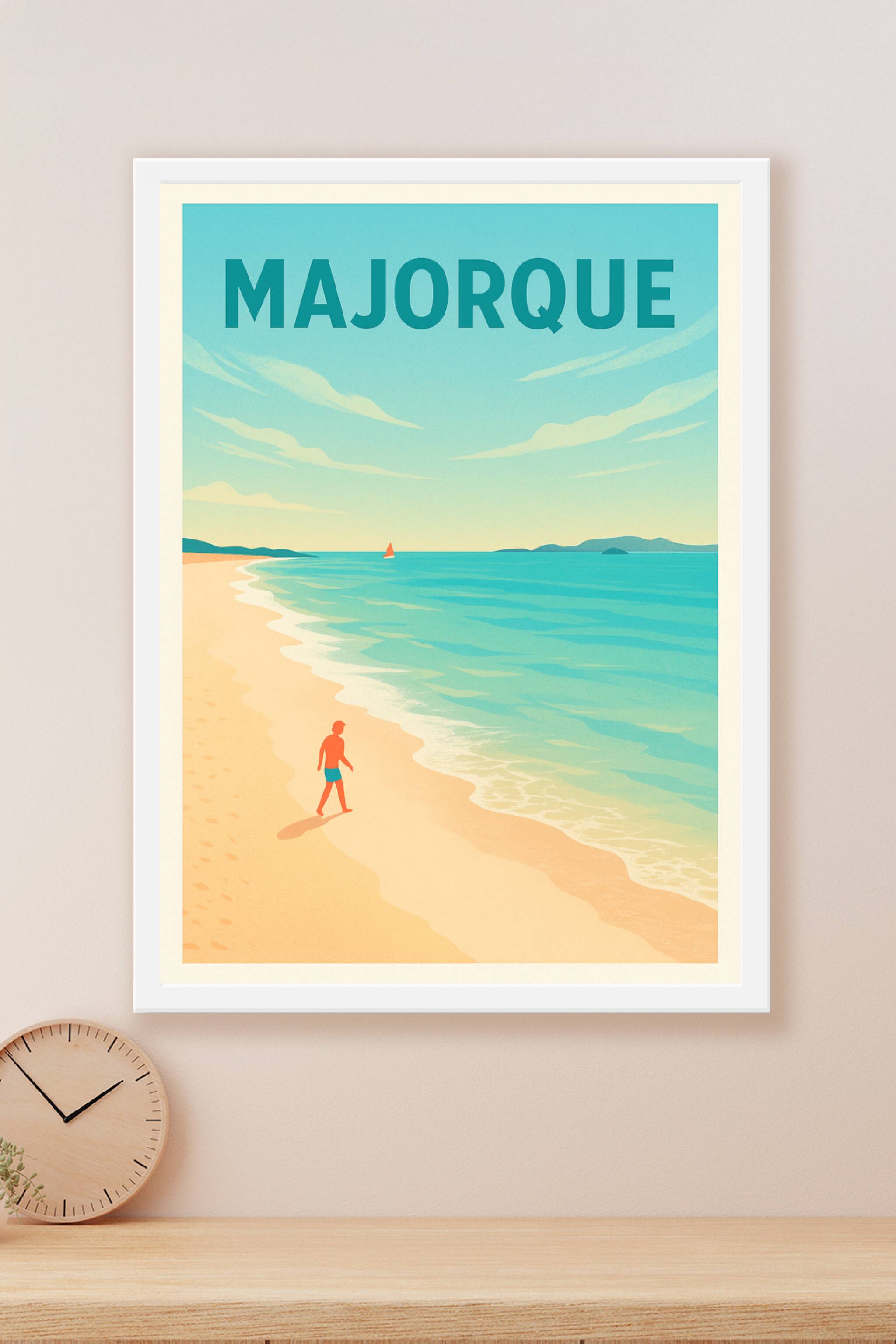 Découvrez la beauté apaisante de Majorque avec cette affiche illustrée d'une plage baignée par une mer turquoise et un ciel ensoleillé. Le poster c...
