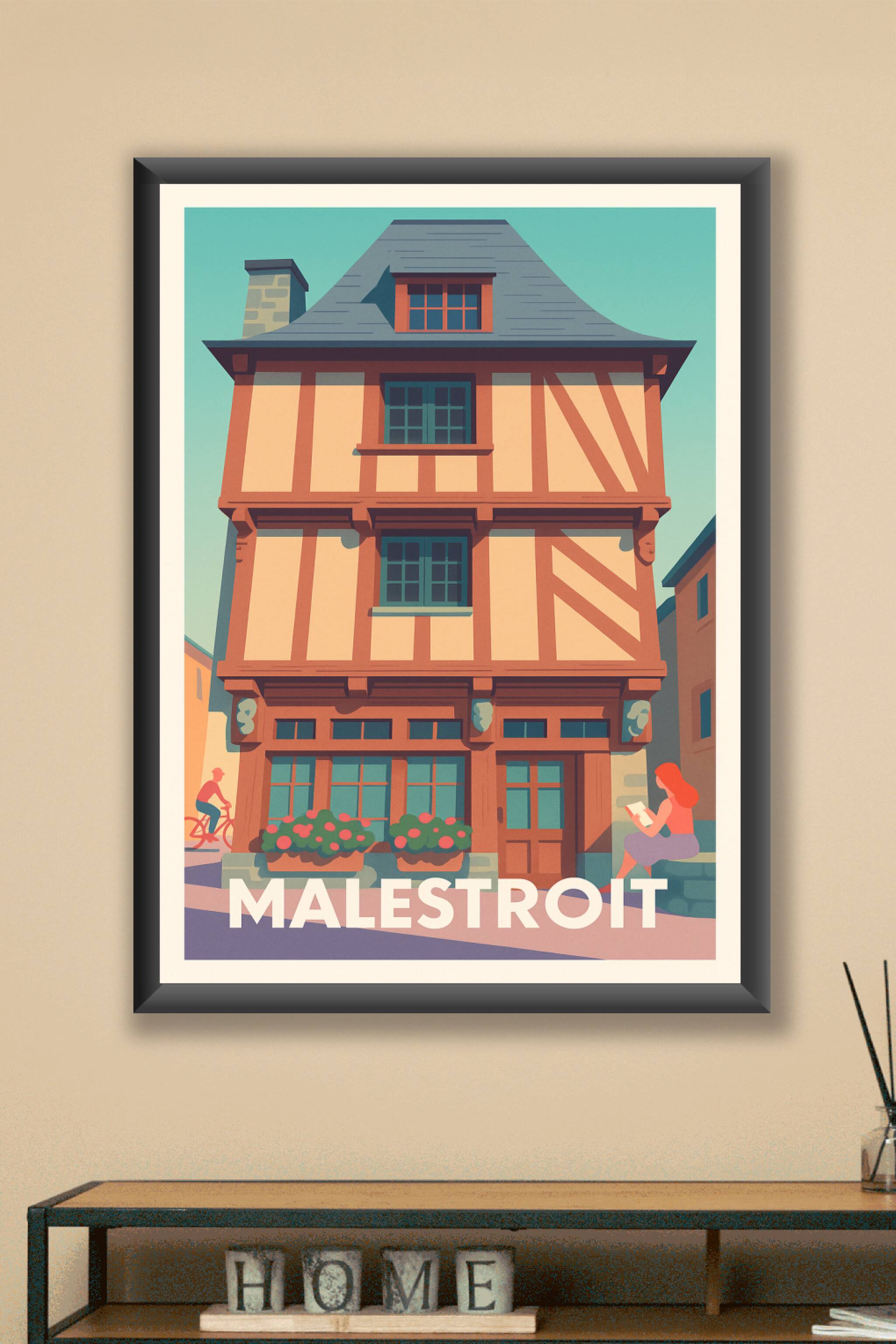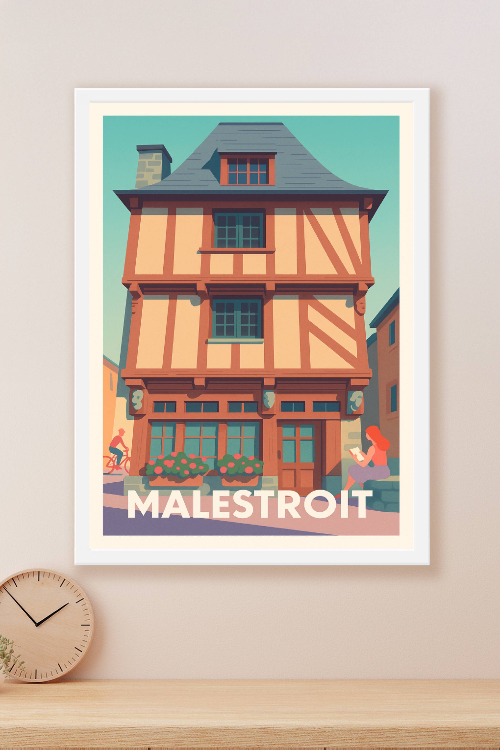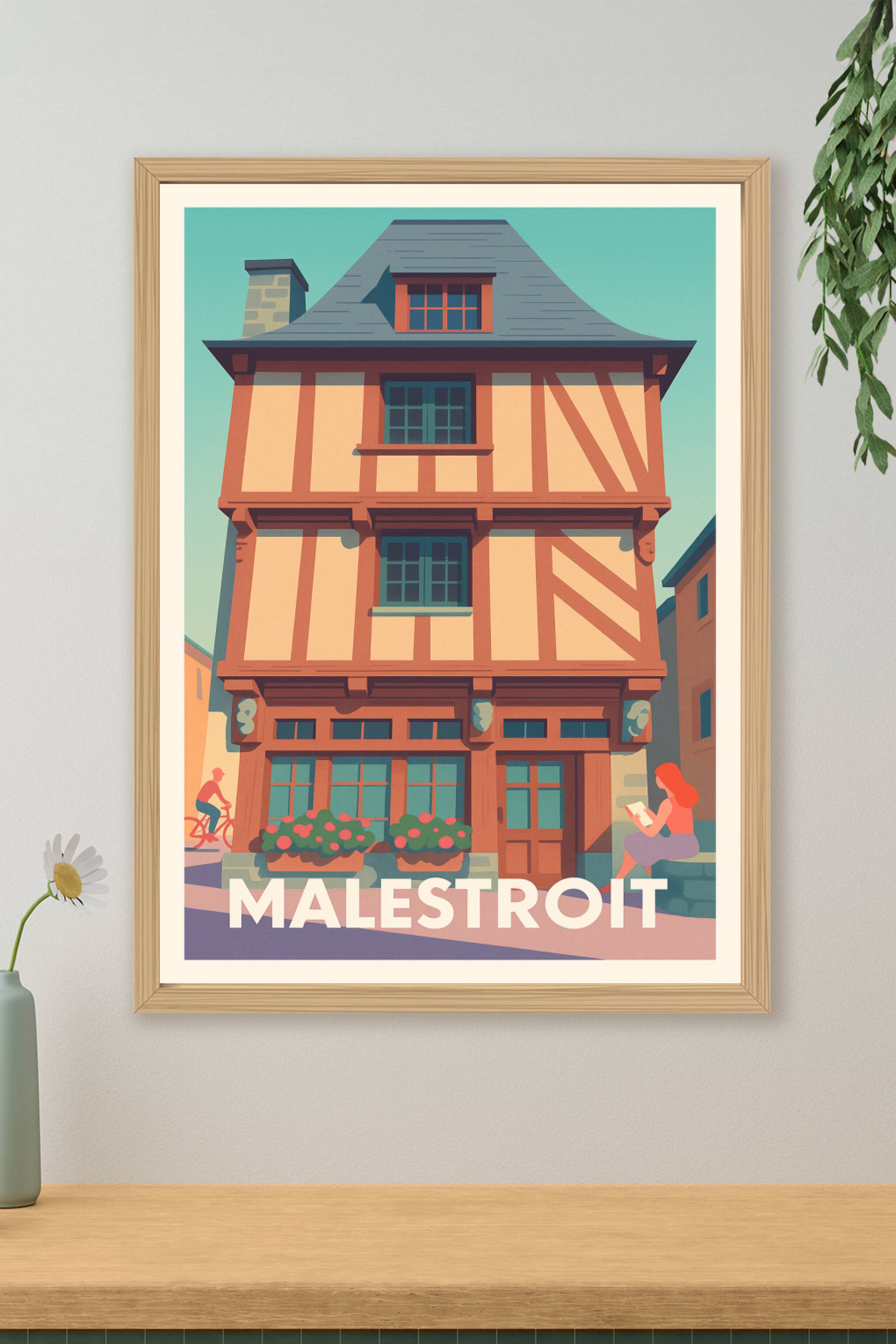 Découvrez le charme intemporel de Malestroit avec cette affiche illustrée mettant en avant une maison à colombages typique de la Bretagne. Dans un ...