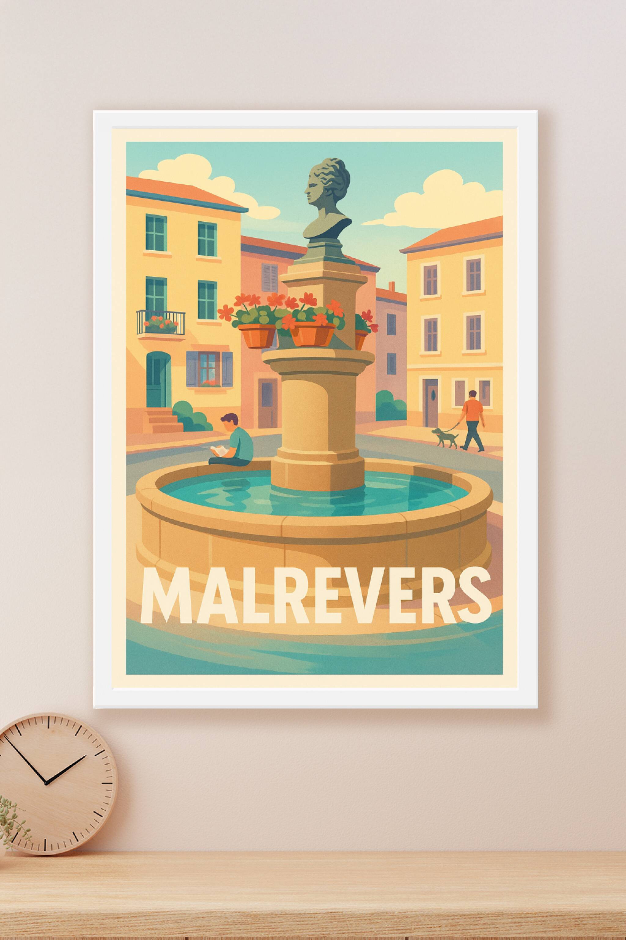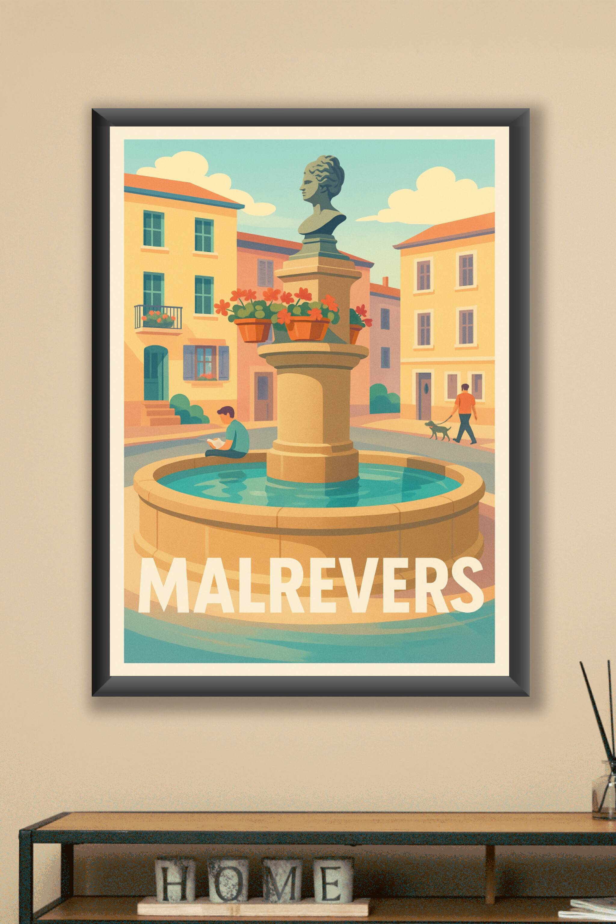 Découvrez l'atmosphère paisible et conviviale de Malrevers avec cette affiche illustrée, mettant en scène une place de village typique où trône une...