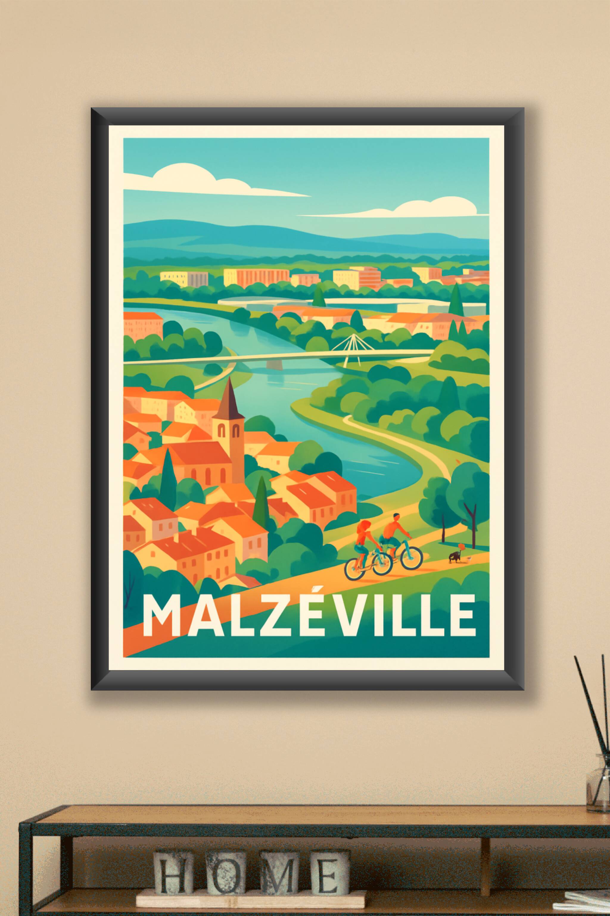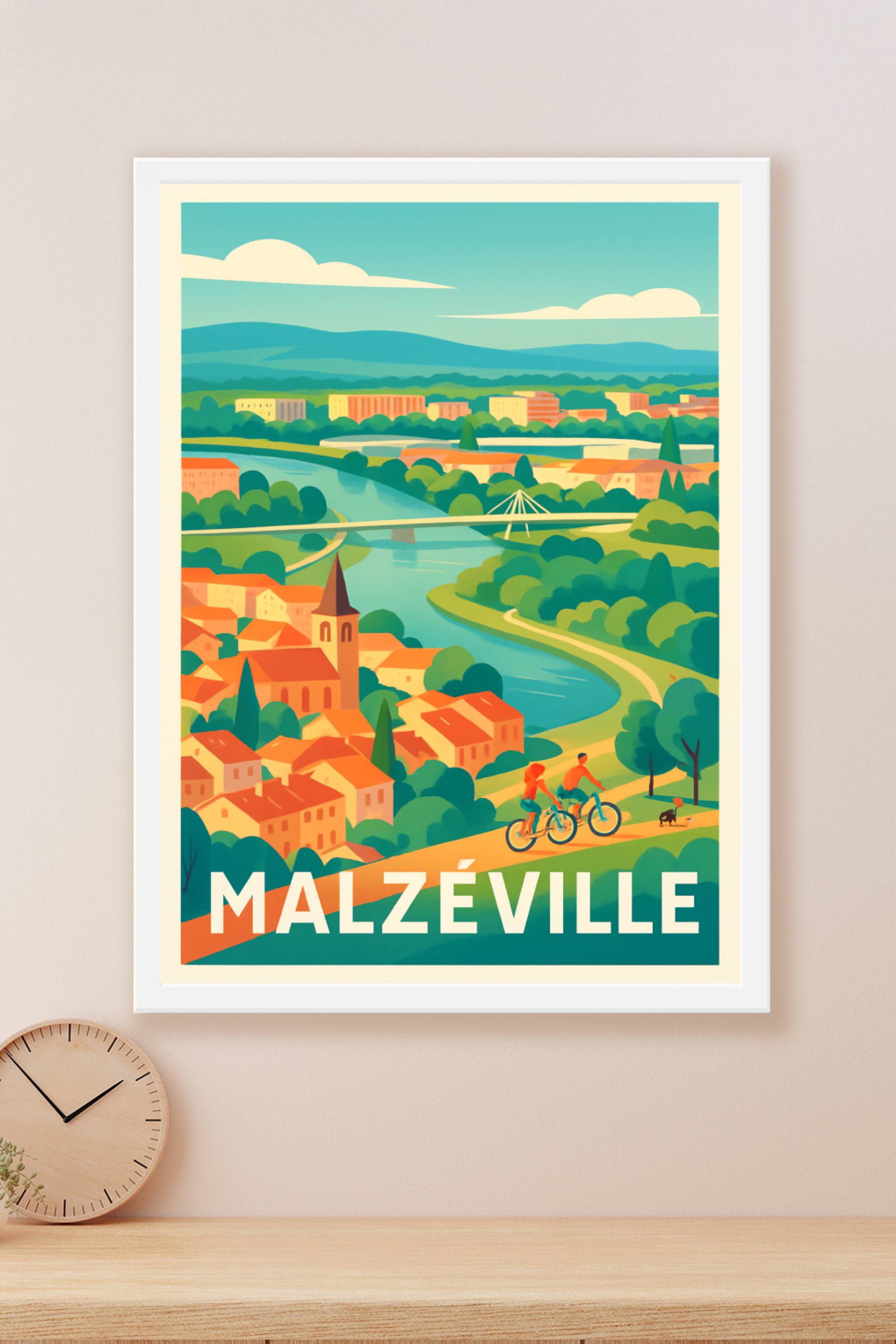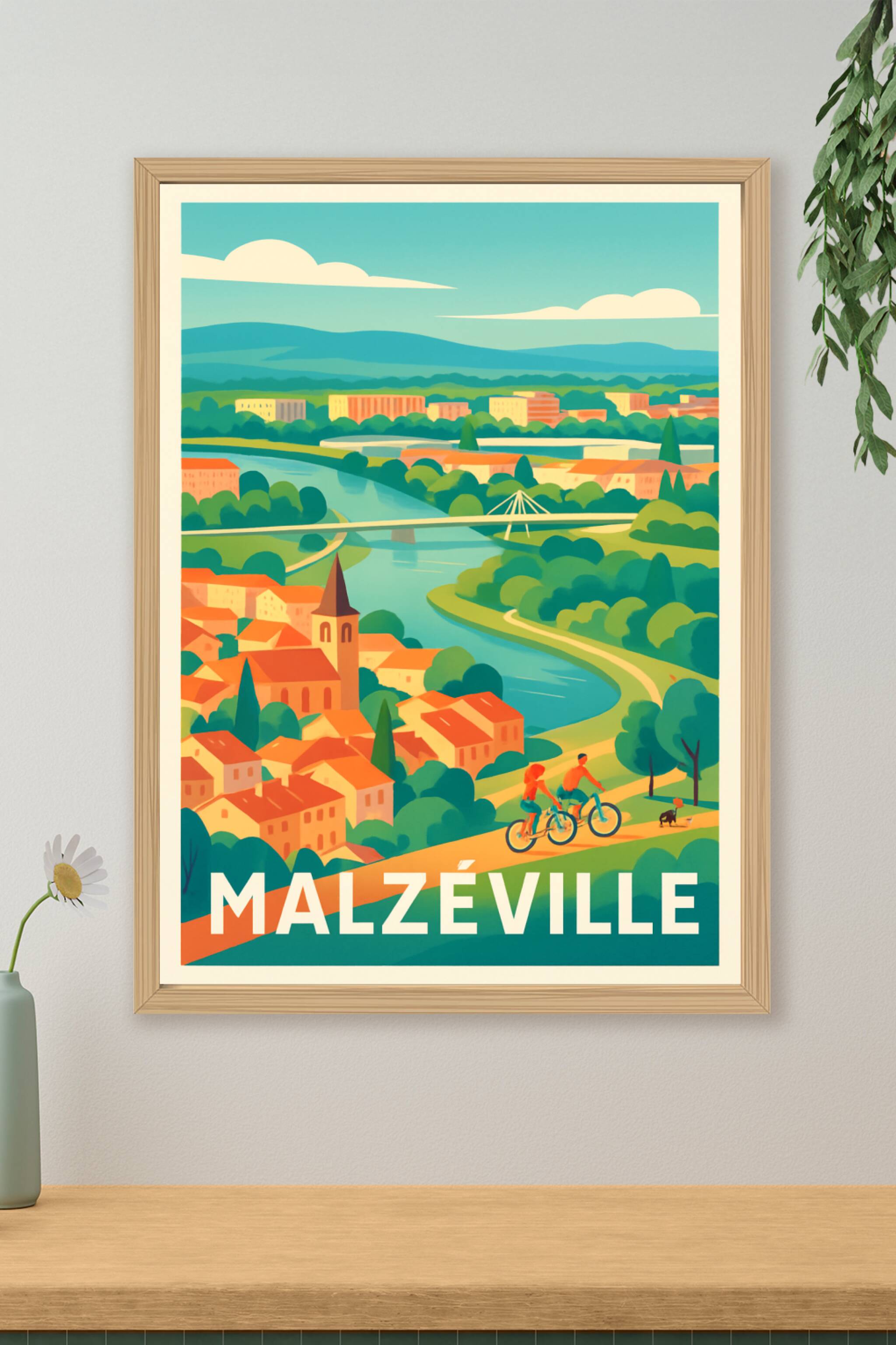 Découvrez l'ambiance paisible et verdoyante de Malzéville avec cette superbe affiche illustrée qui met en scène la douceur de vivre au bord de la M...