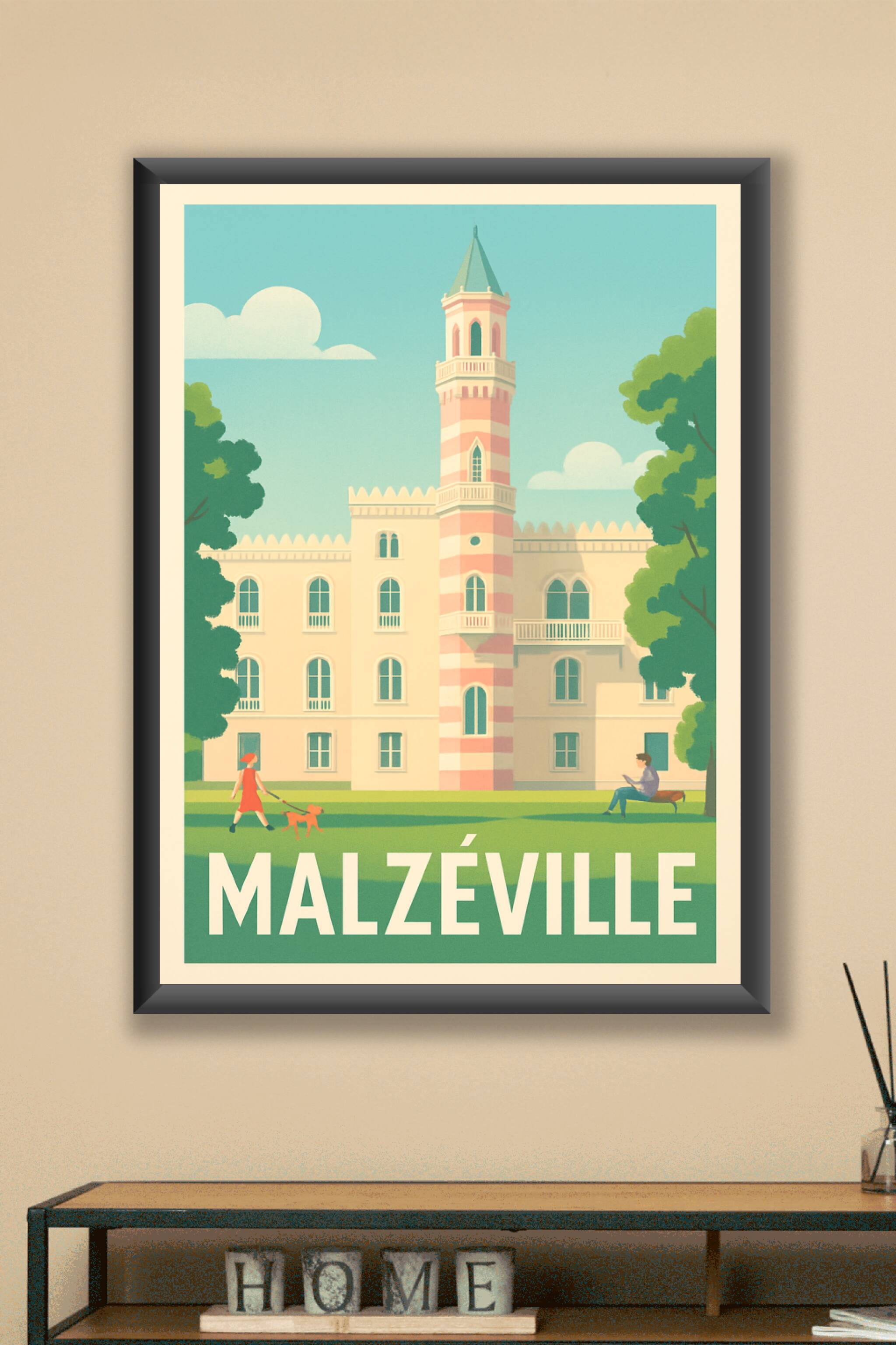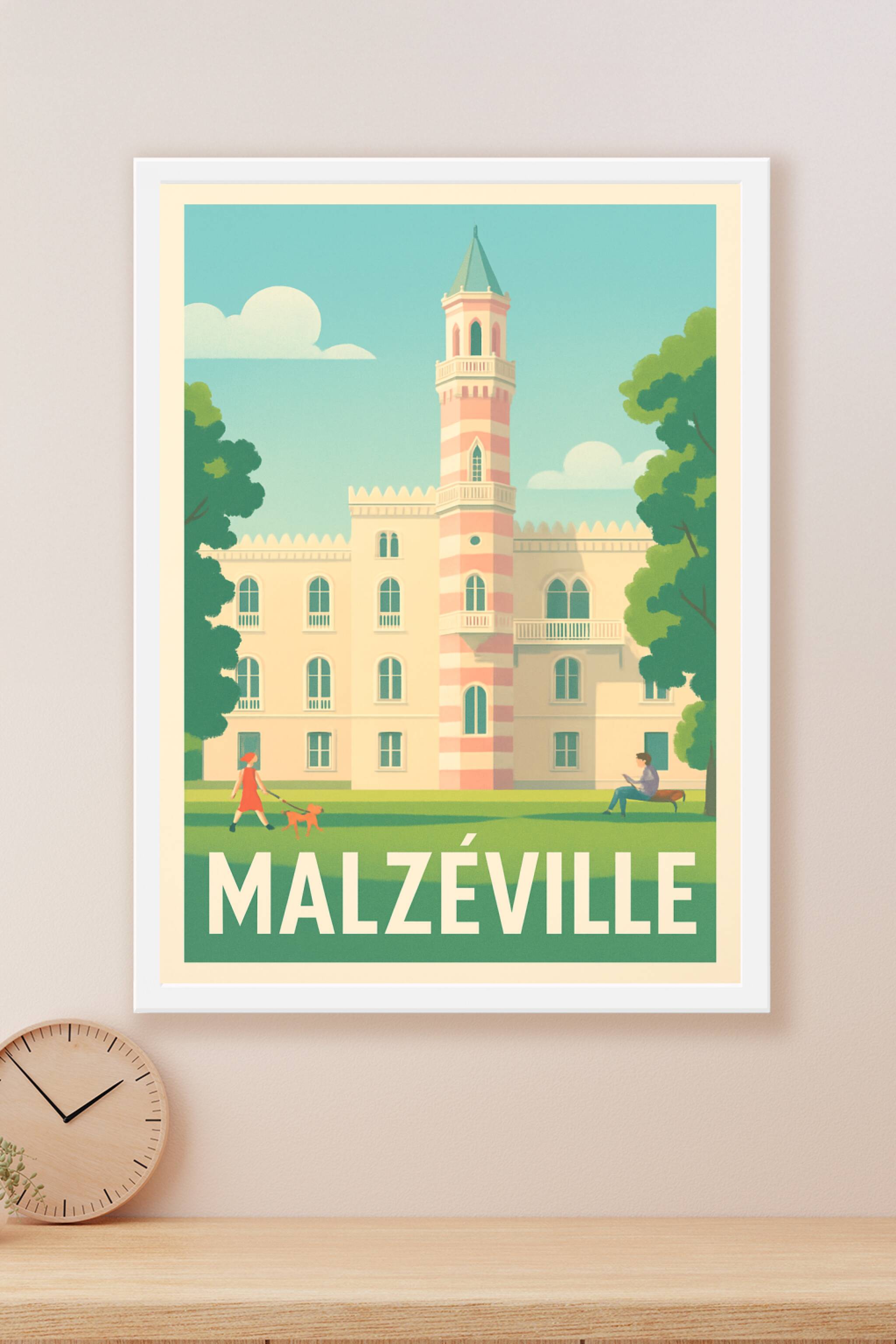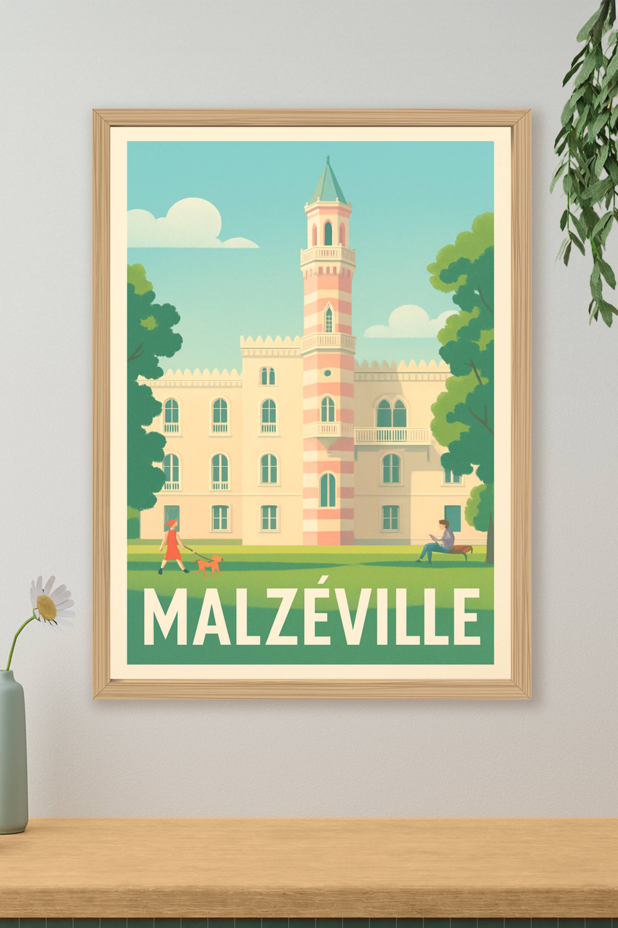 Découvrez l'élégance et la quiétude de Malzéville avec cette affiche illustrée mettant en valeur un monument emblématique entouré de verdure apaisa...
